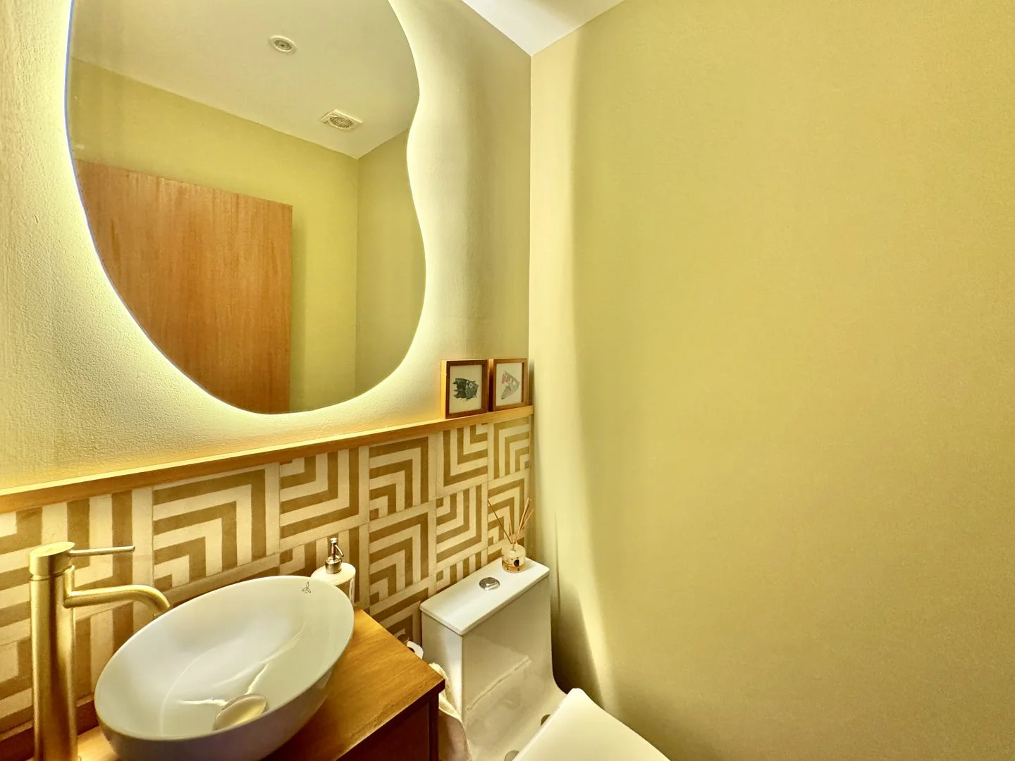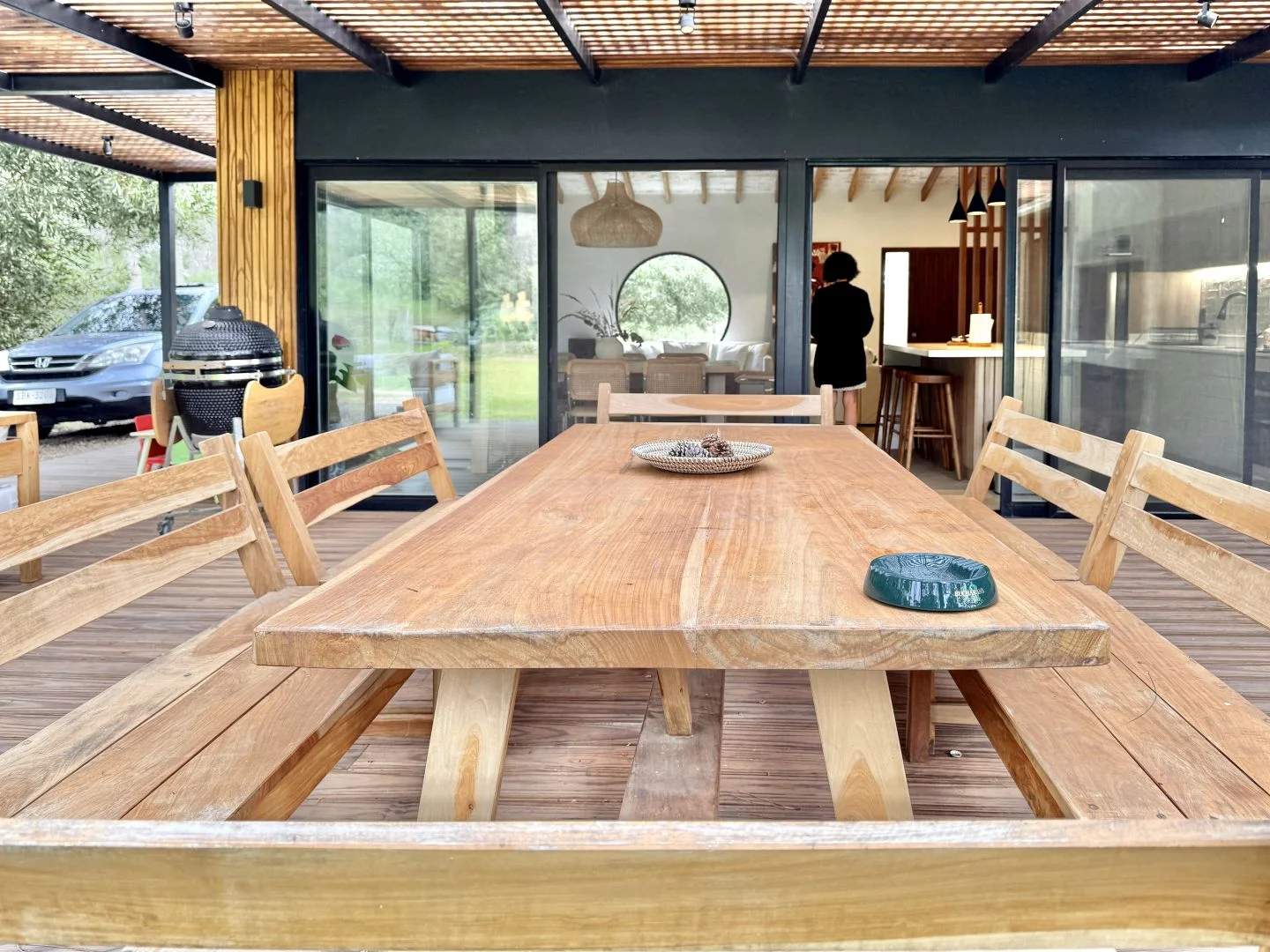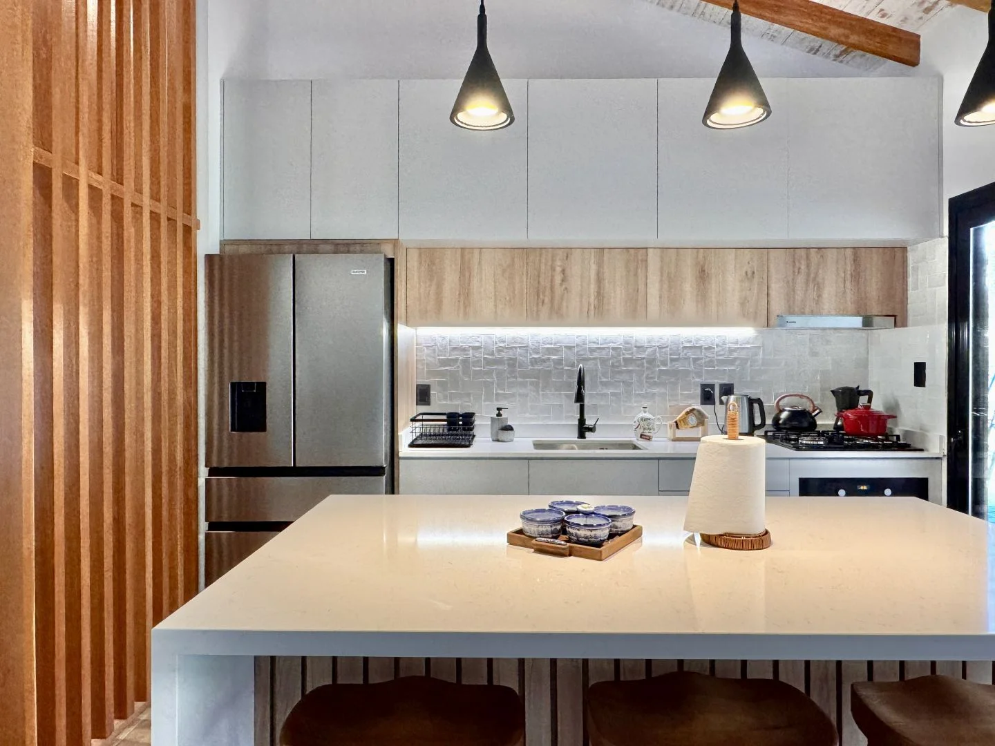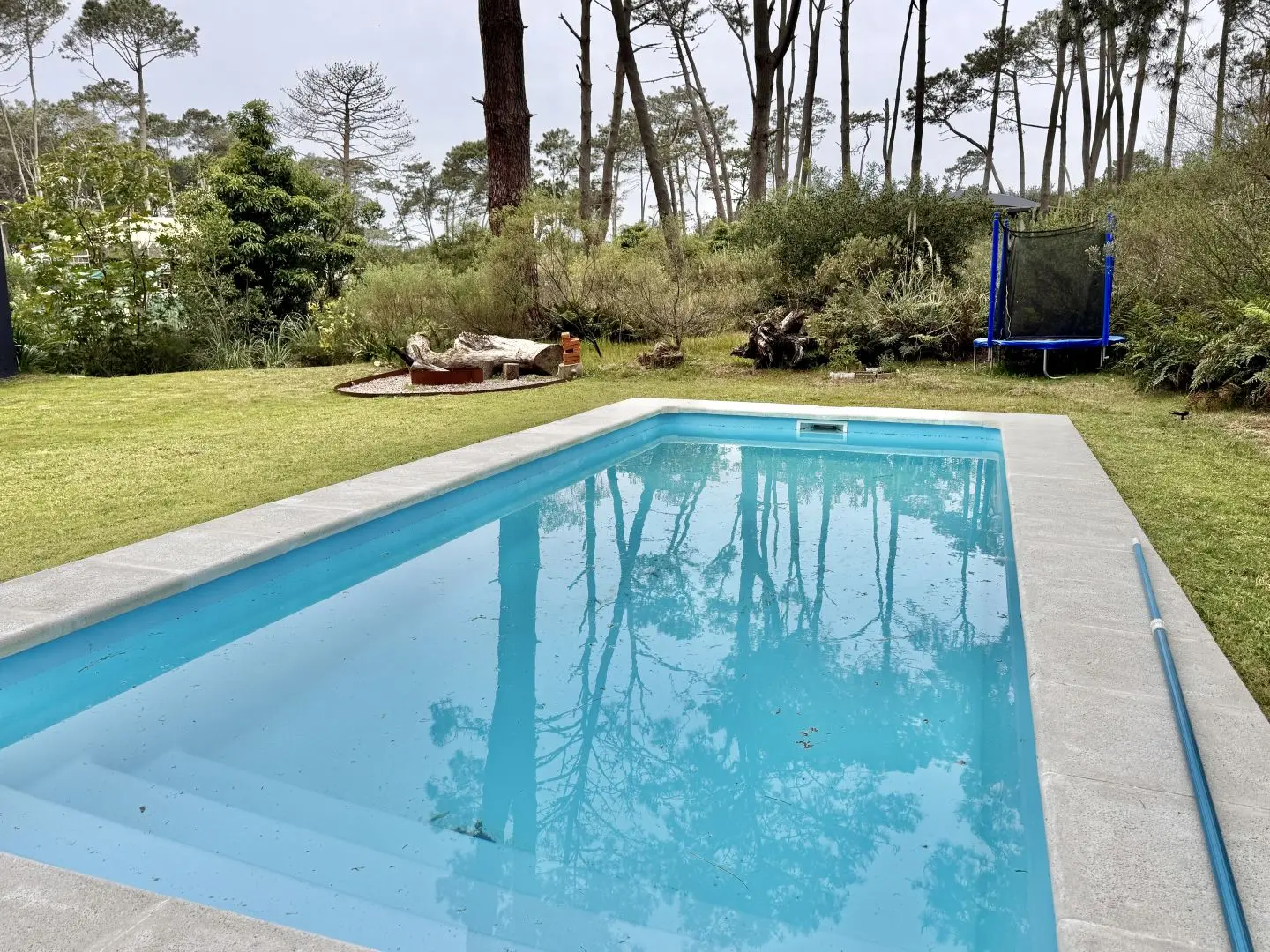 Living comedor con cocina integrada y salida a la galeria con su parrillero. Acogedor jardin con piscina.