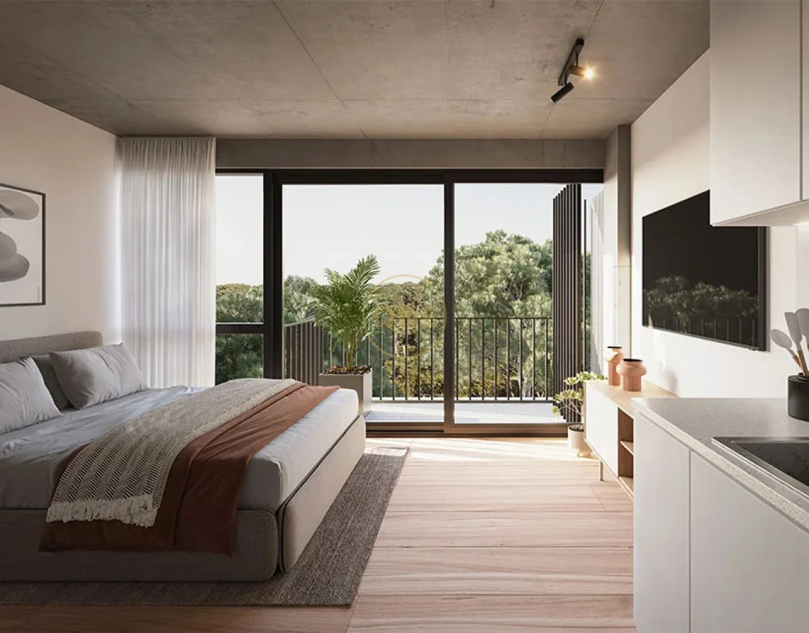 Apartamentos proyectados bajo un concepto de Lujo Eficiente, combinando materiales nobles con una distribución inteligente.Detalles de Terminación:Pisos: Hormigón afinado en sala, comedor y dormitorios, aportando un toque industrial moderno y de fácil mantenimiento.Aberturas: Carpintería de excelente calidad con vidrios DVH (Doble Vidriado Hermético) para un aislamiento térmico y acústico superior.Climatización: Preinstalación de aire acondicionado individual en todos los ambientes.Cocina Integrada: Equipamiento completo con anafe, horno, muebles aéreos y bajo mesada. Encimeras de cuarzo o granito y ventilación natural.Terrazas: Todas las unidades cuentan con terrazas cubiertas de entre 6 y 16 $m^2$, con distintas orientaciones según la unidad.