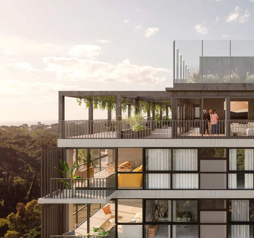 Torre de 11 pisos que destaca por su fachada de vidrio y líneas modernas, diseñada para maximizar la entrada de luz natural en cada rincón.Plaza de Acceso: Un entorno amigable con jardines diseñados y un café propio que integra el edificio a la vida de barrio.Vistas 360°: El remate de la torre ofrece una terraza mirador con pérgolas y jardines, brindando una panorámica única de Punta del Este.
