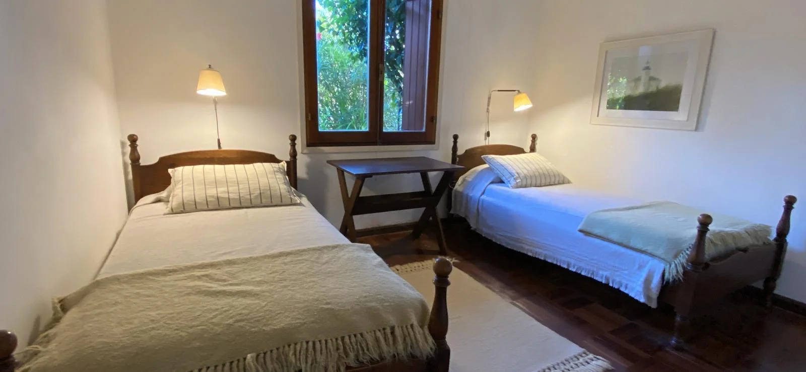 - Dos dormitorios dentro de la casa, cada uno con dos camas, y un dormitorio de servicio con baño completo.