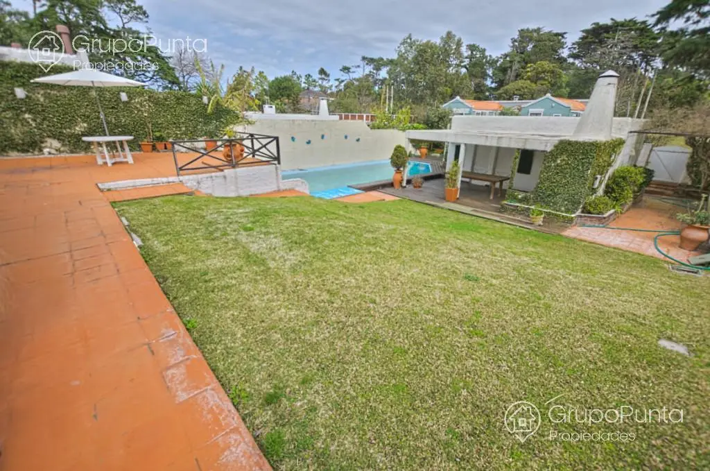 Generoso jardín con piscina y parrillero techado, estacionamiento para 4 autos.