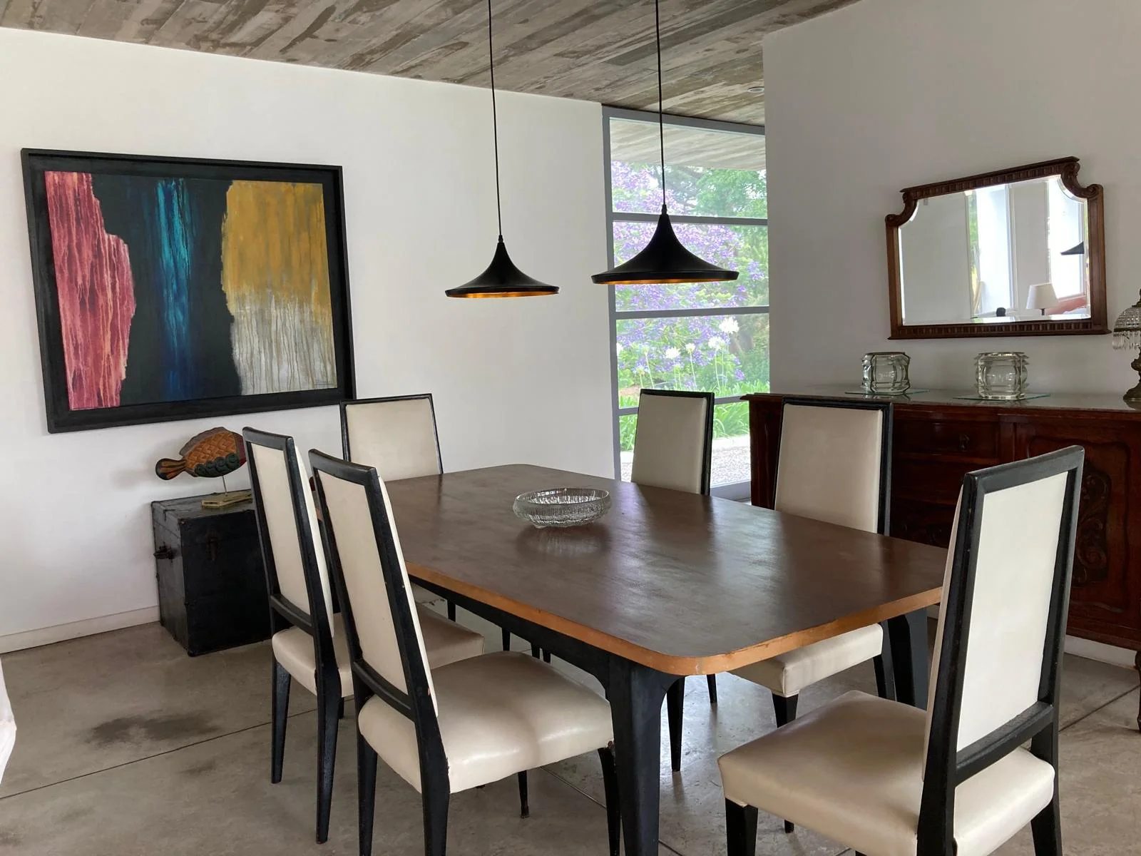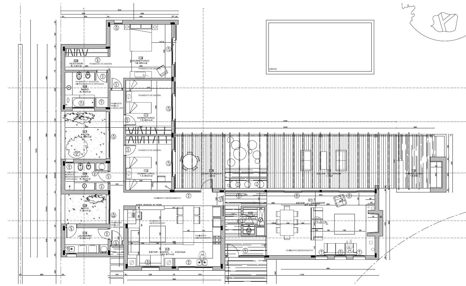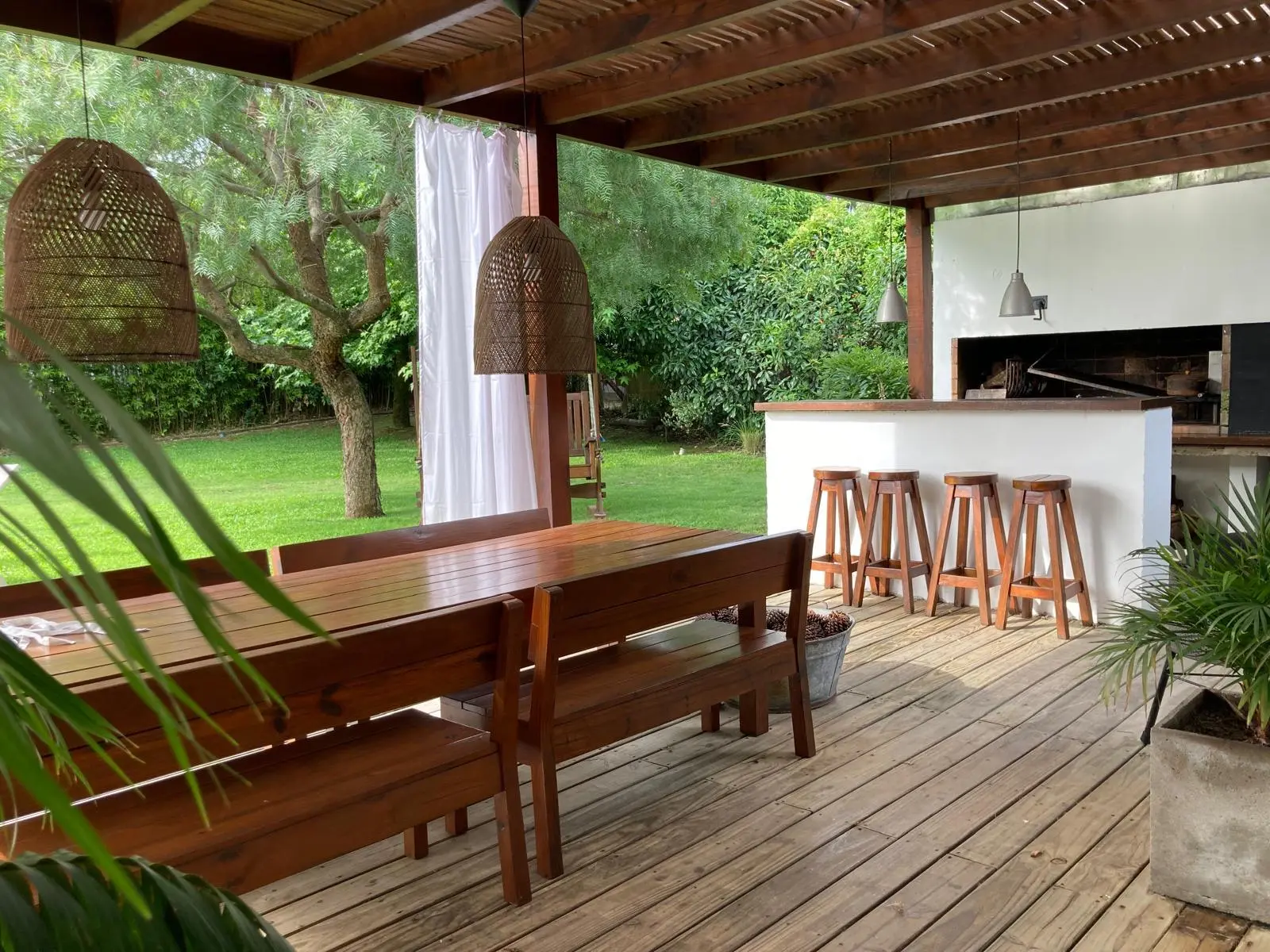 Implantada sobre un amplio terreno de 1.474 m², la casa ofrece 220 m² construidos, complementados por un deck y pérgola semicubierta de aproximadamente 90 m², logrando una armónica integración entre los espacios interiores y el jardín.