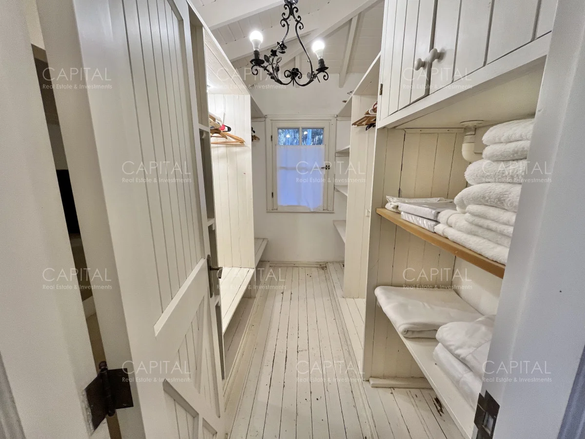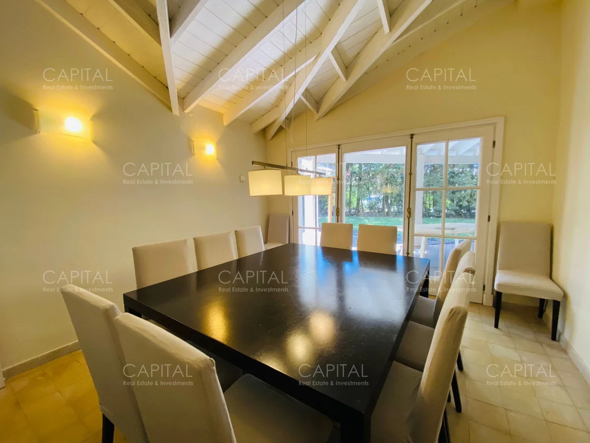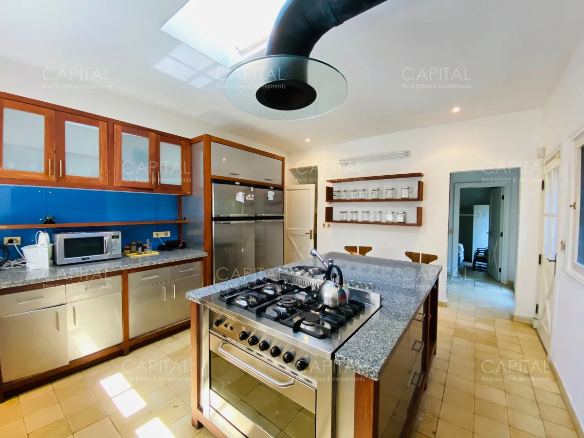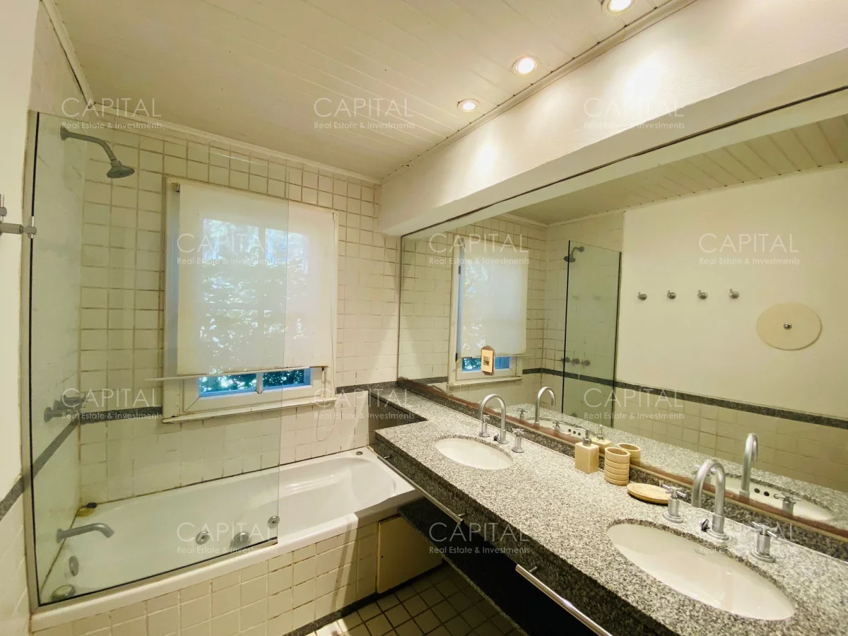 Planta alta: Desde el hall de entrada se accede a dos dormitorios en suite, uno de ellos con balcón al frente y el otro con estufa a leña. Un quinto dormitorio en suite puede utilizarse como dependencia de servicio. Además, la planta cuenta con un amplio playroom con terraza hacia el jardín, que se conecta internamente con la cocina, generando una excelente integración entre los espacios.