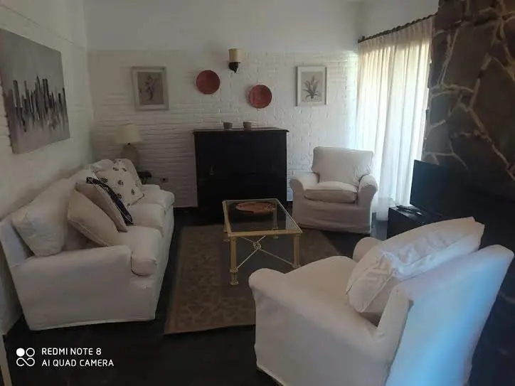 La casa cuenta con una distribución funcional que incluye en su interior un acogedor living comedor con hogar a leña, cocina equipada, 3 dormitorios y 2 baños. Además, ofrece comodidades como aire acondicionado, calefacción, chimenea, y conexión para lavarropas. El exterior de la propiedad está diseñado para disfrutar al aire libre, con un jardín,cochera techada, patio y parrilla, perfectos para reuniones familiares o momentos de relax. La seguridad está garantizada con cámaras de CCTV y un sistema de alarma.