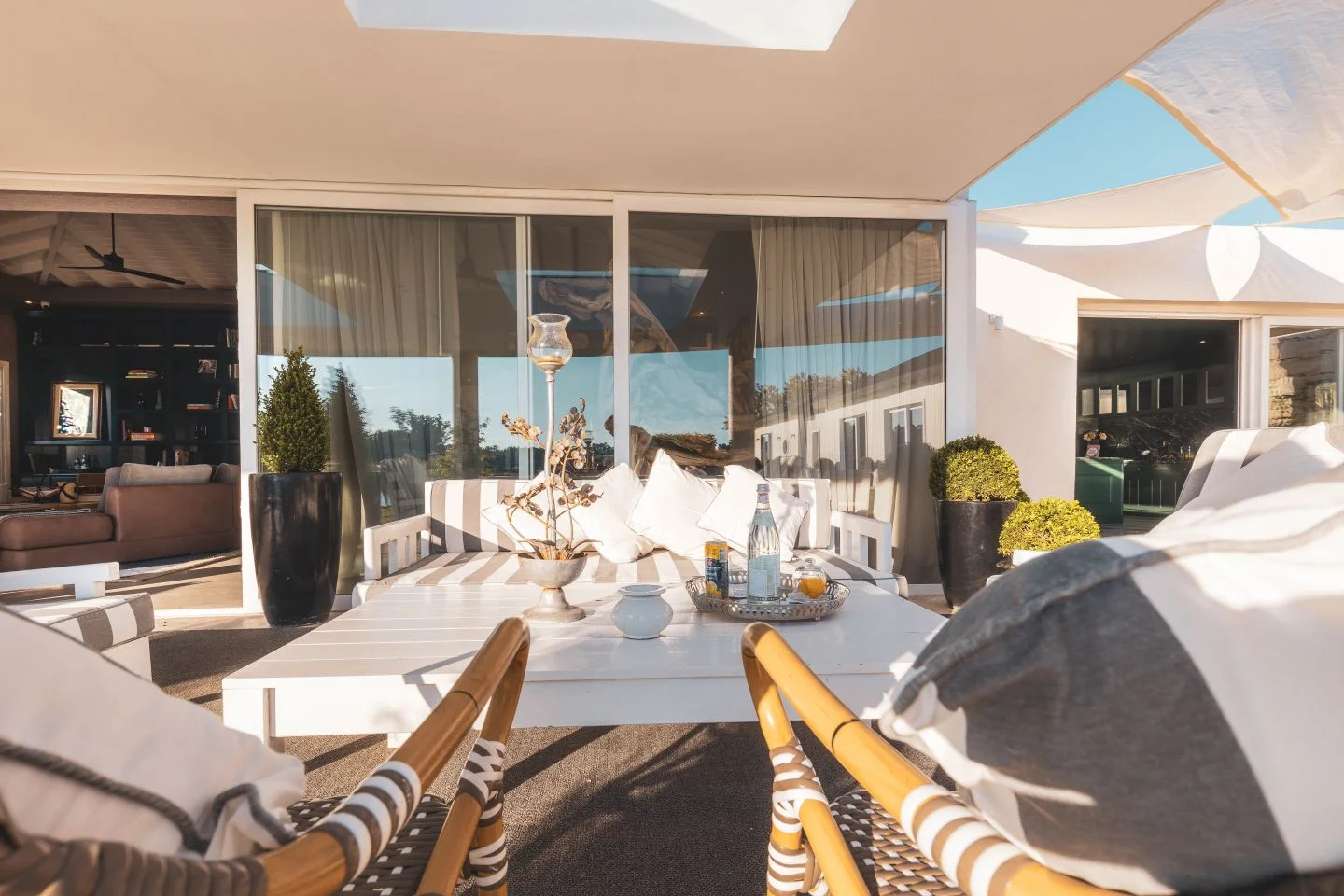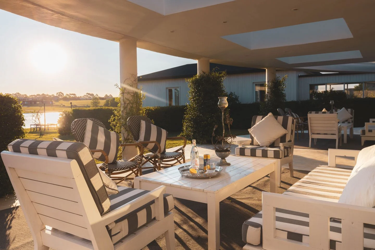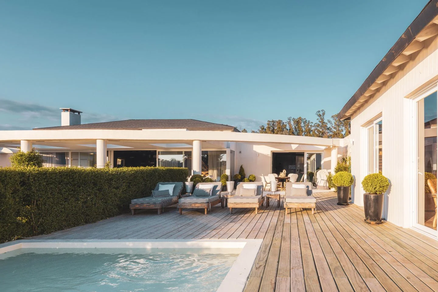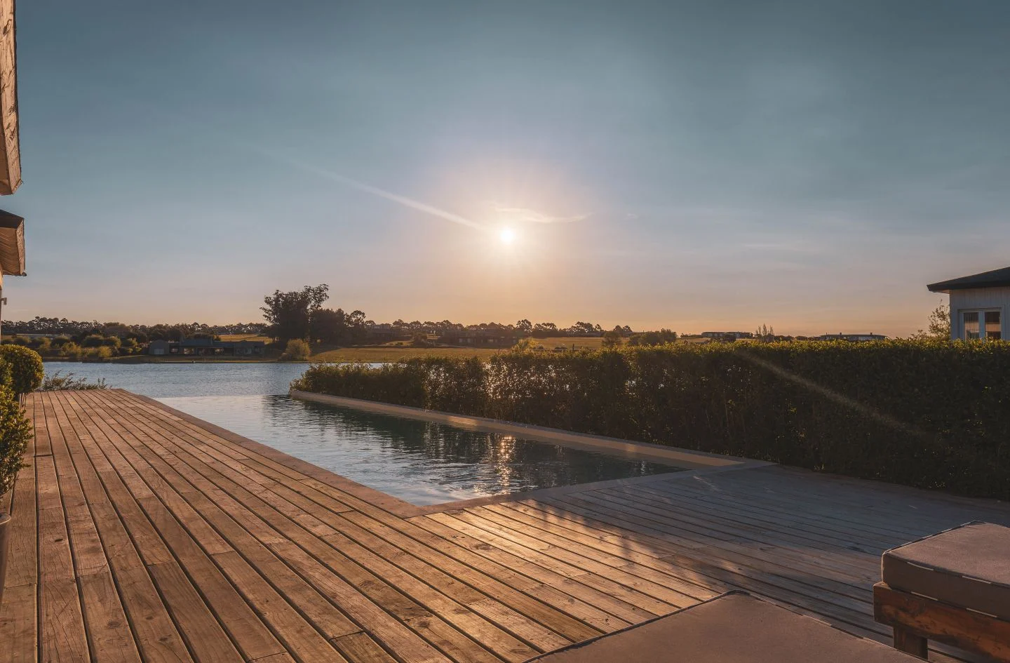 Espectacular casa del estudio Hassen Balut, ubicada sobre la laguna principal con orientación oeste con costa de lago y playa privada, logrando uno de los atardeceres mas lindos de Manantiales.