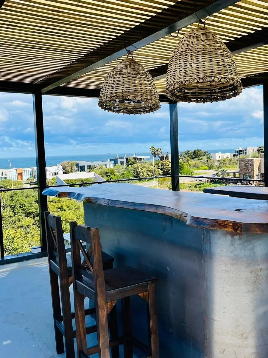 Living comedor con cocina integrada con vista al mar de todos los espacios .