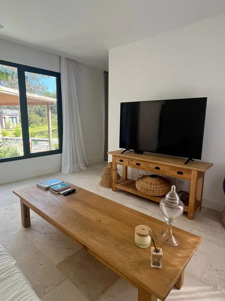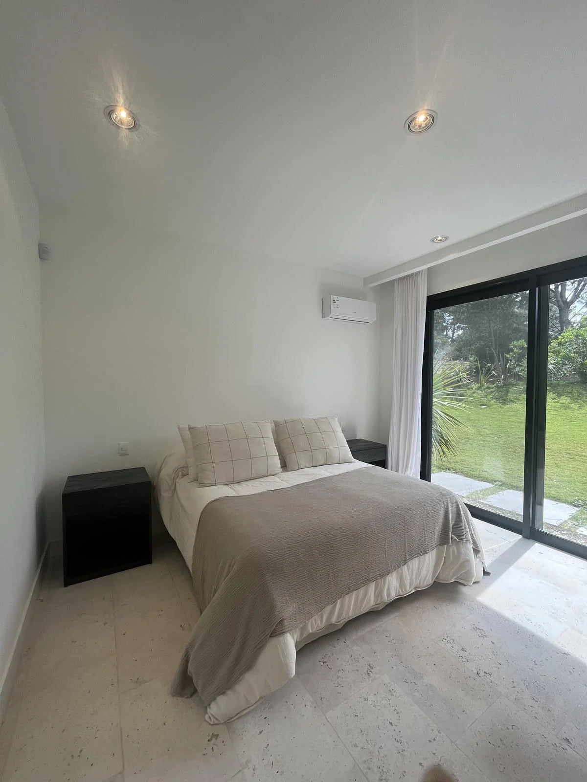 The main house features generous spaces with a large living and dining area, a separate kitchen, and access to the patio where the social area, barbecue, and pool are located — all surrounded by a very sunny garden. The master suite includes a walk-in closet and a TV room.