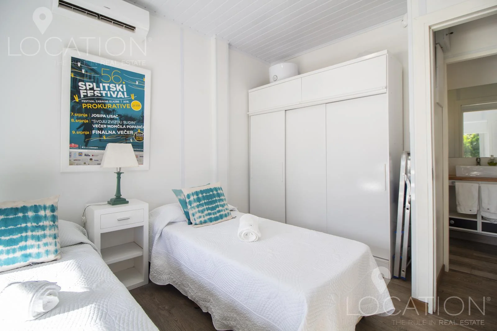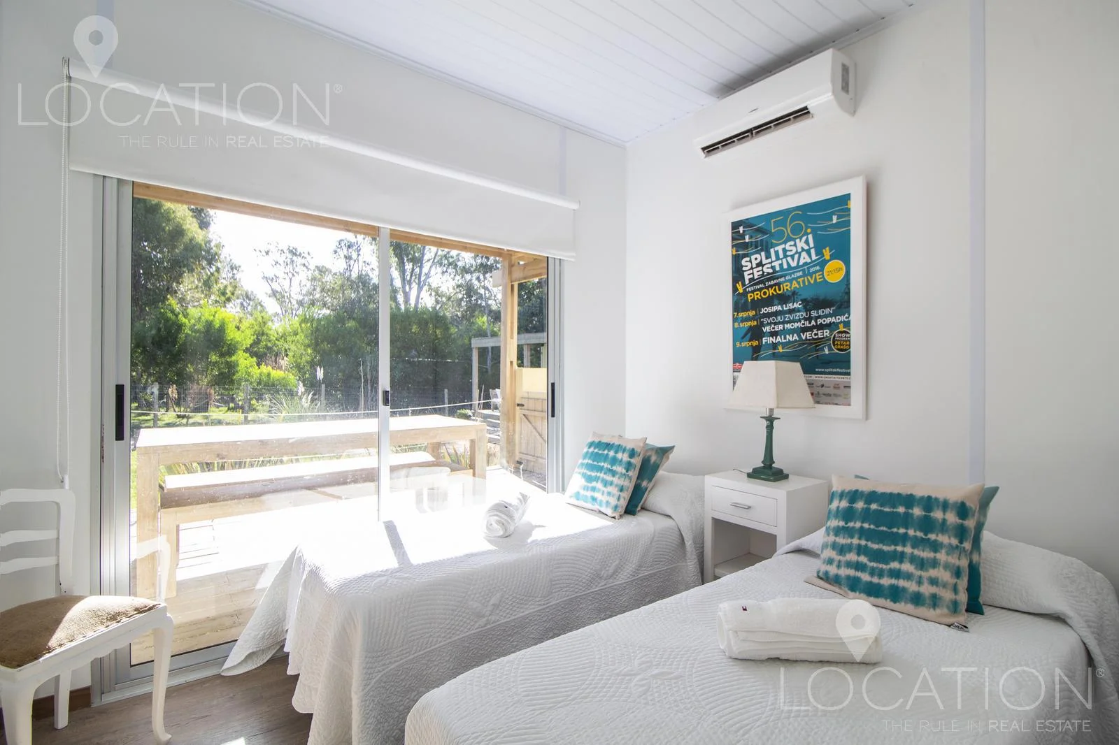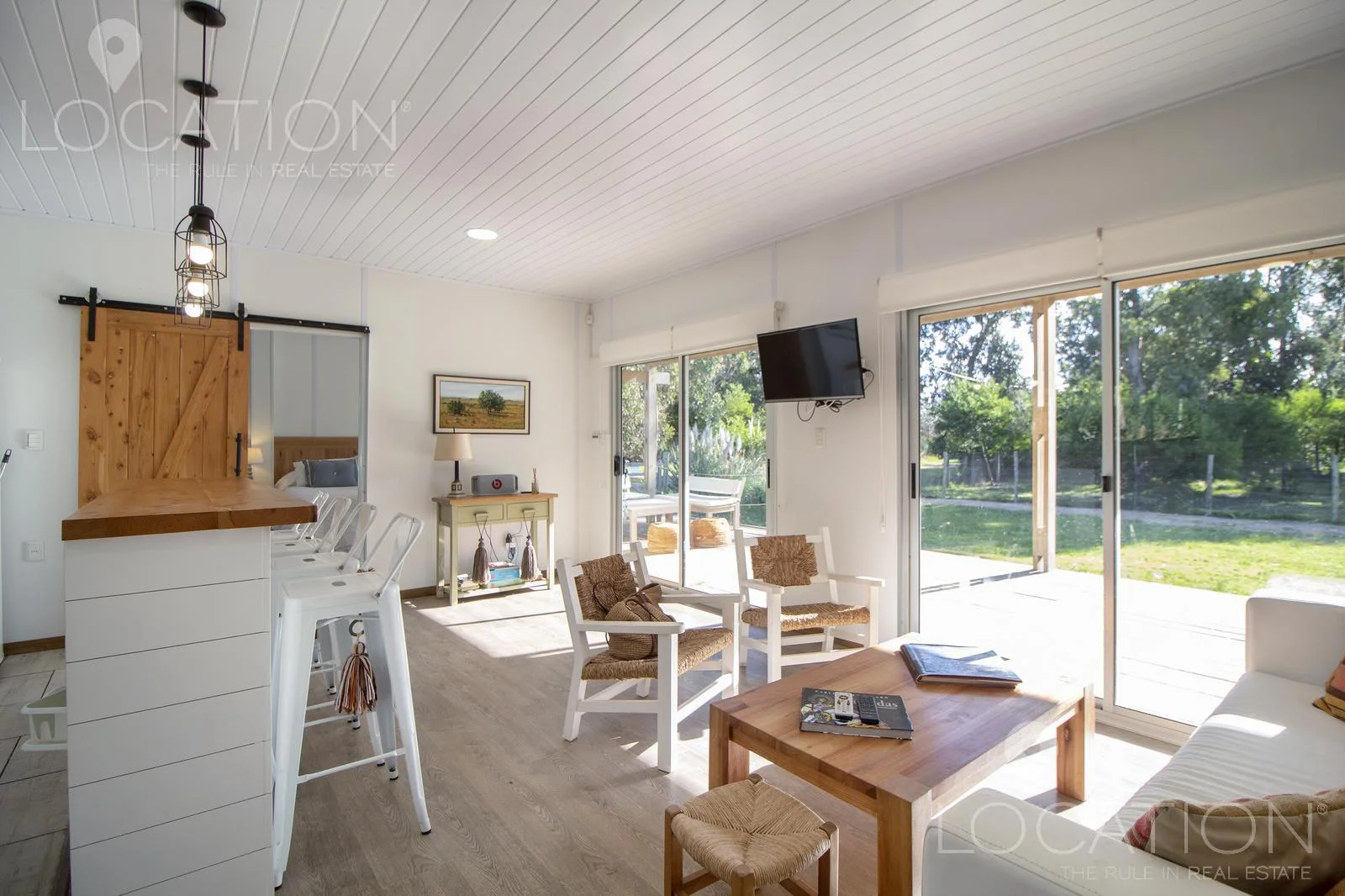 Large sliding windows connect with the house and a cozy, open kitchen with integrated living and dining room. Good storage space. Two bedrooms en suite, all rooms with split.
