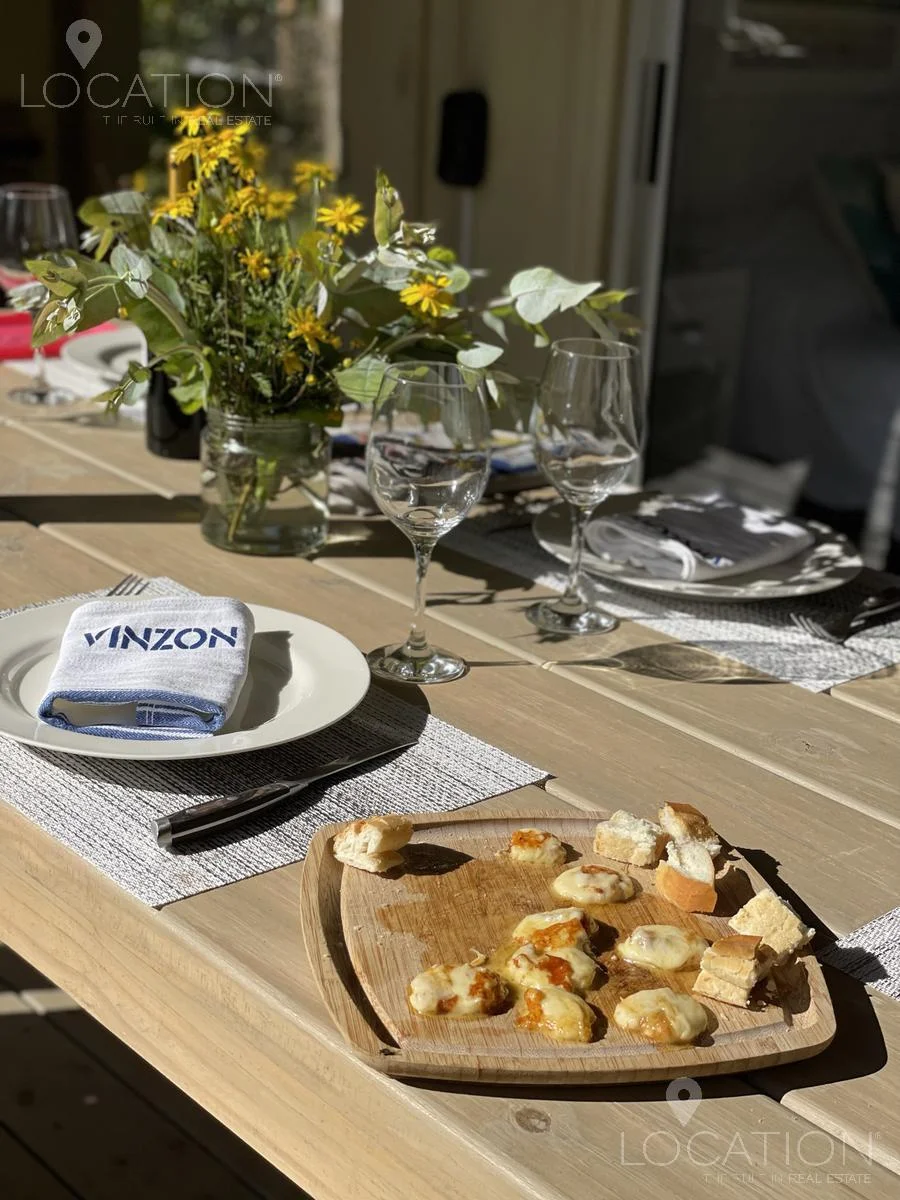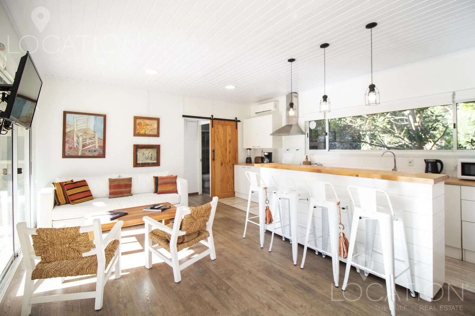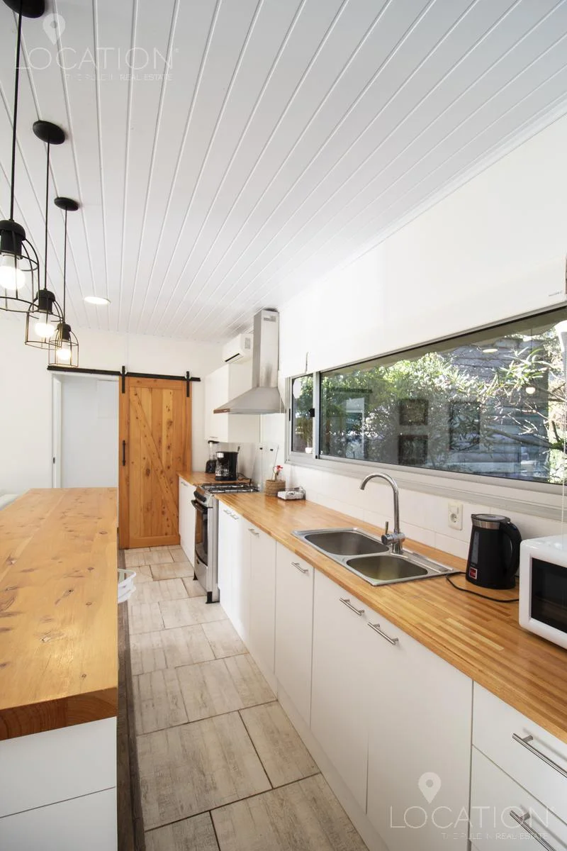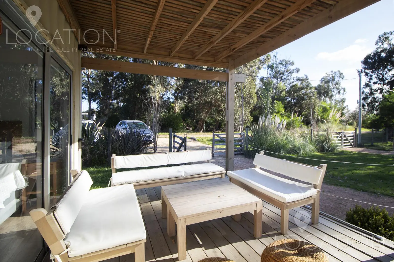 Large sliding windows connect with the house and a cozy, open kitchen with integrated living and dining room. Good storage space. Two bedrooms en suite, all rooms with split.