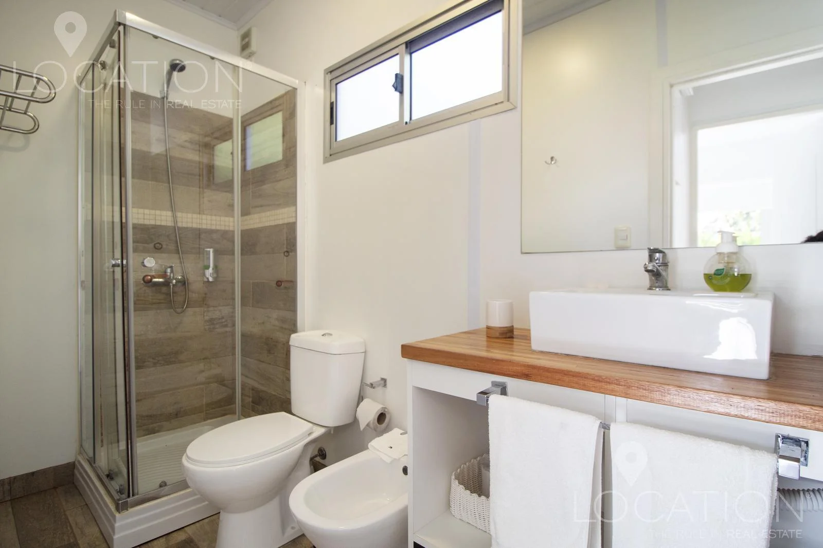 amplios ventanales corredizos conectan con la casa y un acogedor, cocina americana con living y comedor integrados. Buen lugar de guardado. Dos dormitorio en suite . Todos los ambientes con split.