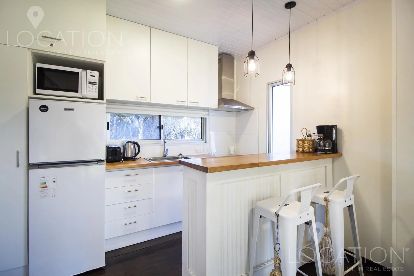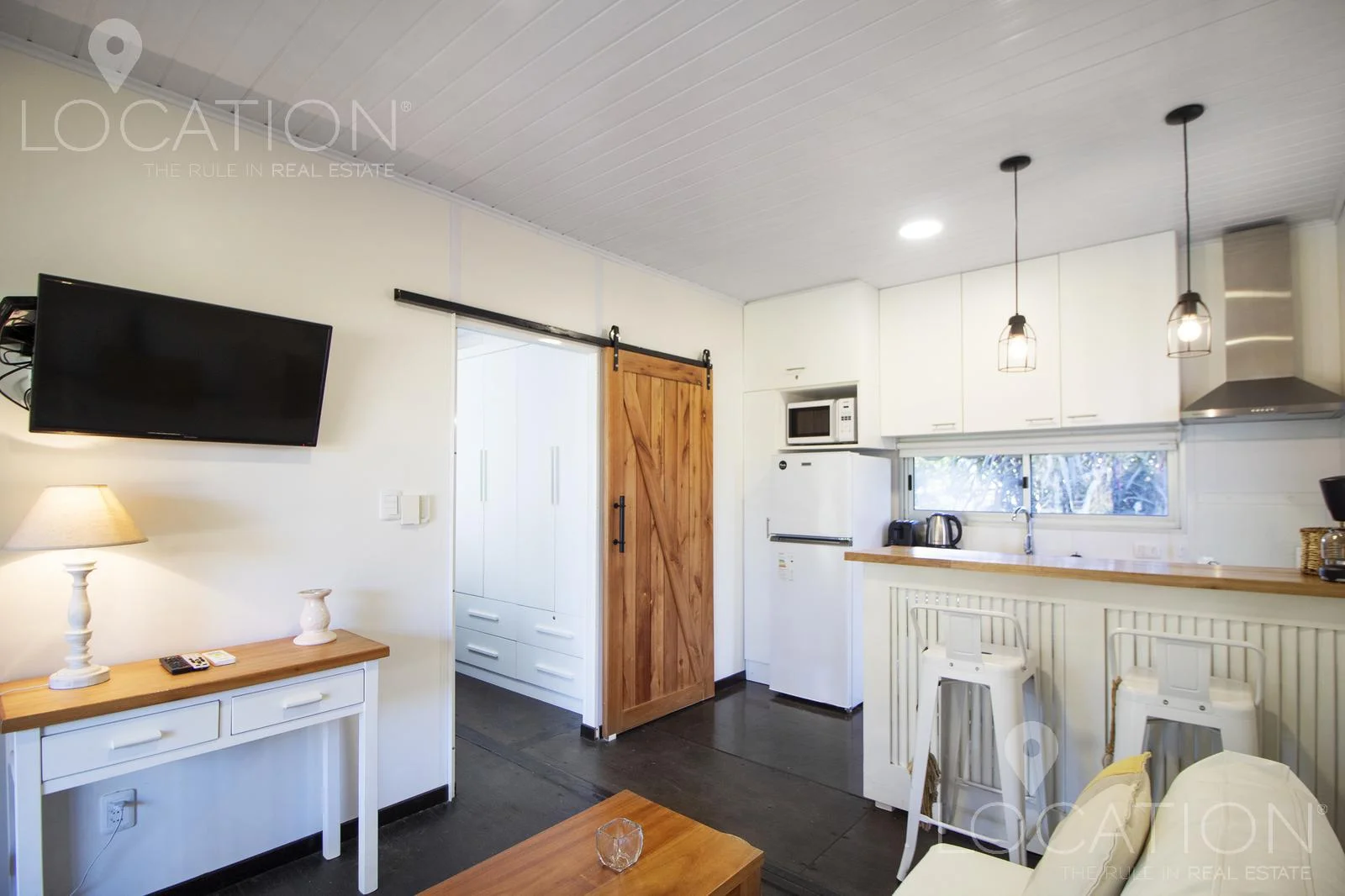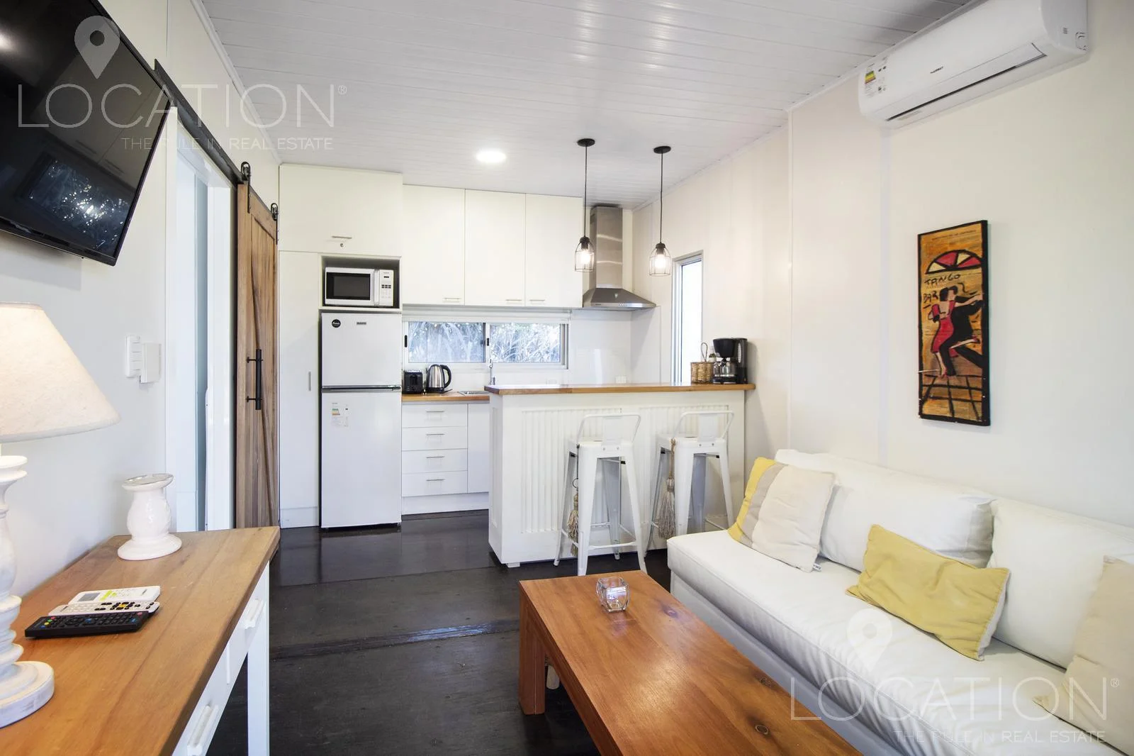 Large sliding windows connect with the house and a cozy, open kitchen with integrated living and dining room. Good storage space. Bedroom en suite. All rooms with split.