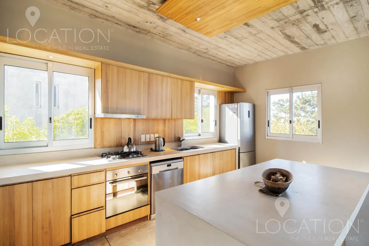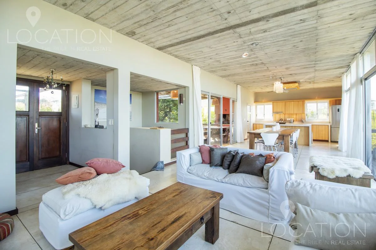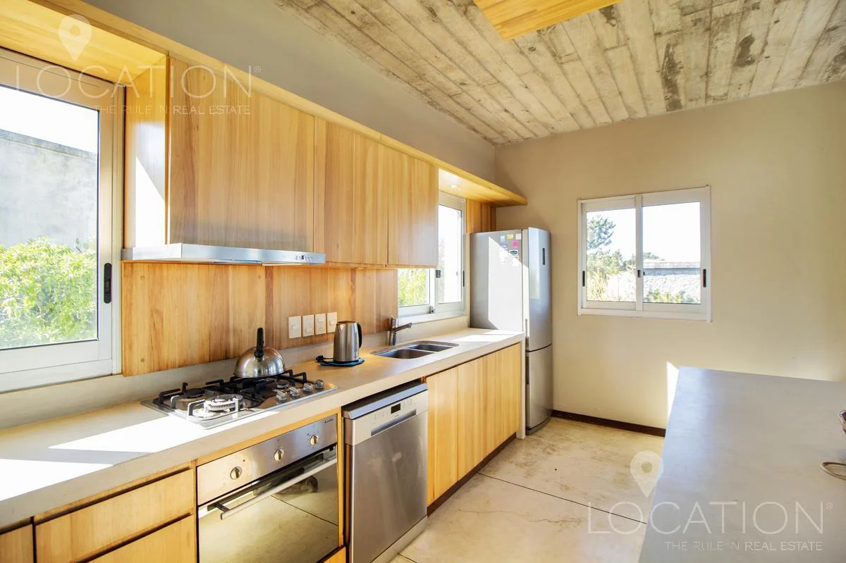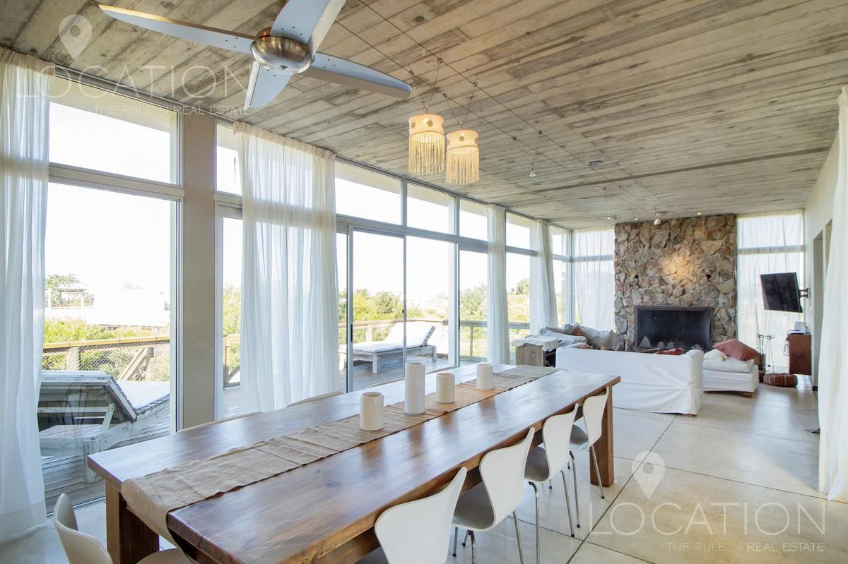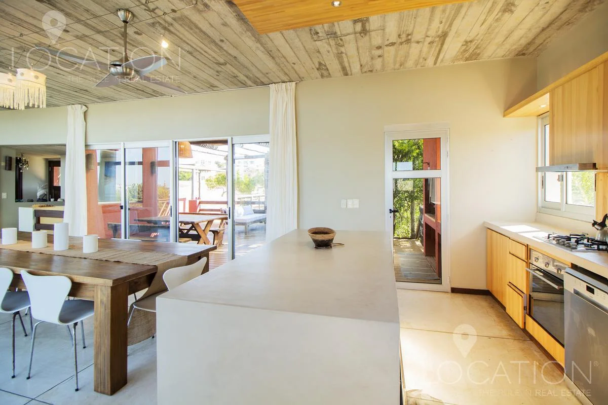 Hall de recepcion, toillette, living comedor y cocina integrados, con amplios ventanales hacia el mar y hacia la terraza. Desde el deck de planta alta, se puede llegar al jardin, utilizando una comoda escalera que los conecta.