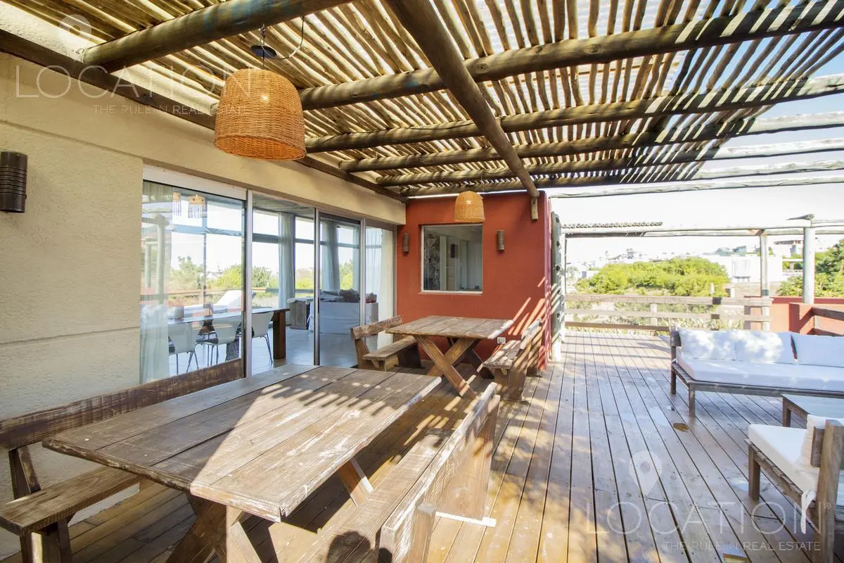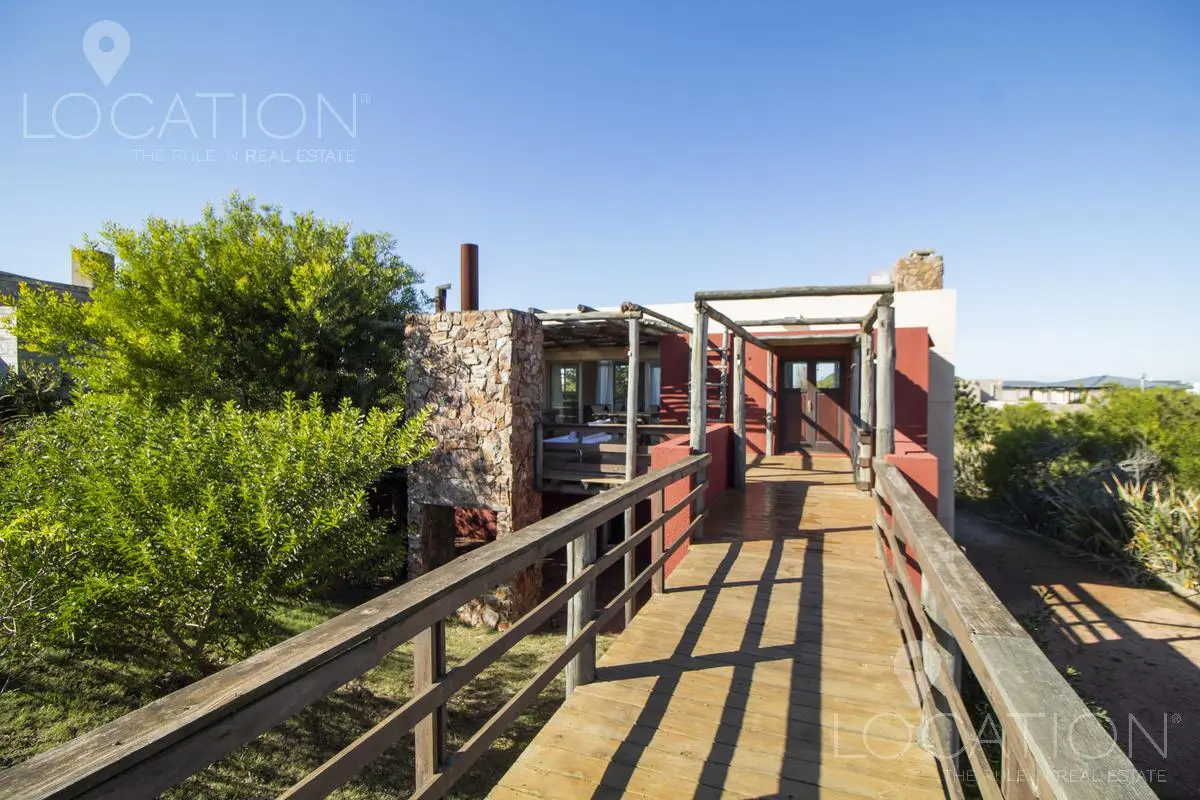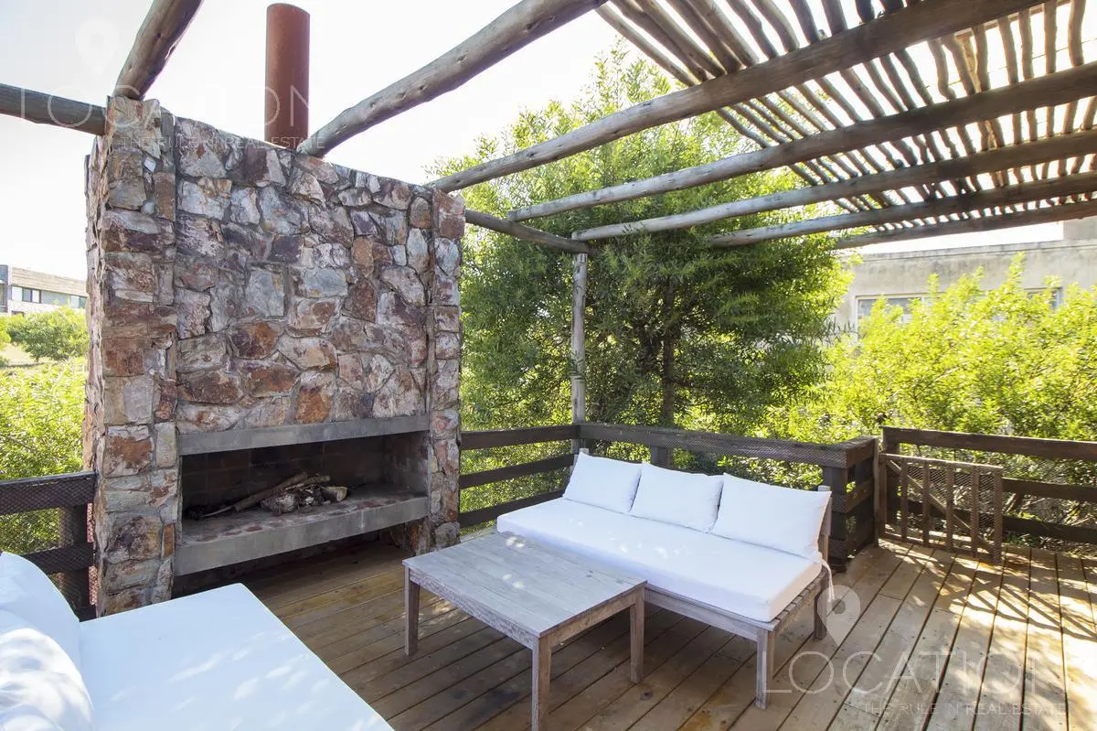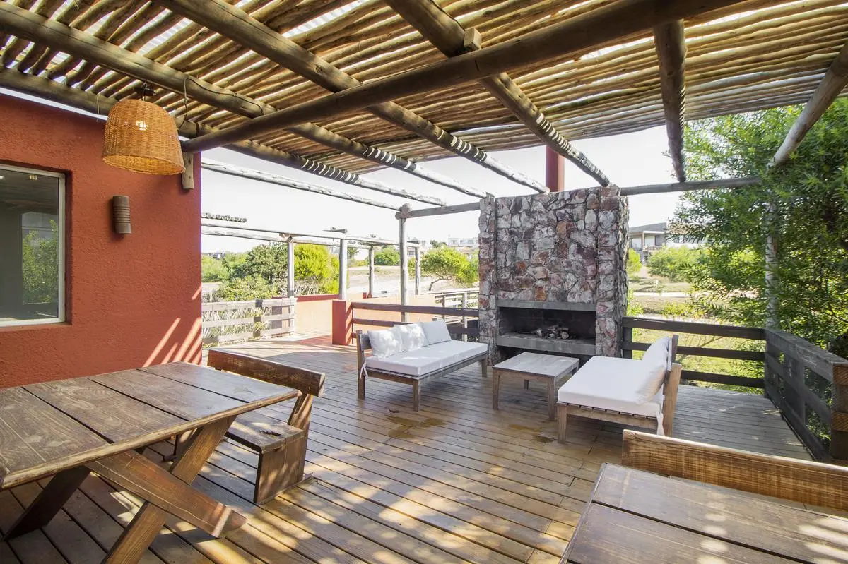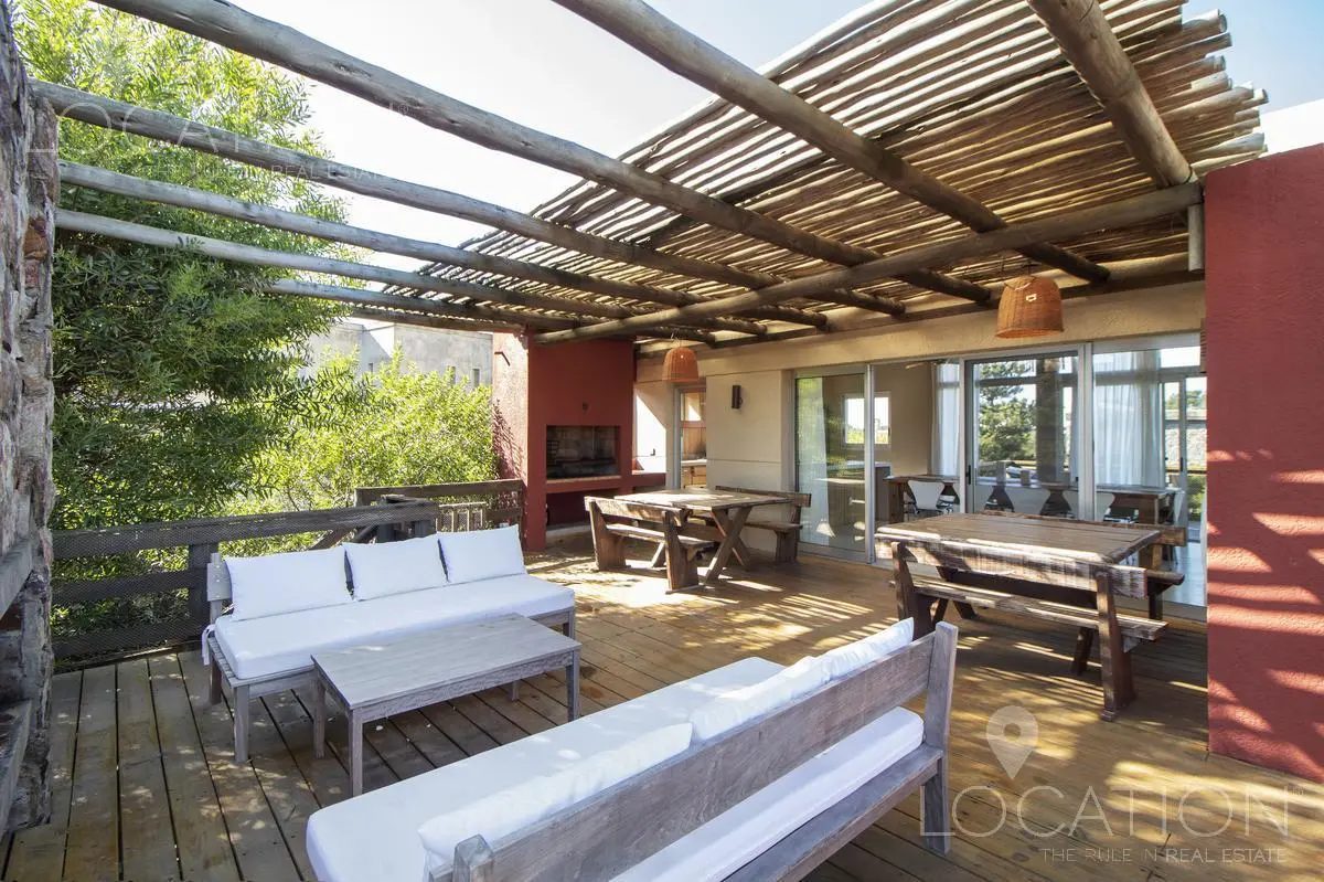 Accediendo por un puente a nivel de calle, se llega a una calida terraza con fogon y living exterior, asi como la parrilla y el comedor con el reparo del viento.