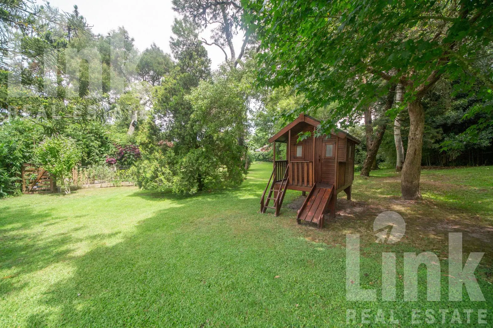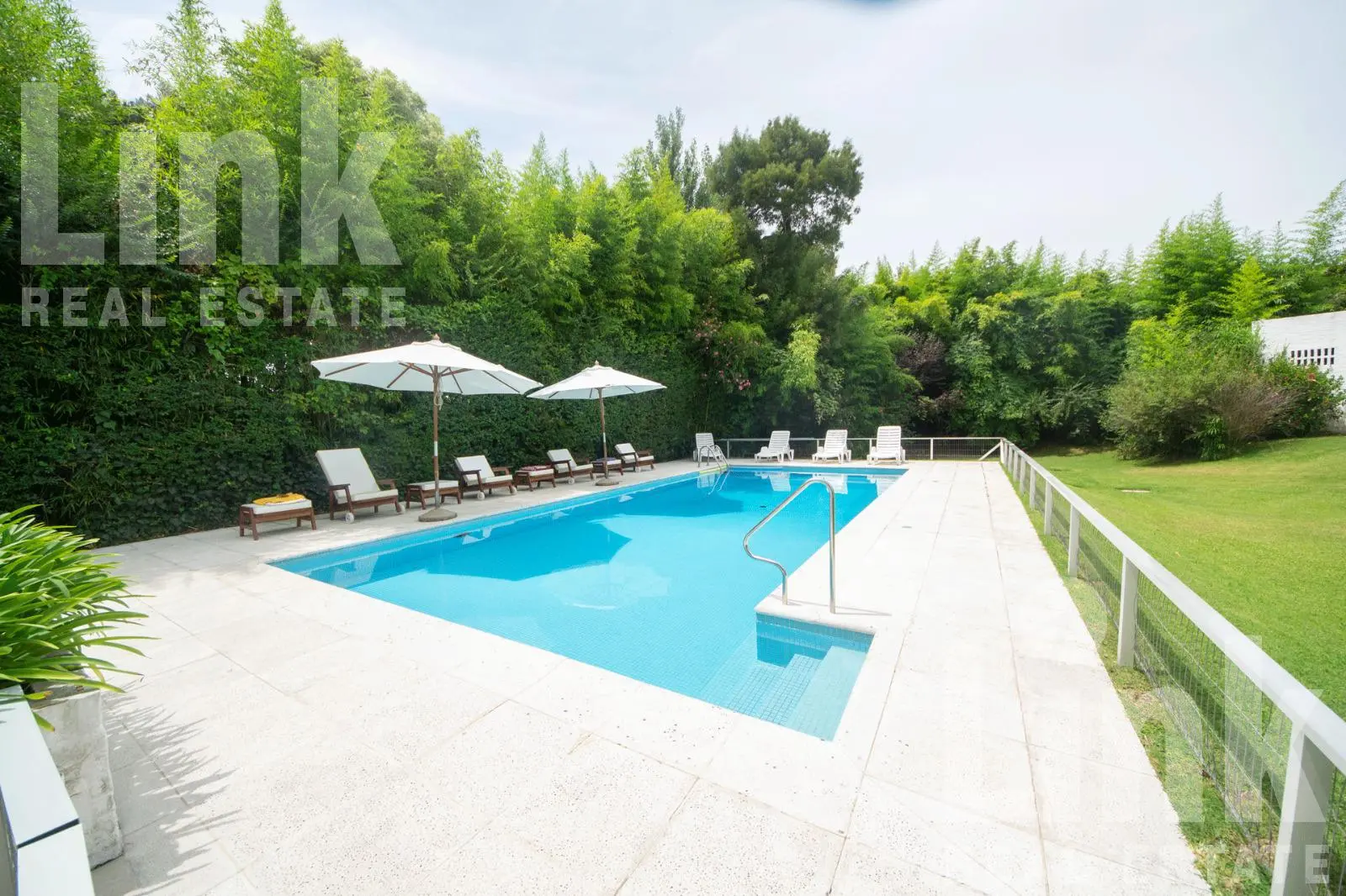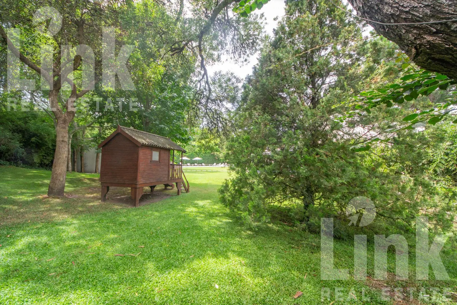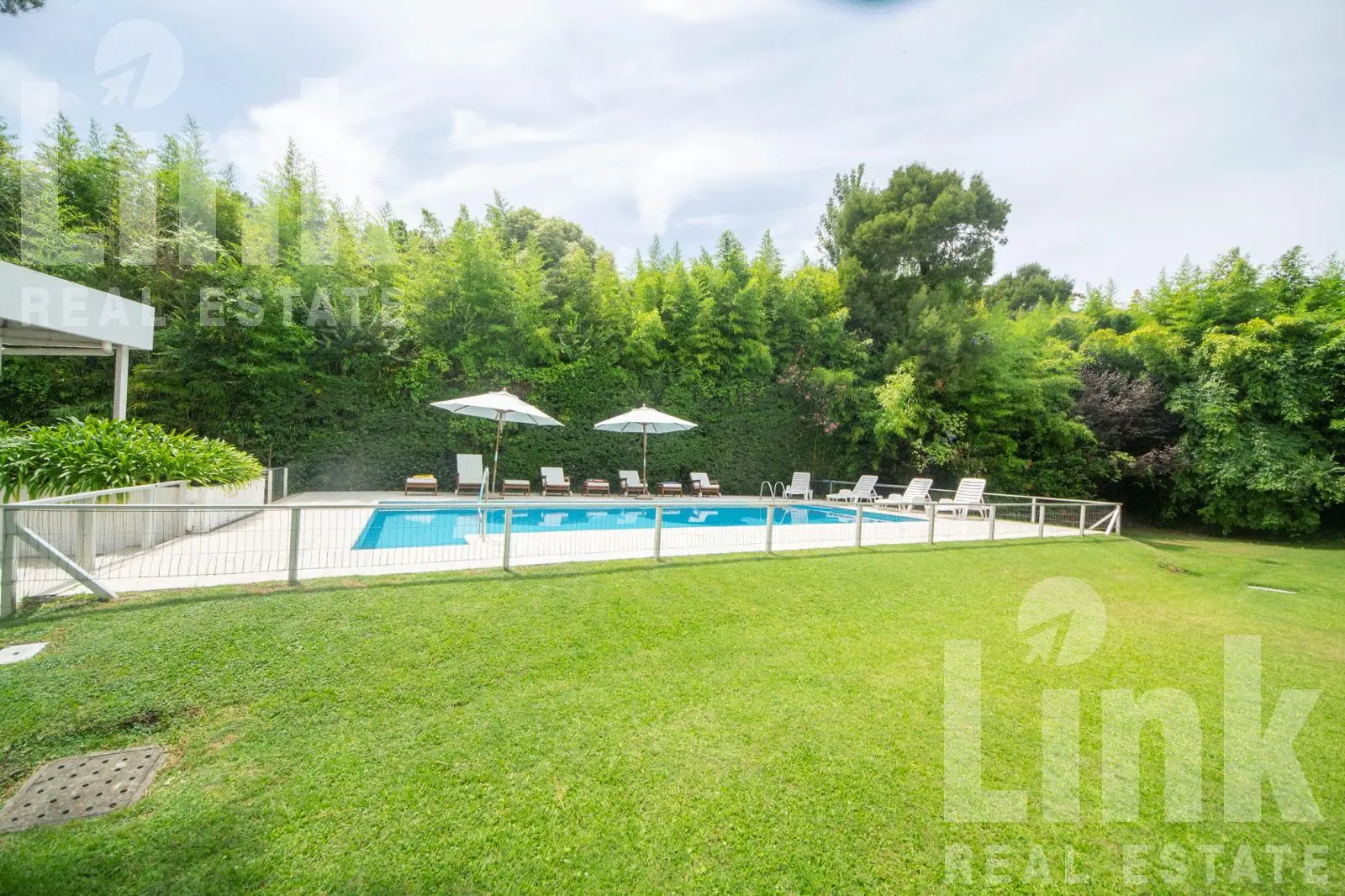 El asombroso jardín alberga una construcción de 200 m2 diseñada para reuniones sociales, equipada con cocina completa, 2 parrilla, dos toilettes y piscina climatizada.