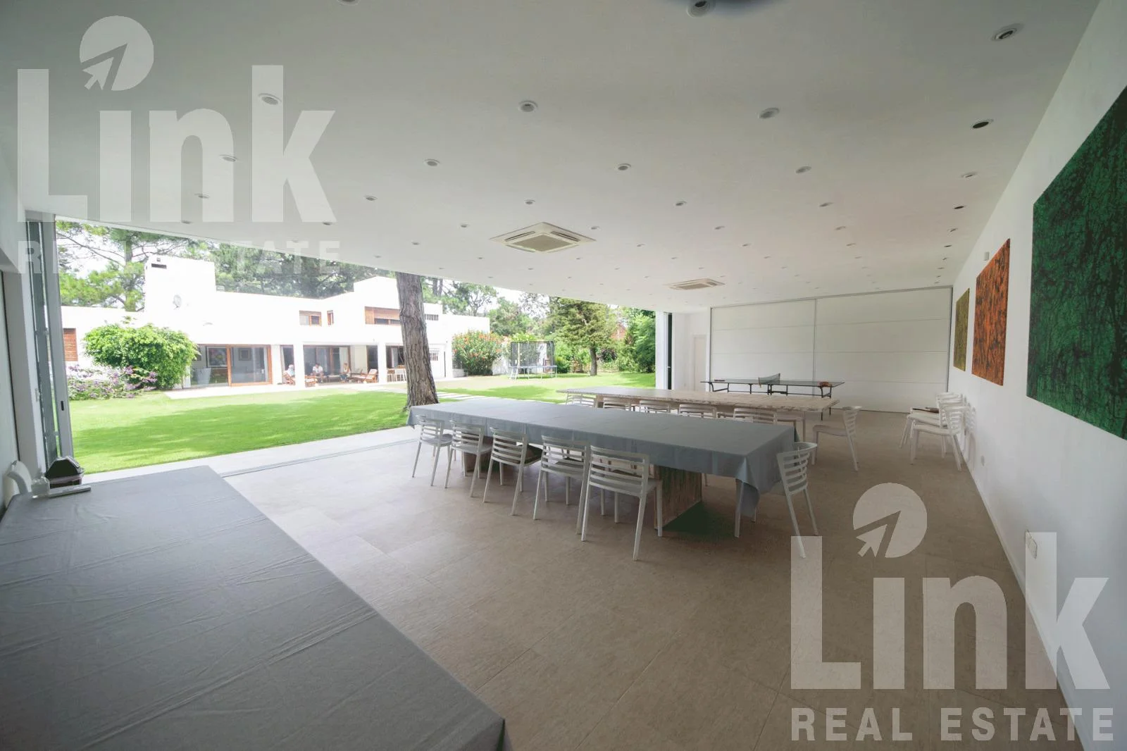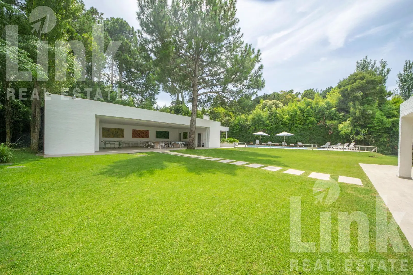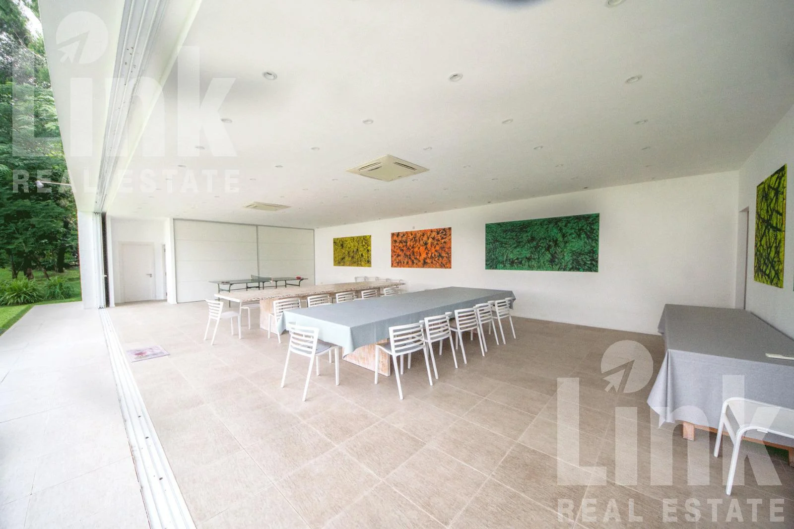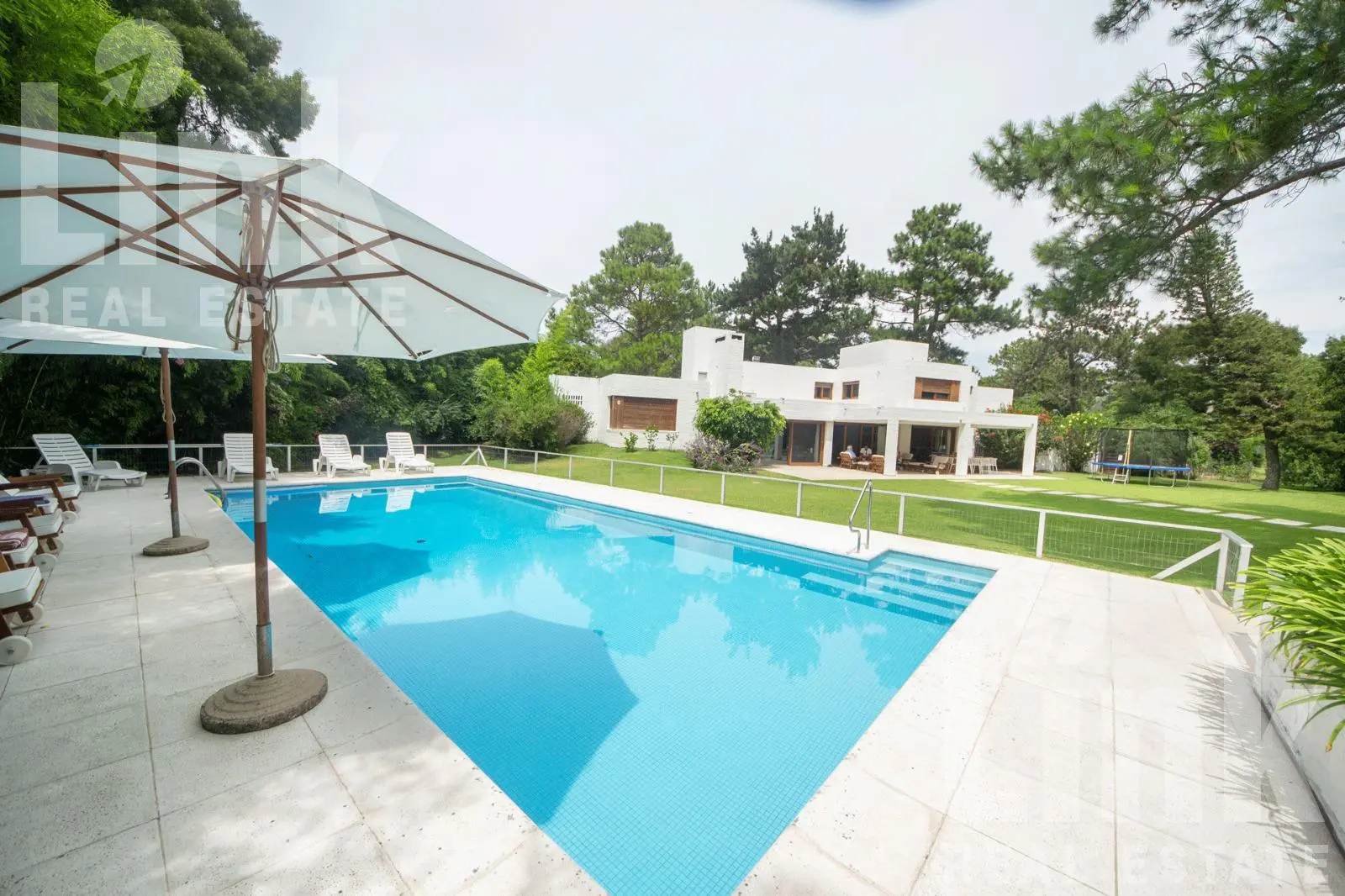 El asombroso jardín alberga una construcción de 200 m2 diseñada para reuniones sociales, equipada con cocina completa, 2 parrilla, dos toilettes y piscina climatizada.