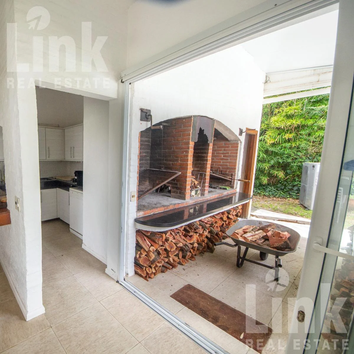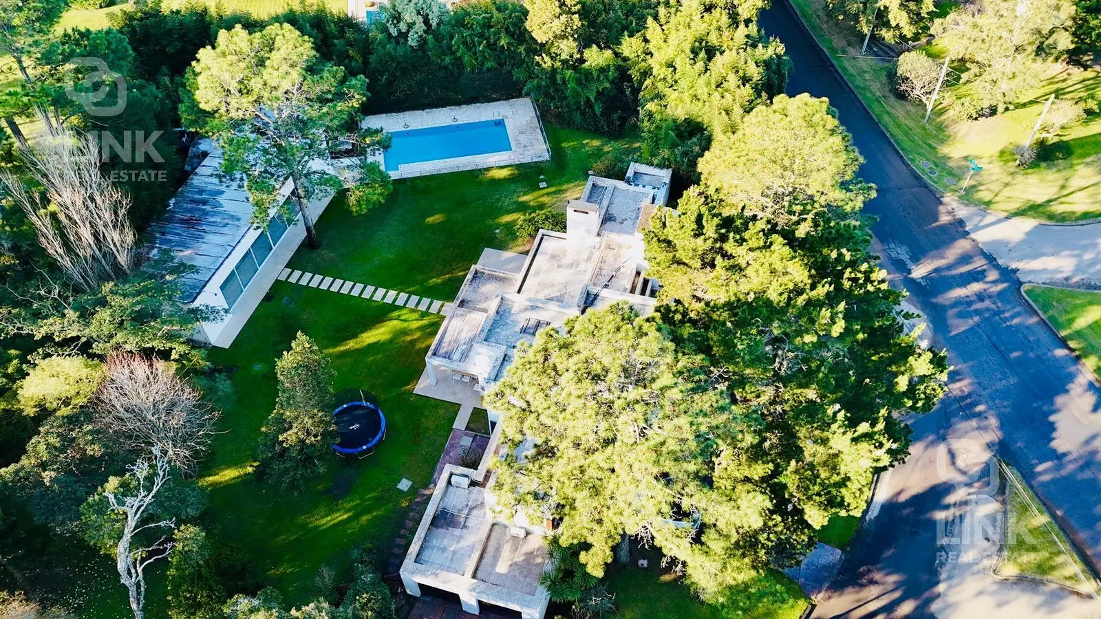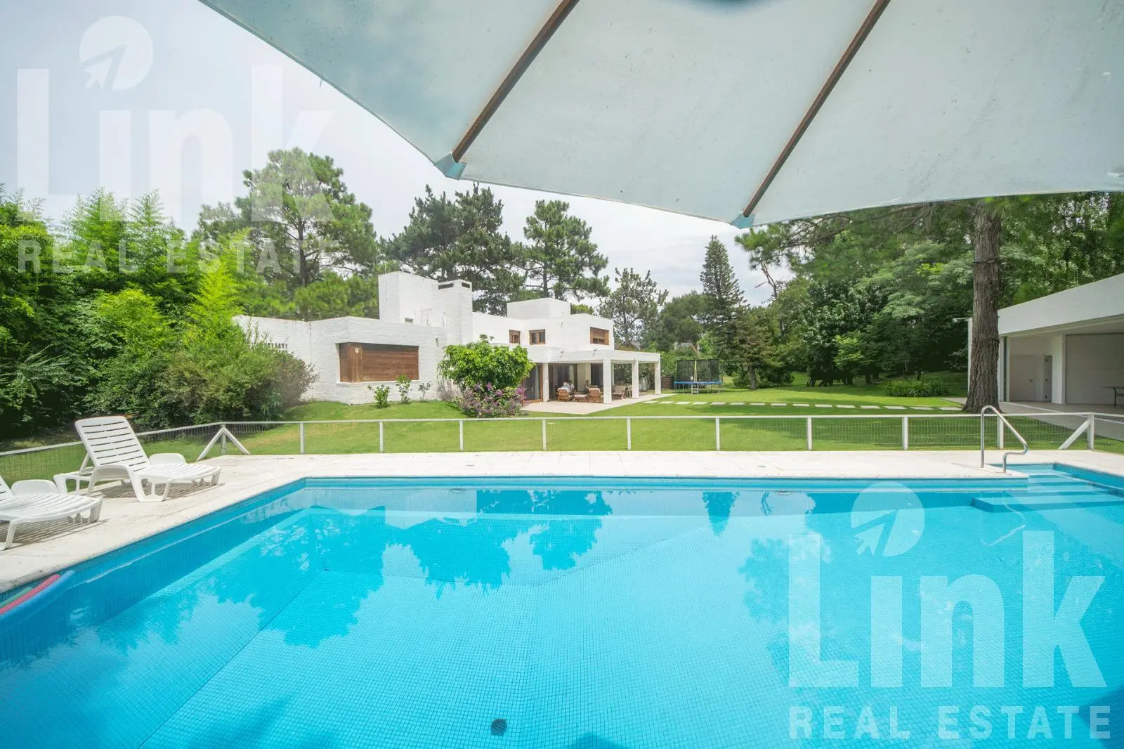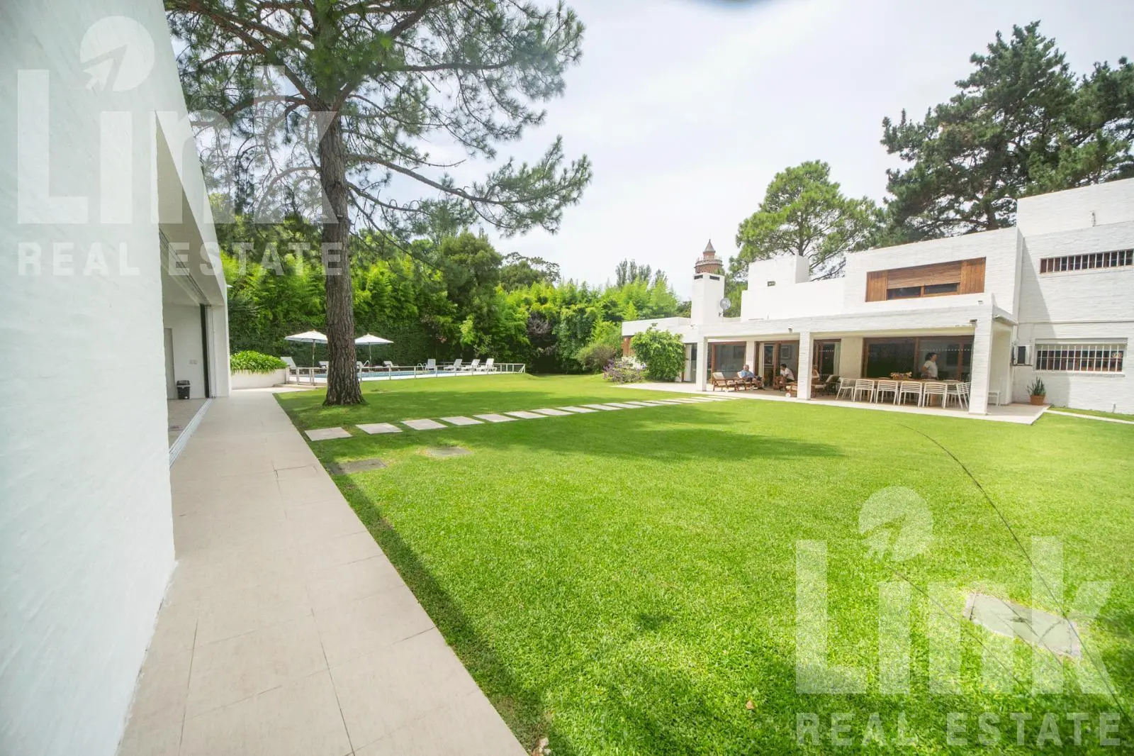 El asombroso jardín alberga una construcción de 200 m2 diseñada para reuniones sociales, equipada con cocina completa, 2 parrilla, dos toilettes y piscina climatizada.