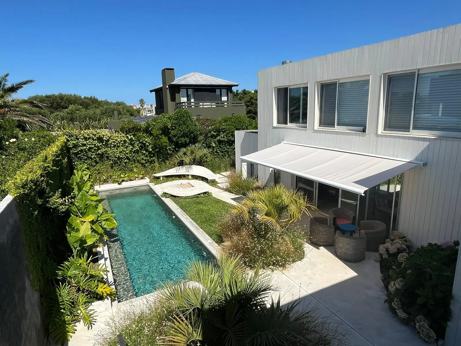 Cuenta con dos plantas muy cómodas con la siguiente distribución: en planta baja hay cuatro habitaciones en suite, (una de ellas se suele utilizar como dependencia de servicio). Además cuenta con lavadero. Un living comedor con tv se comunica con la cocina donde se encuentra el parrillero creando en este ambiente como una especie de barbacoa super completa, con salida al jardín donde se encuentra la piscina y un living externo.