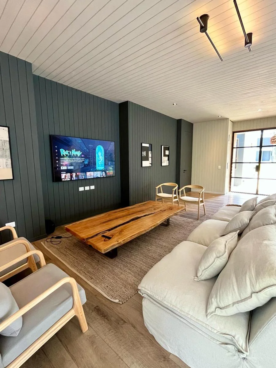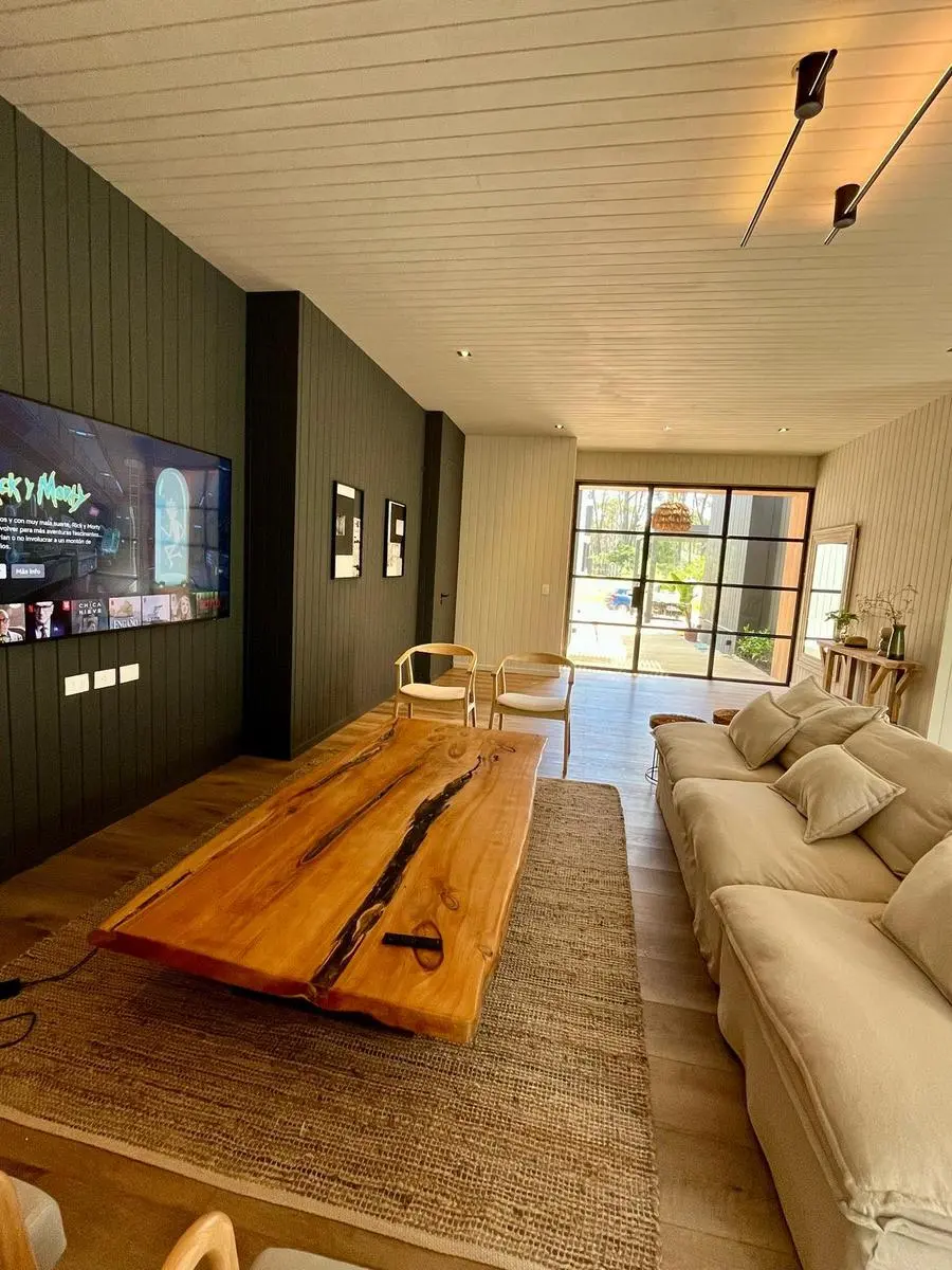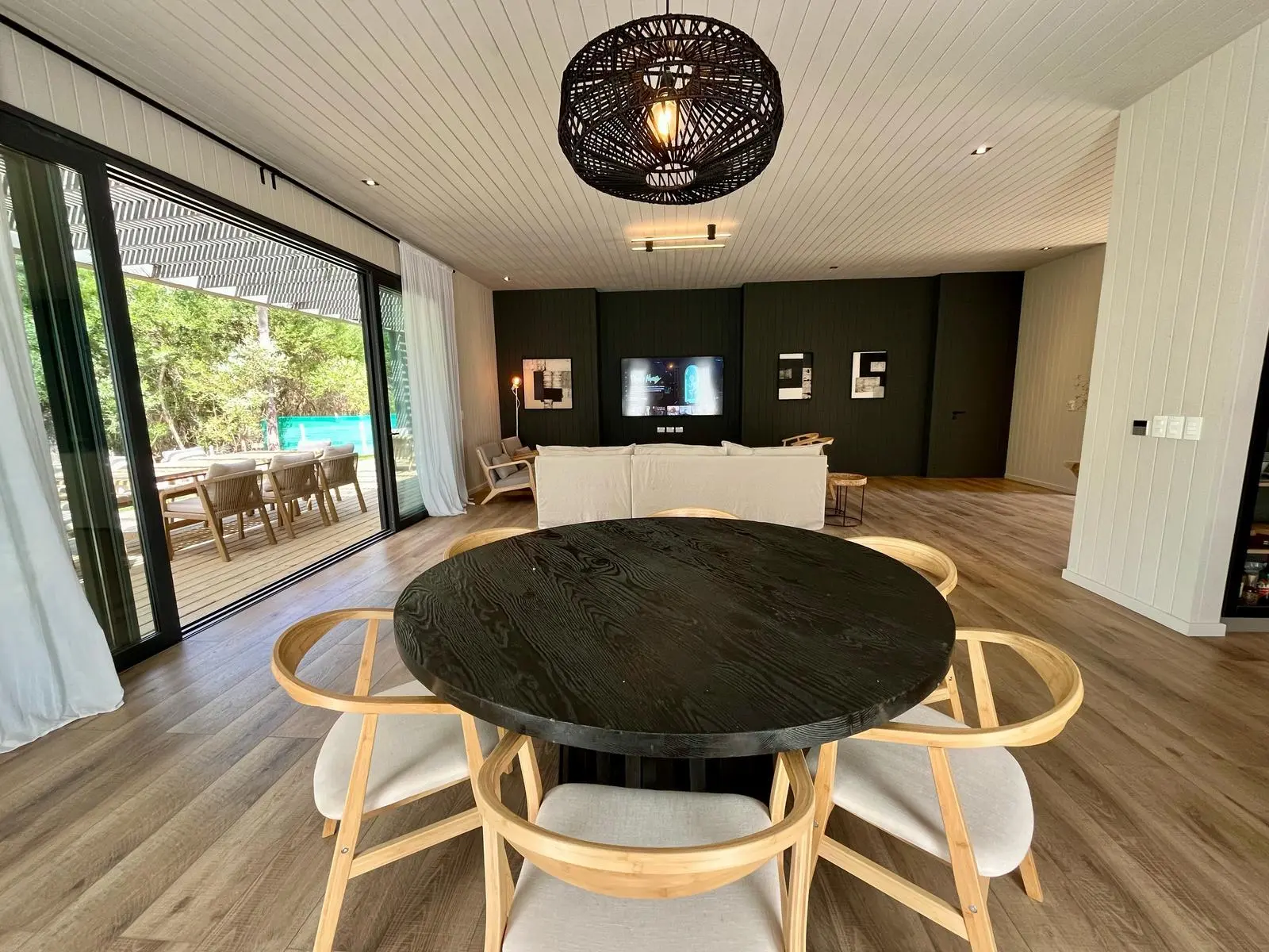 Saliendo por el gran ventanal que se abre completamente encontramos un deck, y el área de parrilla con un estar exterior y mesa para 8 personas.