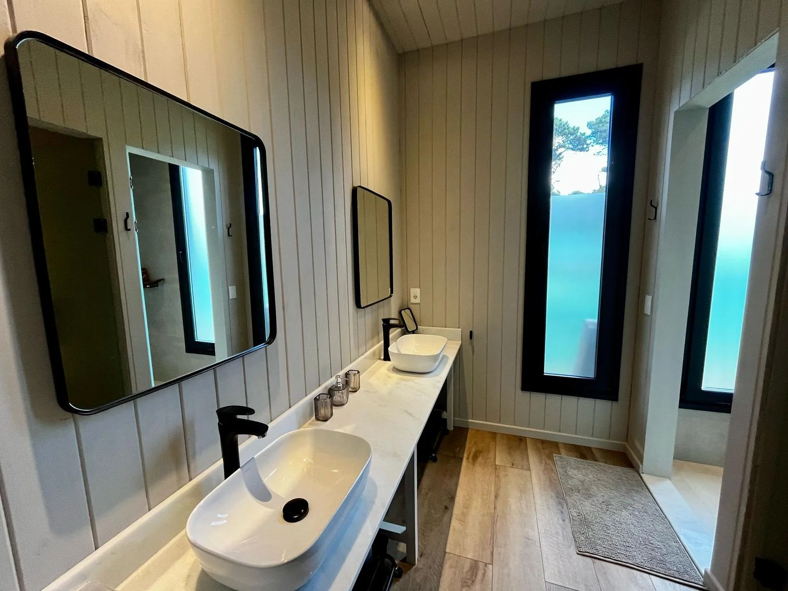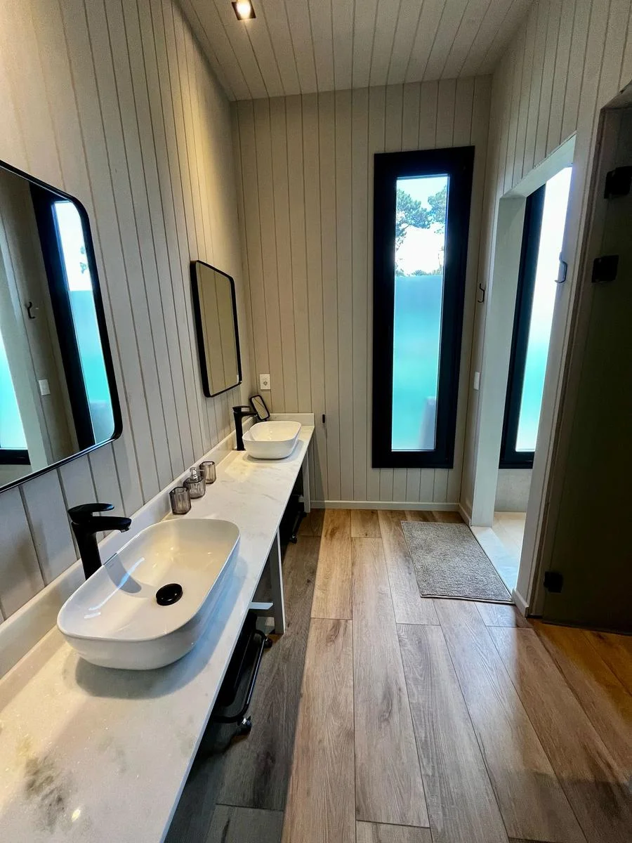 The master suite overlooks the forest and has a walk-in closet. Then, there are two more suites, making a total of three comfortable bedrooms.