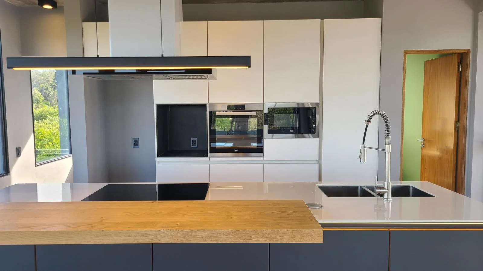 Upstairs, an open-concept living and dining area with a fully equipped German-designed kitchen (Leich) and Beko appliances. Expansive balcony with a double infinity pool, sun deck, and built-in barbecue with counter and benches. Pellet stove in the living room.