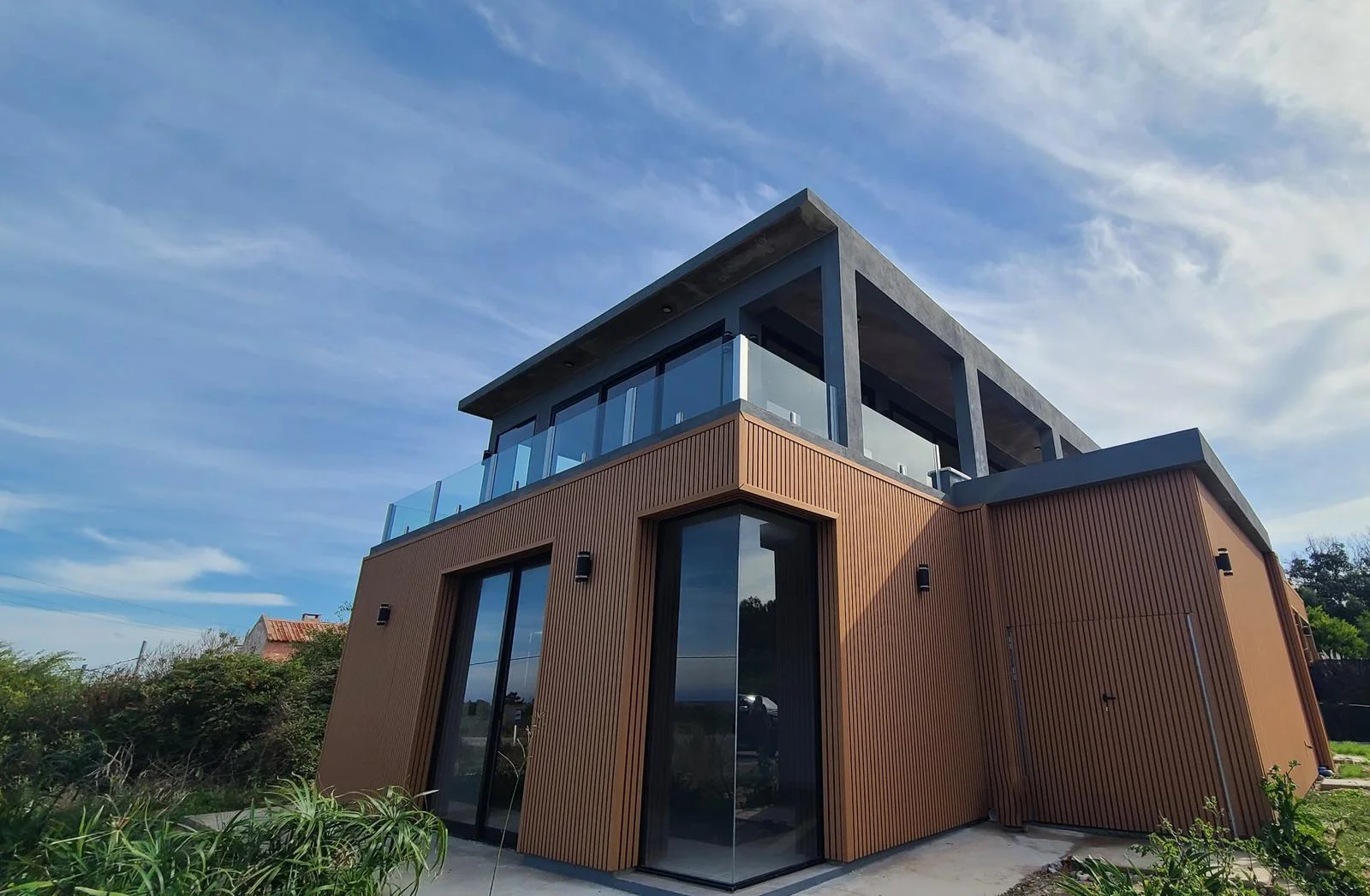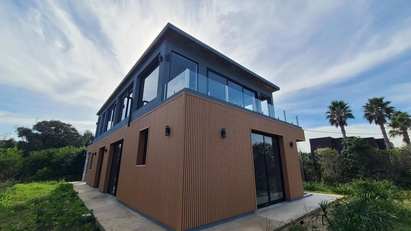Aluminum frame windows with laminated glass, WPC exterior cladding, laundry area, carport for three vehicles, outdoor shower, and generous storage space.