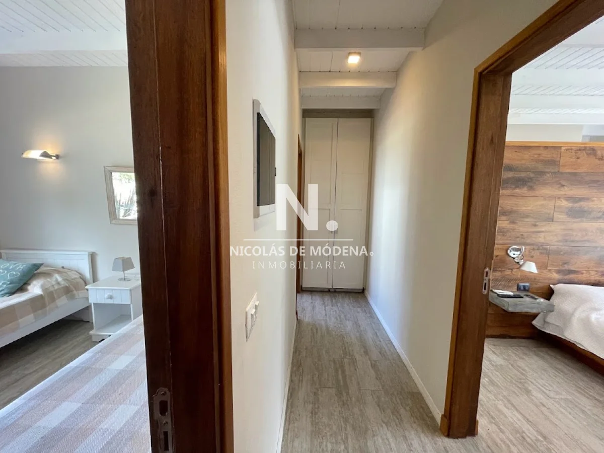 La propiedad cuenta con 3 dormitorios y 2 baños, con capacidad para alojar cómodamente hasta 6 personas. Los interiores presentan un estilo cálido y contemporáneo, con un living comedor amplio y luminoso que se abre hacia el jardín, generando una conexión fluida entre el interior y el exterior. La cocina está totalmente equipada, incluyendo anafe, horno, microondas, heladera con freezer, campana, placares amplios y todos los electrodomésticos necesarios para una estadía sin preocupaciones.