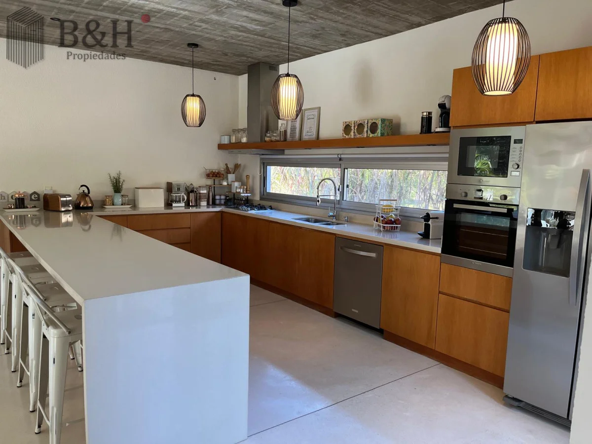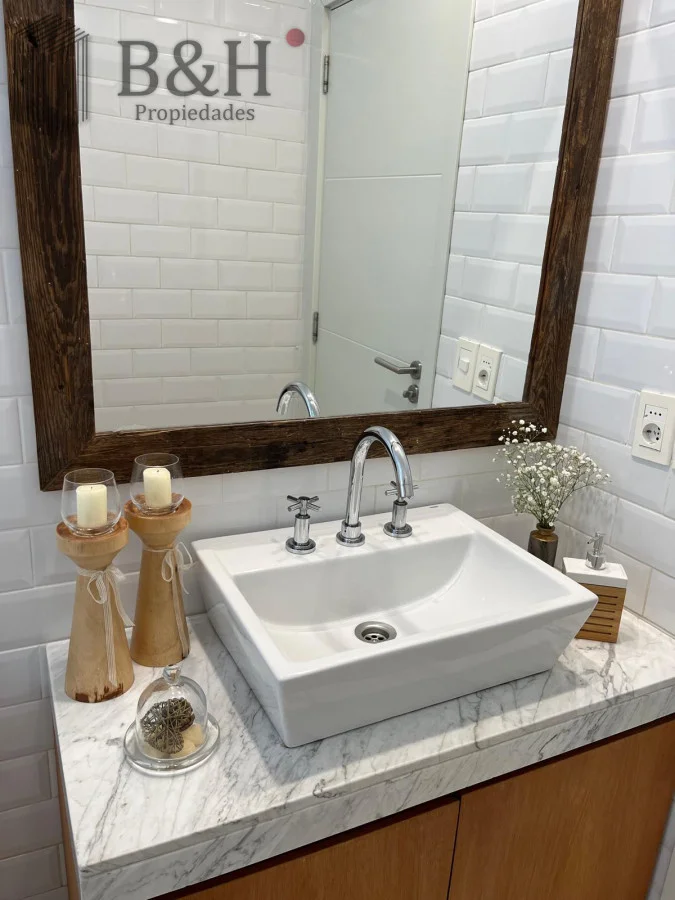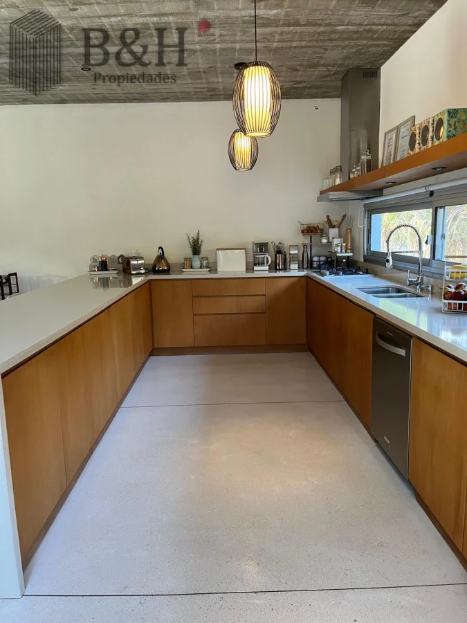 El área social se destaca por su amplio living comedor, con grandes ventanales que integran el interior con el jardín y permiten disfrutar de la luz del día en todo momento. La cocina está completamente equipada, con muebles funcionales, campana, horno, microondas, anafe, heladera con freezer y espacio de guardado tanto en cocina como en comedor.