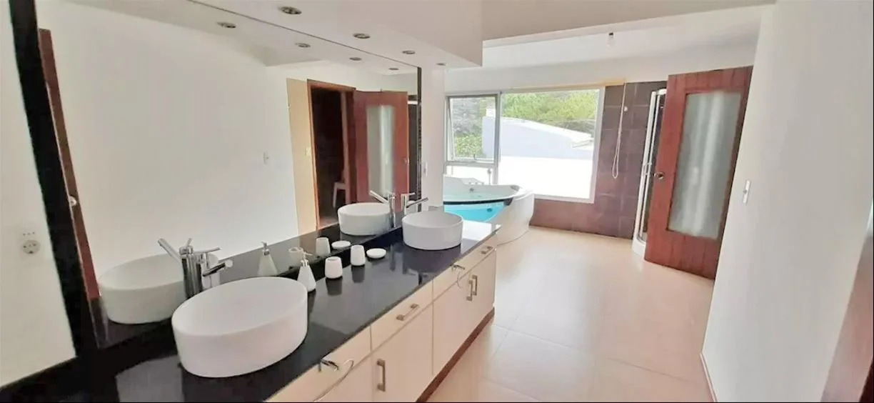 Dormitorio principal en suite: Baño compartimentado con mesada doble, ducha e hidromasaje.