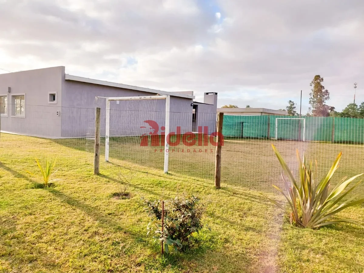 Parrillero exterior semi cerrado y zona verde exterior con cancha de futbol.