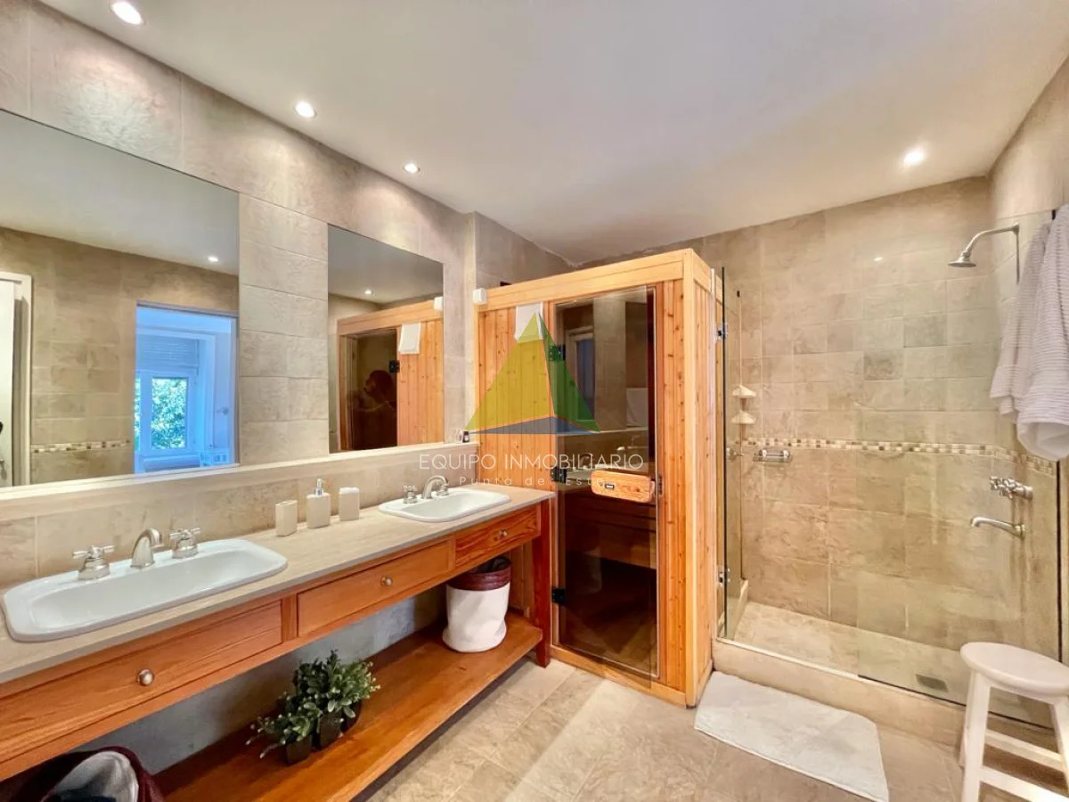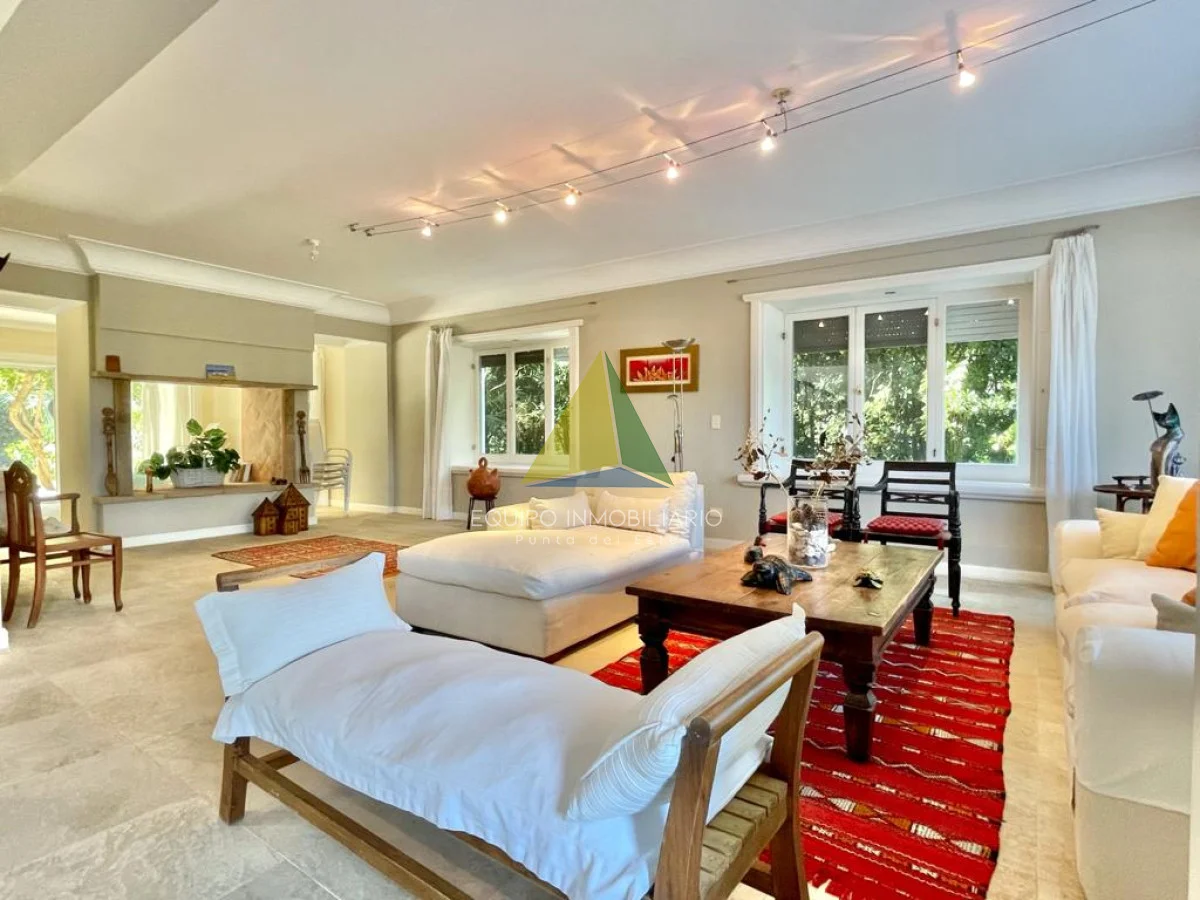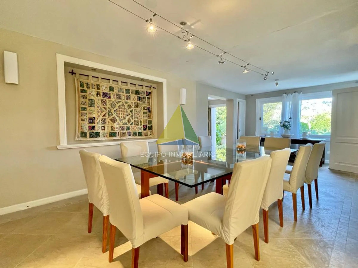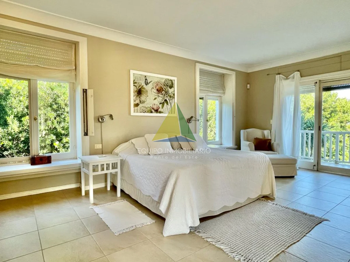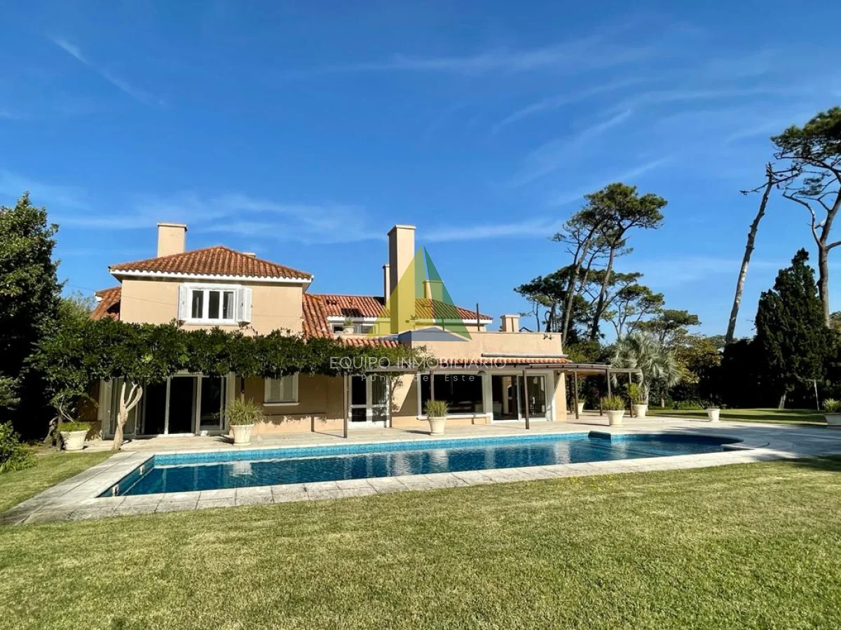 Casa en venta Playa Brava , muy lindo y gran parque esquinero. A cuadra y media de Rambla y la playa. Living , comedor cocina equipada, cochera, estacionamiento, comedor diario. Piscina climatizada, hogar a leña, lavadero y dependencia. Planta alta Gran suite con vista a la piscina. Planta a con balcón y vista al mar, mas tres suite. Habitación exterior en suite.