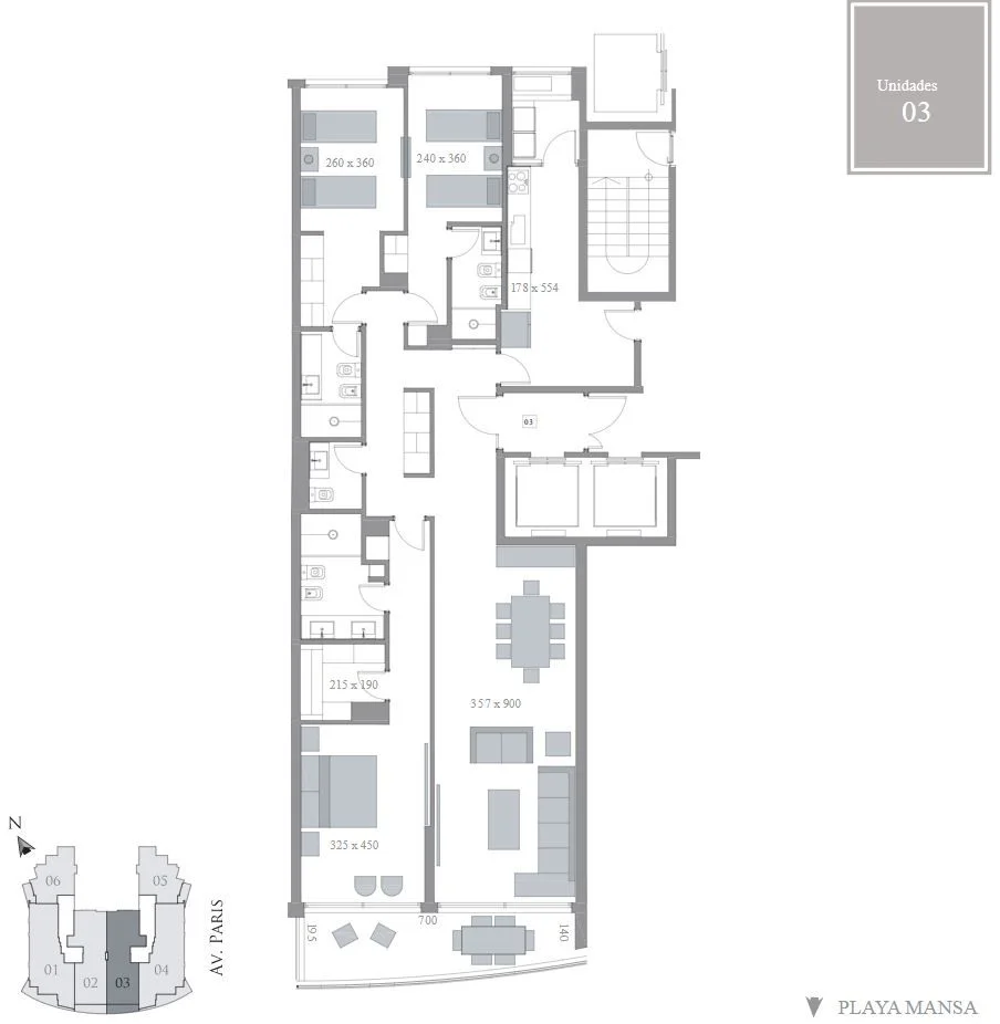 En Playa Mansa, parada 8, sobre la Rambla La Fachada curva sobre la Rambla se abre a la bahía, envolviendo los apartamentos  para un mejor aprovechamiento de las vistas a la Playa Mansa, la Isla Gorriti, el Puerto y Punta Ballena.