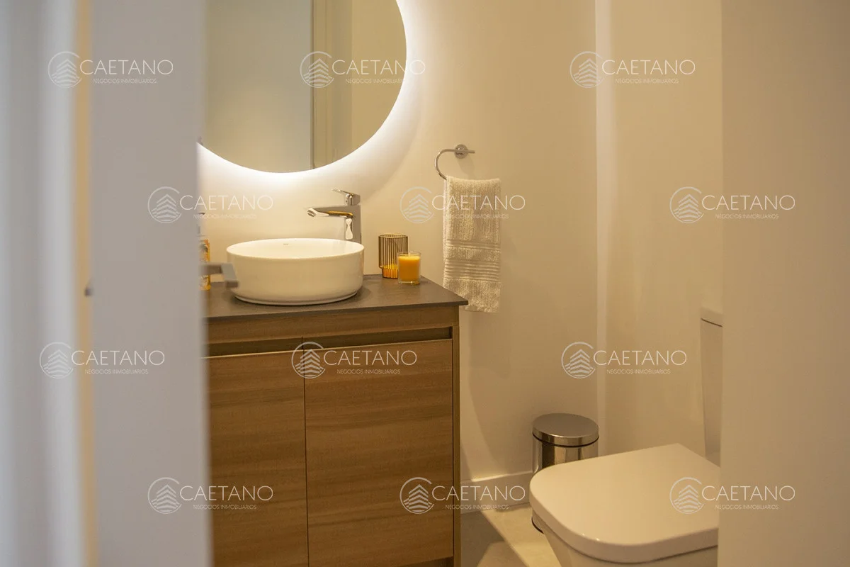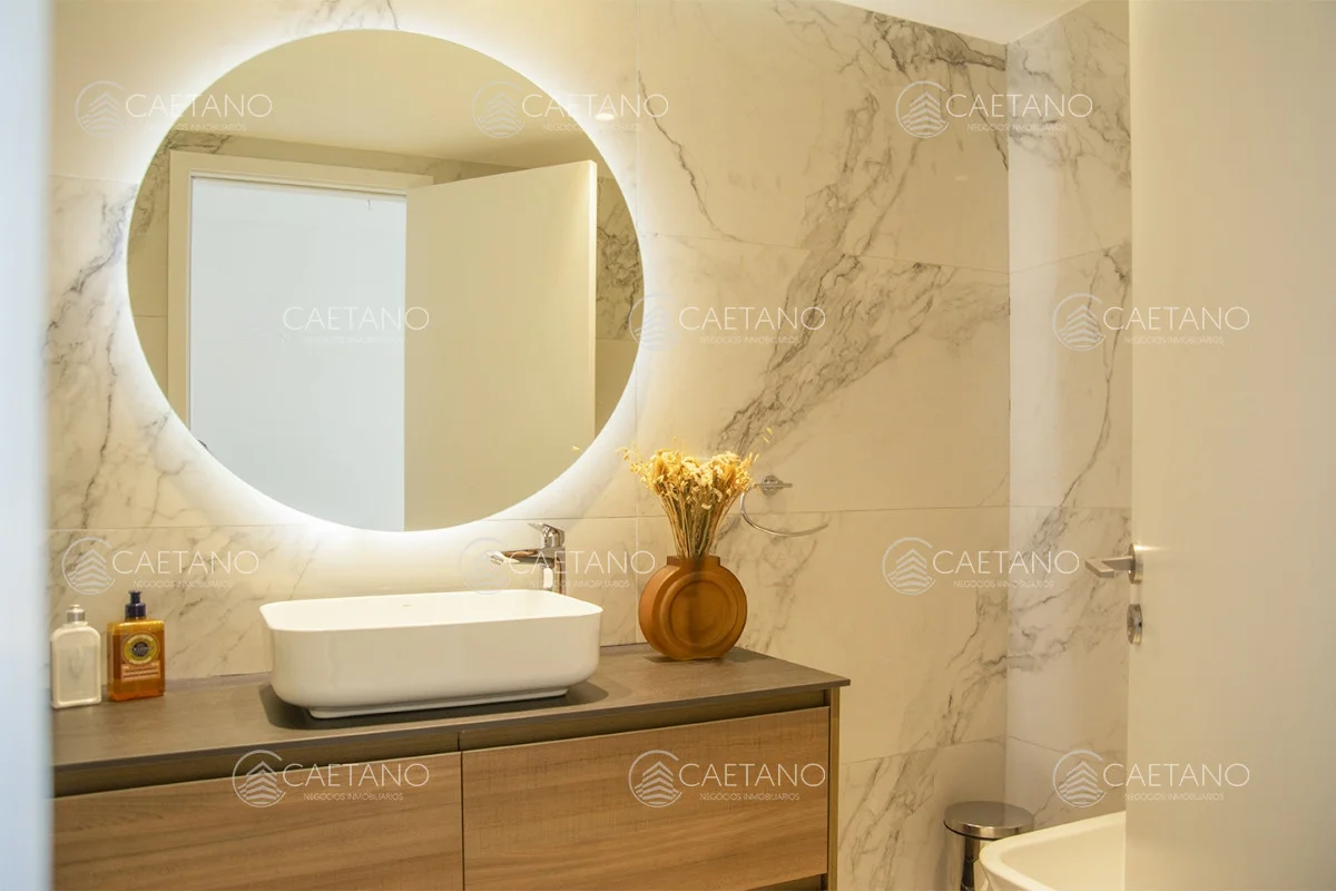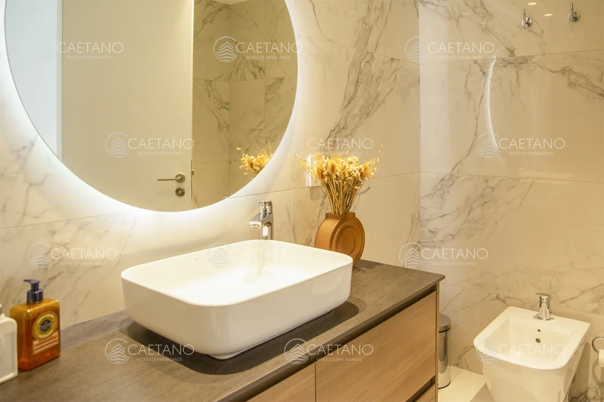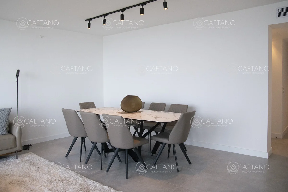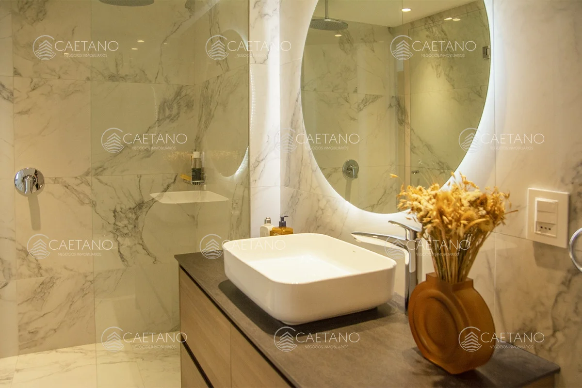 La distribución del departamento se caracteriza por un diseño moderno y funcional. Además de las suites, cuenta con una amplia sala de estar y comedor, perfecta para recibir a invitados o relajarse en un entorno elegante. La cocina está equipada con electrodomésticos de alta gama y cuenta con una isla central, ofreciendo un espacio ideal para los amantes de esta.