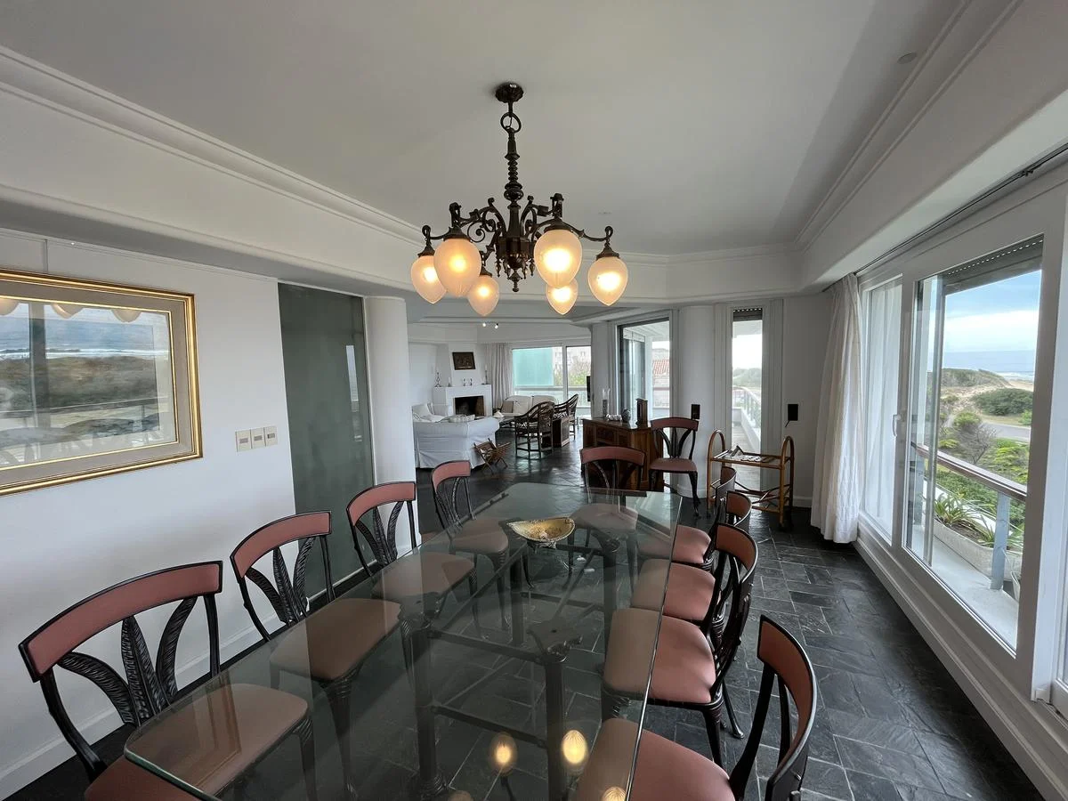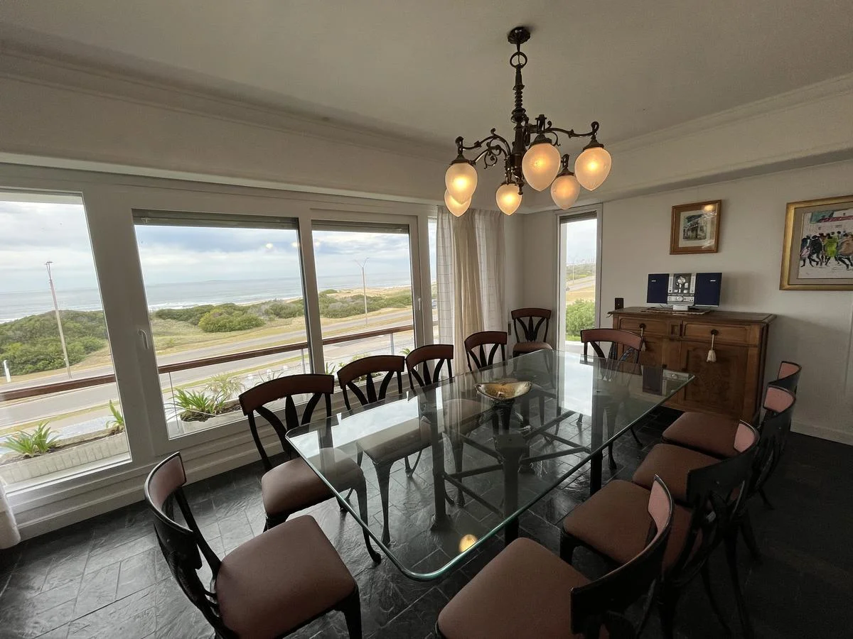 Living comedor con preciosa vista al mar que se abre a un balcón donde se encuentra el parrillero.