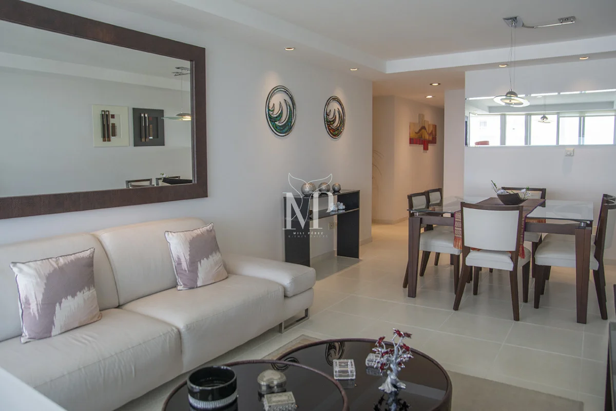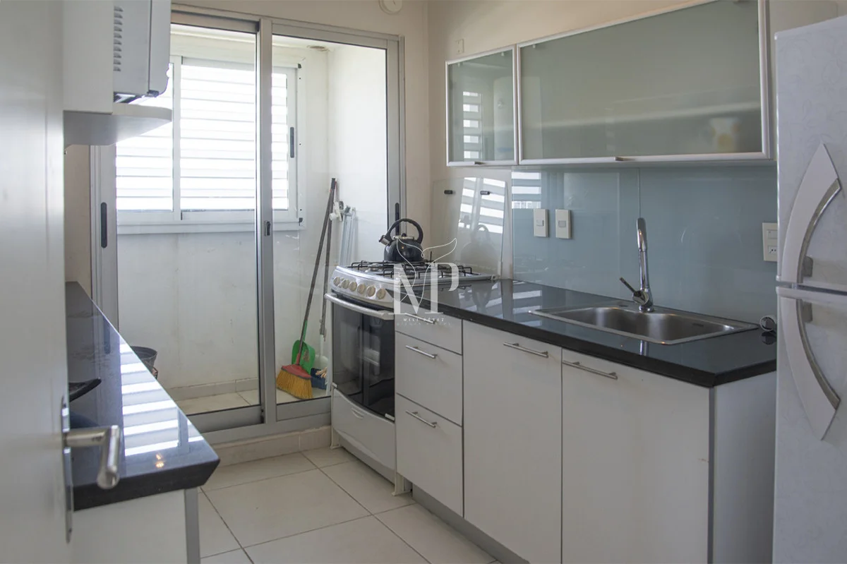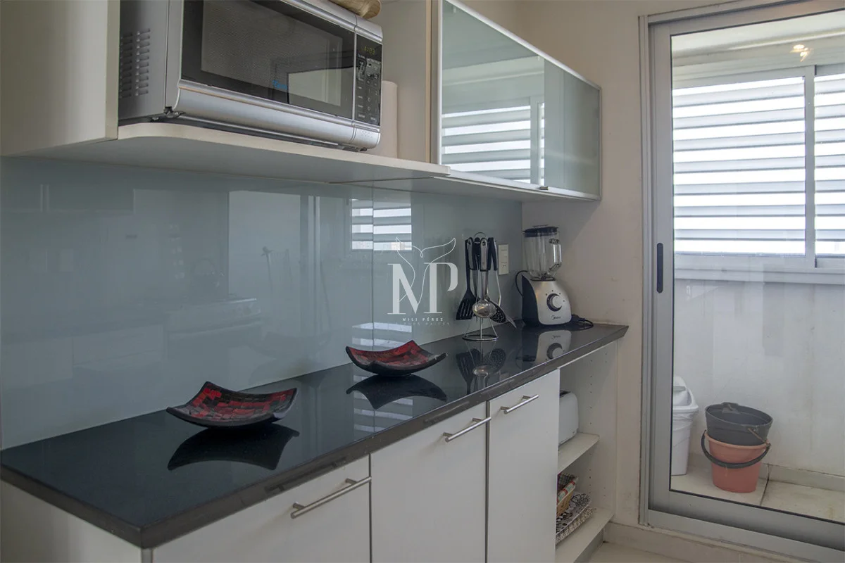 La cocina, definida y bien equipada, cuenta con electrodomésticos modernos, como cocina a gas, microondas, lavarropas, heladera con freezer, tostadora y cafetera. El área de estar se compone de un amplio living y comedor, conectados con un balcón espacioso que permite disfrutar del agradable entorno de la bahía.