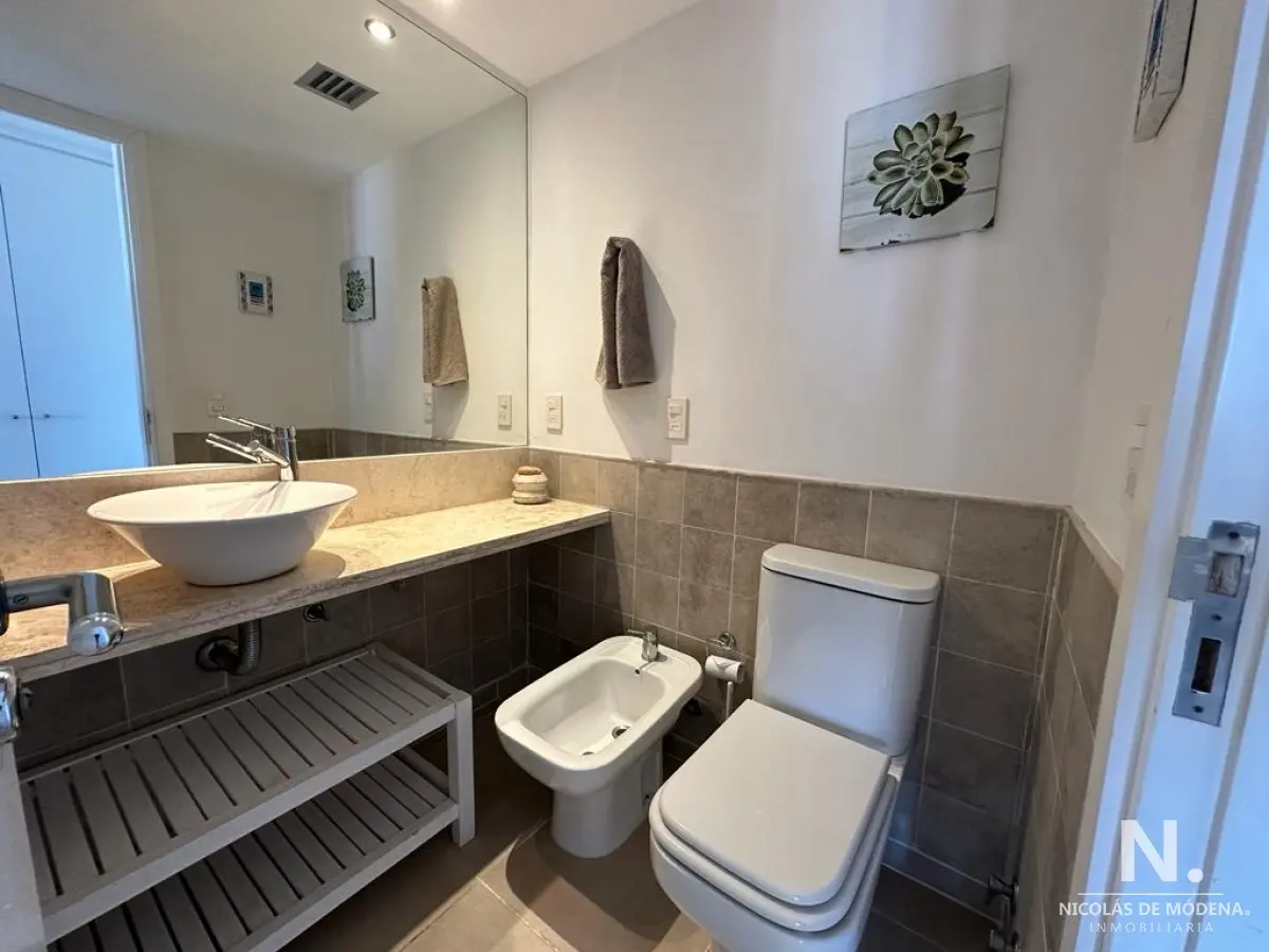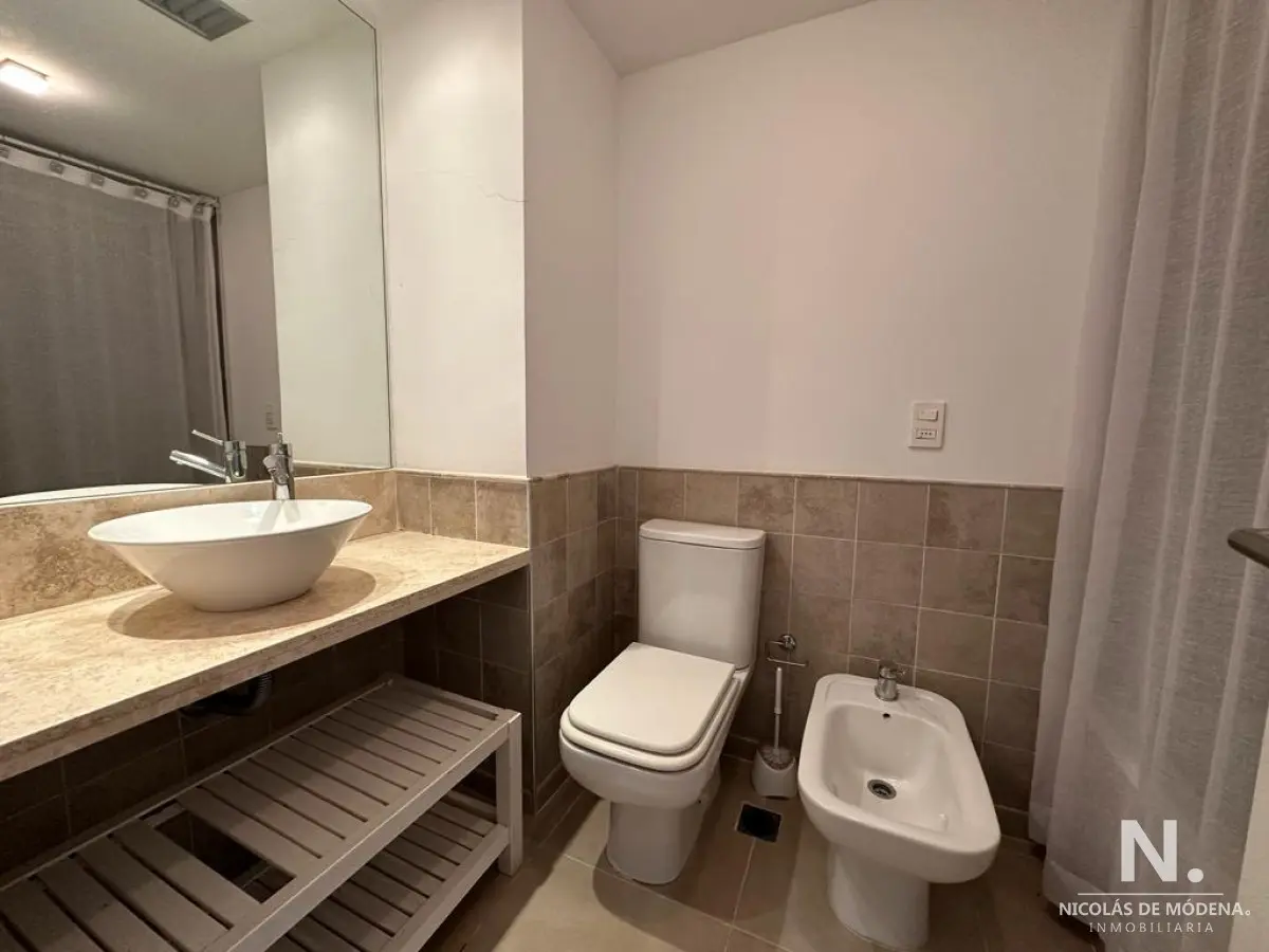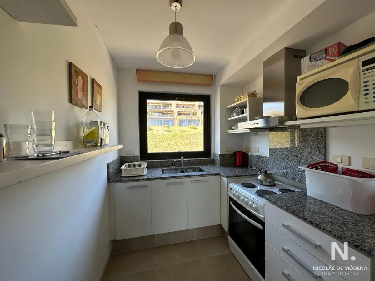 La cocina es de tipo cocina y el área de living comedor proporciona un espacio integrado para la convivencia. El equipamiento del apartamento incluye anafe, aire acondicionado, TV, placards en el dormitorio y en la cocina, y horno.