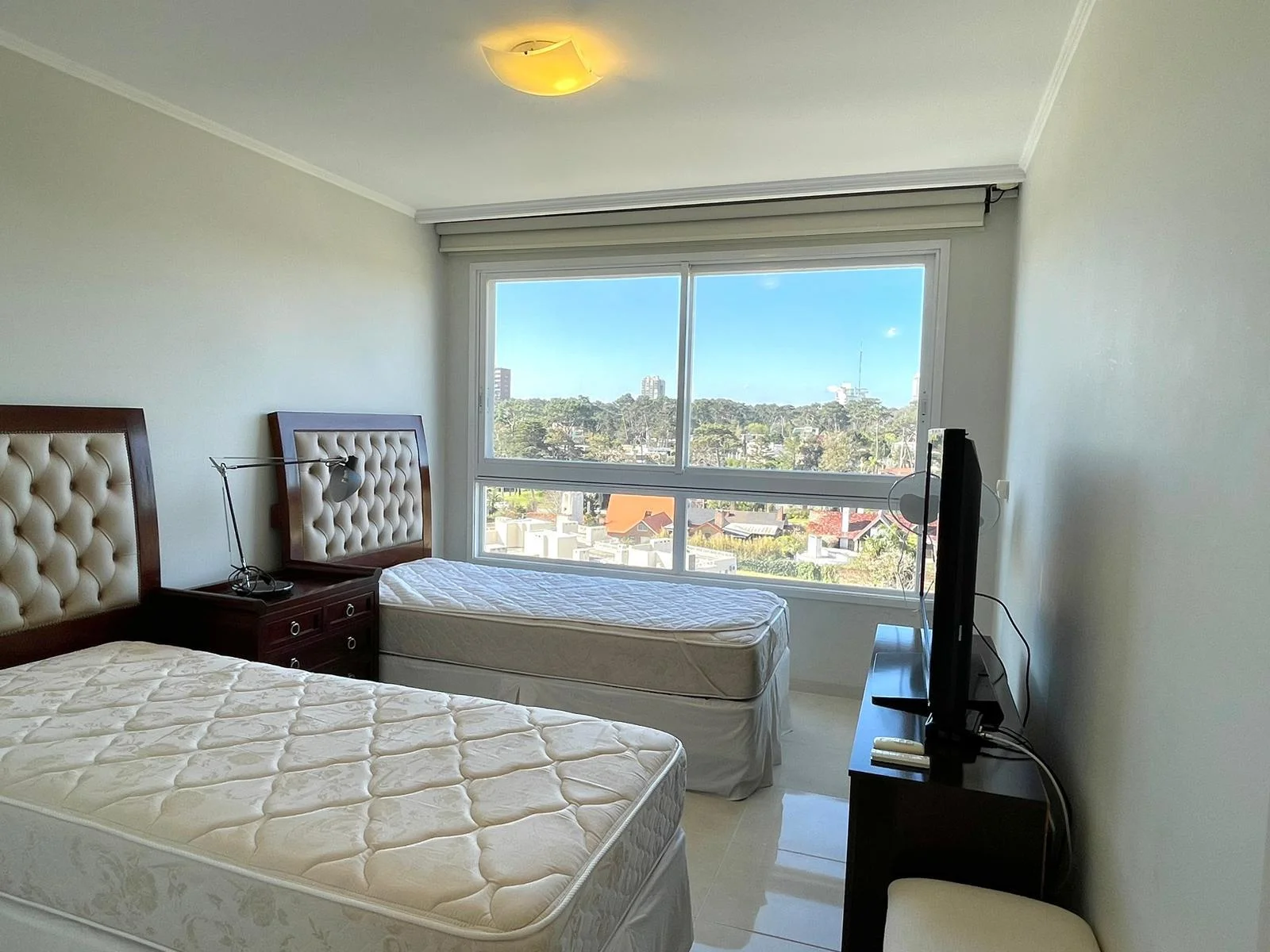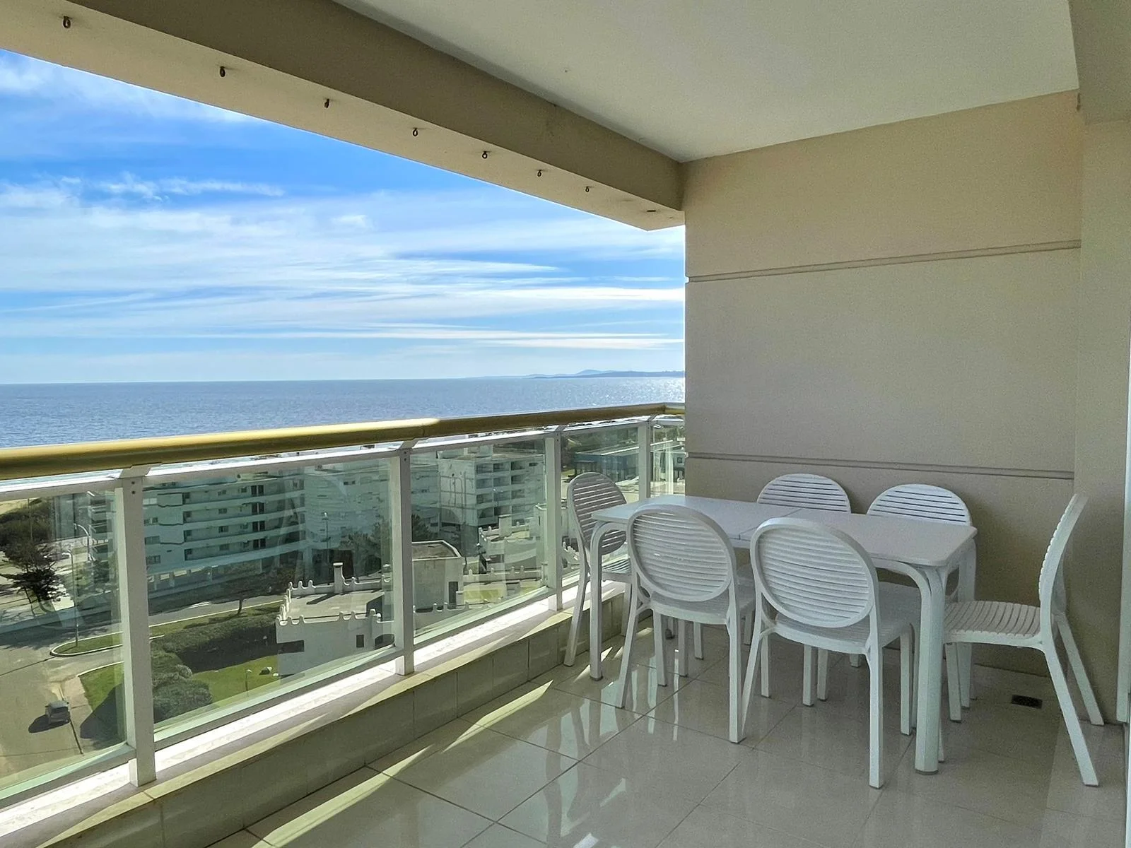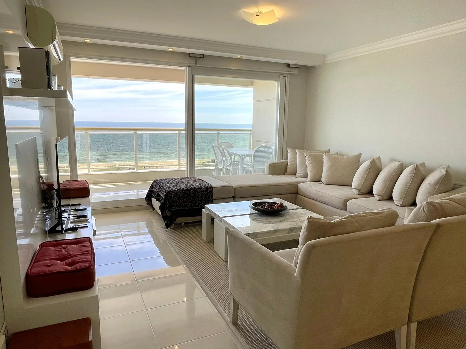 Living comedor con salida a una terraza amplia y vista a la Playa Mansa, Puerto y Península.