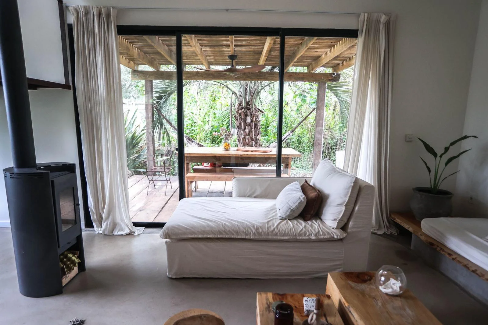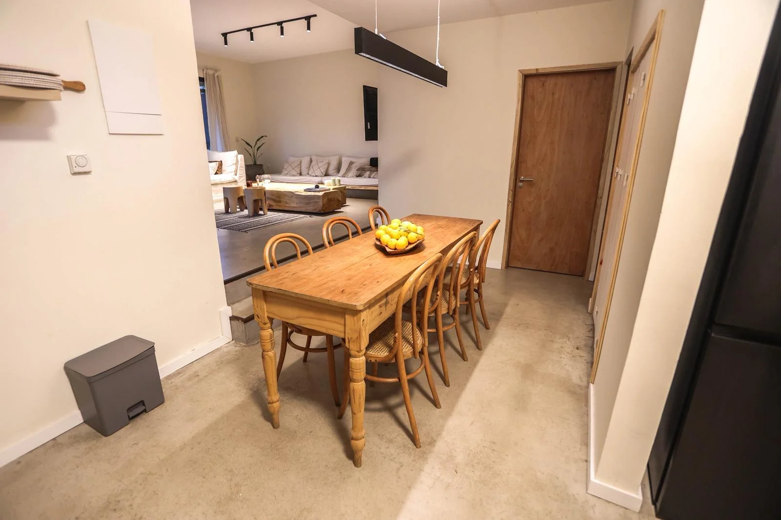 Spacious living and dining area with integrated kitchen, opening onto a terrace with a barbecue and outdoor table — perfect for enjoying time with friends.