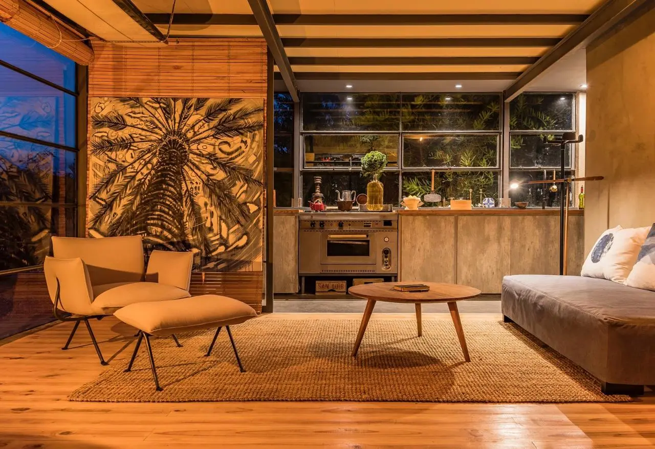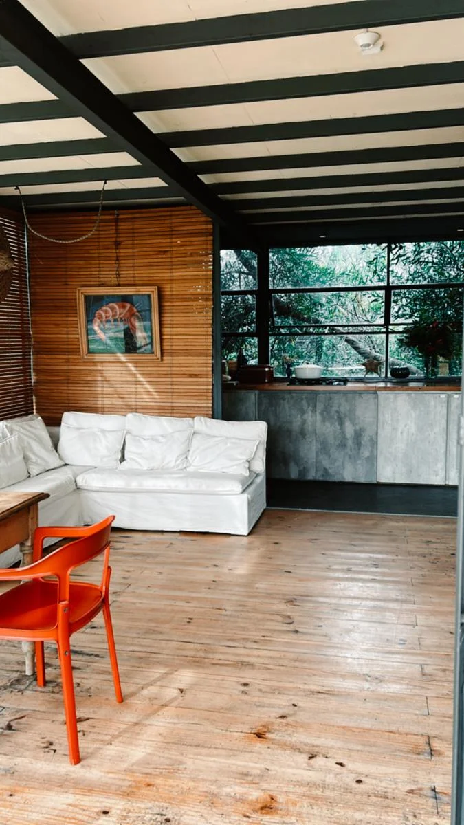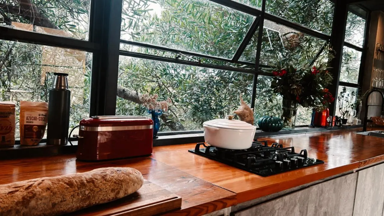 Cocina, living comedor con la chimenea, toilette y un comedor externo.