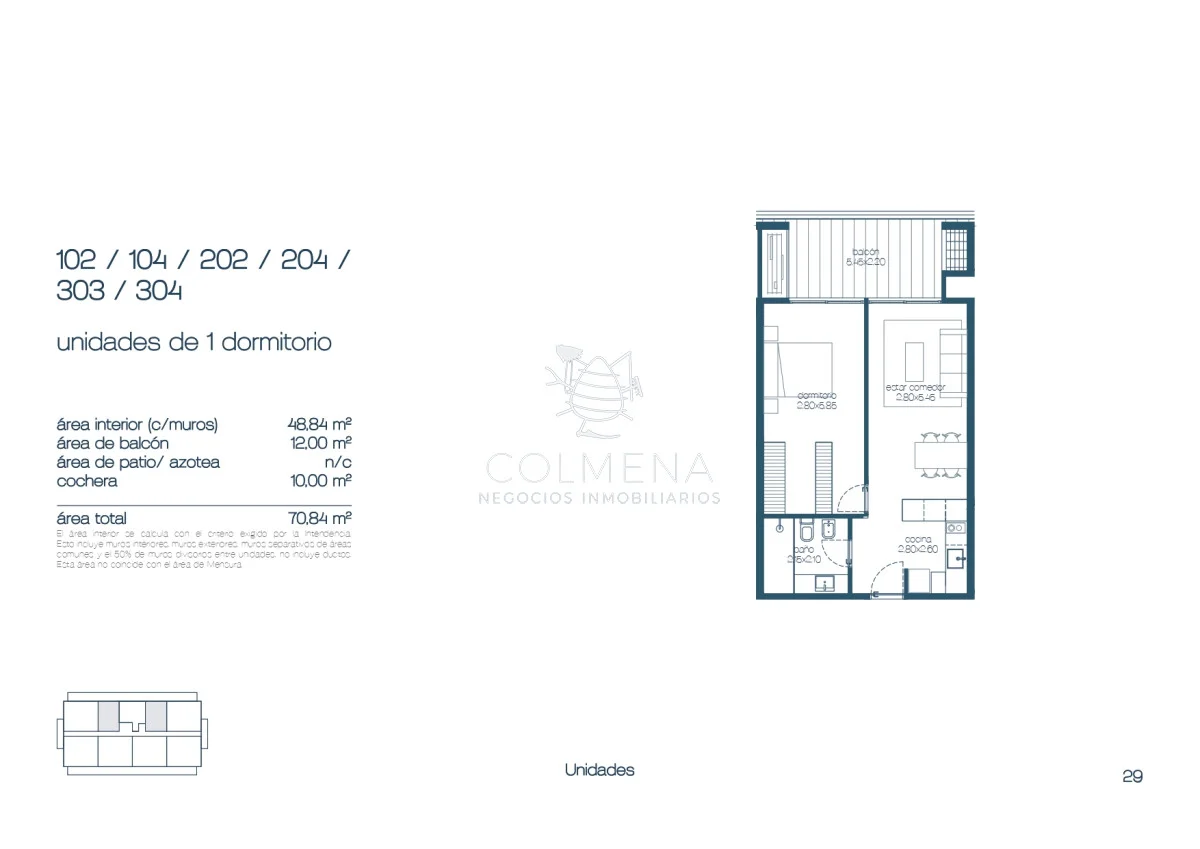 Este apartamento ejemplo es de un dormitorio, living comedor con cocina integrada, baño , terraza con parrillero, losa radiante y cochera.
