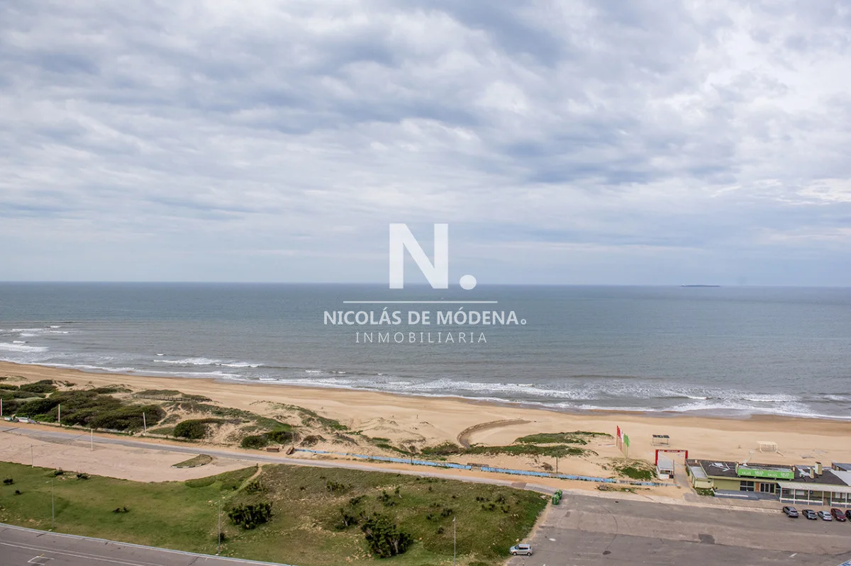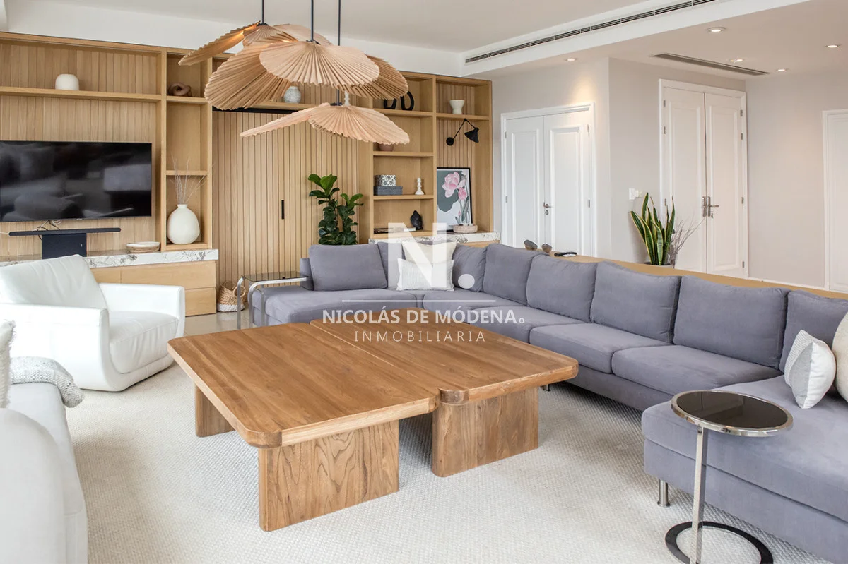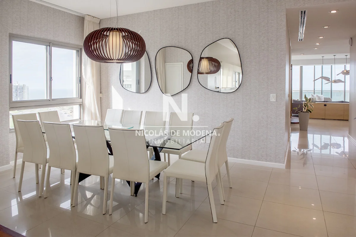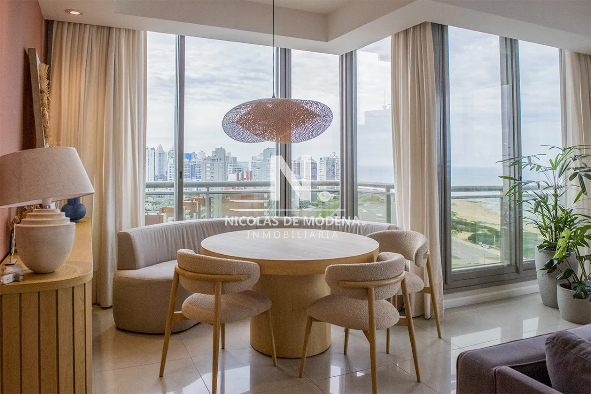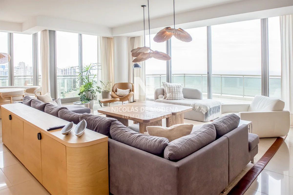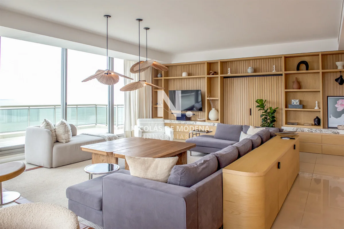 Un gran living comedor con vistas panorámicas a la Playa Brava, creando el escenario perfecto para el entretenimiento.