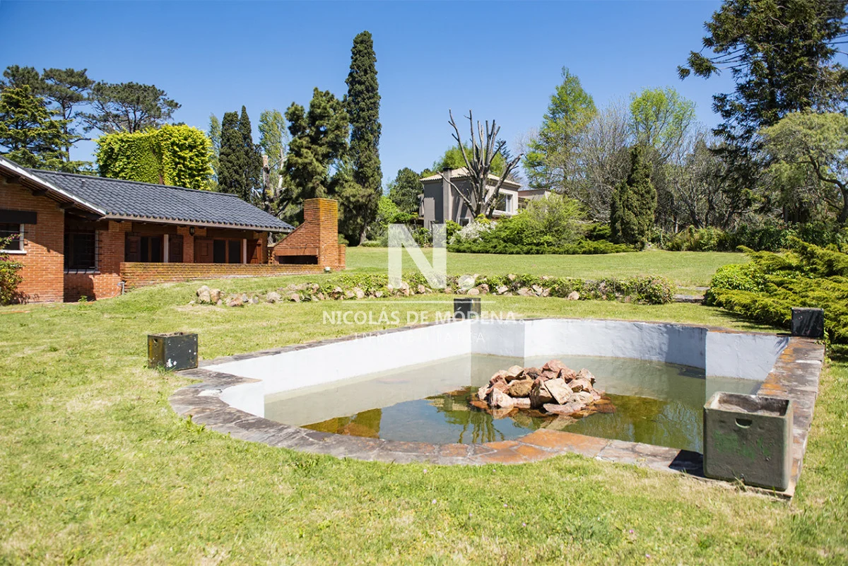El encanto de esta casa se extiende a sus áreas exteriores, que cuentan con una gran piscina, un pequeño parrillero, y un hermoso estanque (pond) rodeado de vegetación. Un paseo que conduce a un bosque cercano añade un toque de serenidad y privacidad, ofreciendo un refugio perfecto para disfrutar de la naturaleza y relajarse.