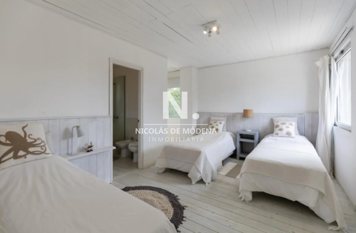 El acceso a la segunda planta se realiza mediante una escalera interna que conduce a un playroom con TV, creando un espacio versátil y luminoso ideal para actividades lúdicas o para establecer un ambiente de relax familiar. En este nivel se encuentra la suite principal, que destaca por su amplio vestidor y una espectacular vista al mar, proporcionando un refugio íntimo y sereno. Los dormitorios adicionales están configurados de forma que dos de ellos disponen de camas individuales, mientras que el tercer se ofrece con tres camas, brindando así una generosa capacidad de alojamiento y flexibilidad para adaptarse a diversas necesidades.