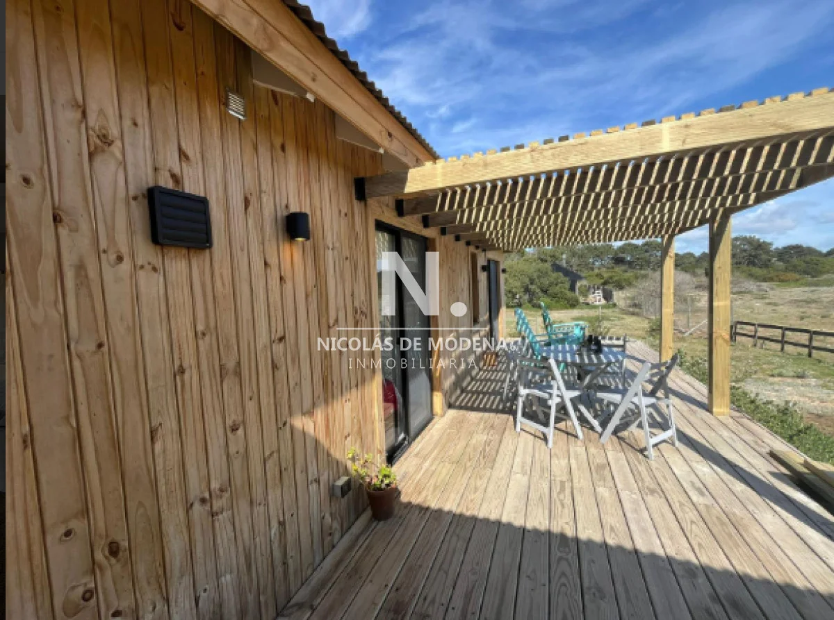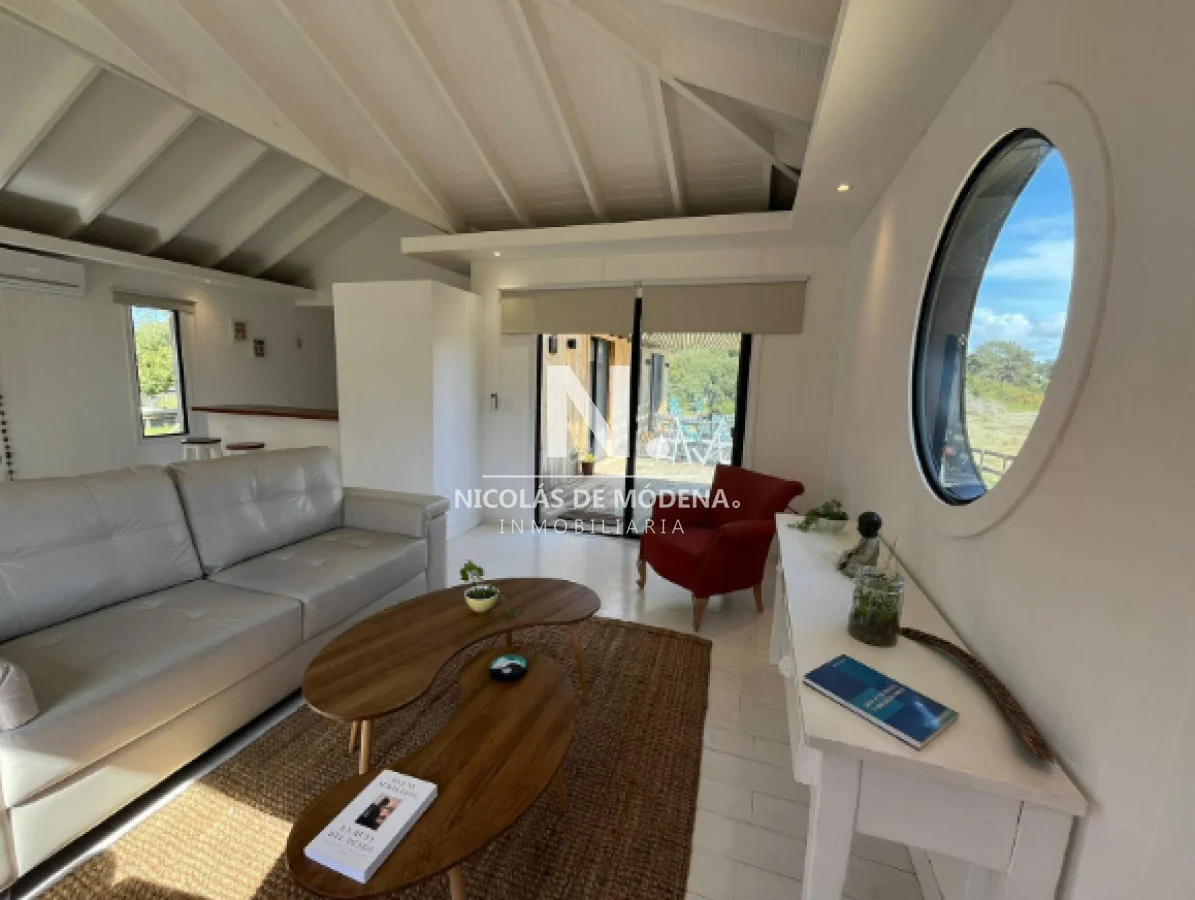 La casa principal cuenta con dos dormitorios y un baño, proporcionando un espacio acogedor y funcional. El diseño interior se caracteriza por espacios luminosos y bien distribuidos, creando un ambiente agradable para la convivencia. La cocina, bien equipada, se integra al living comedor, facilitando la interacción entre los habitantes.