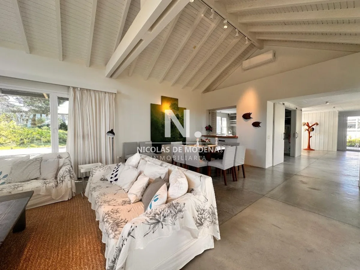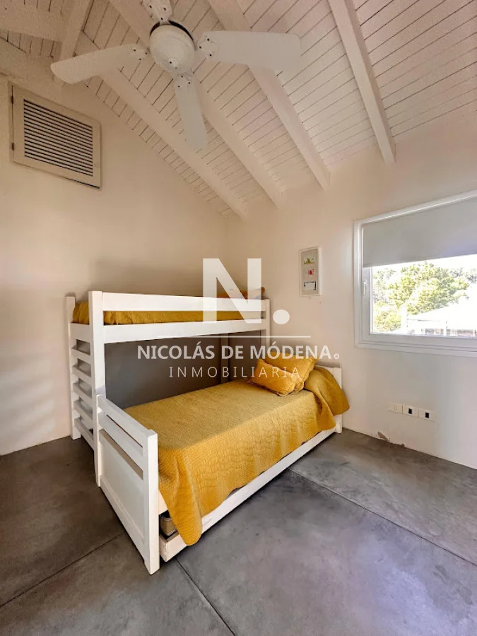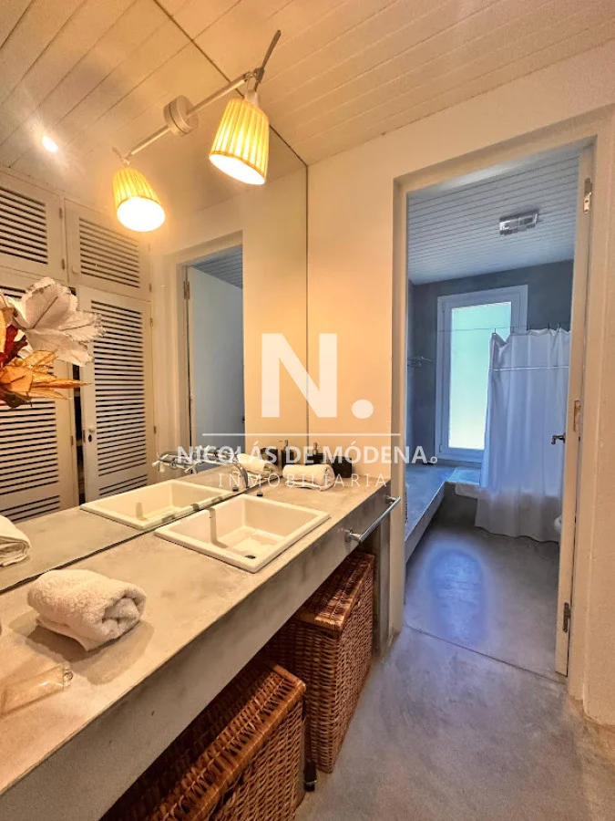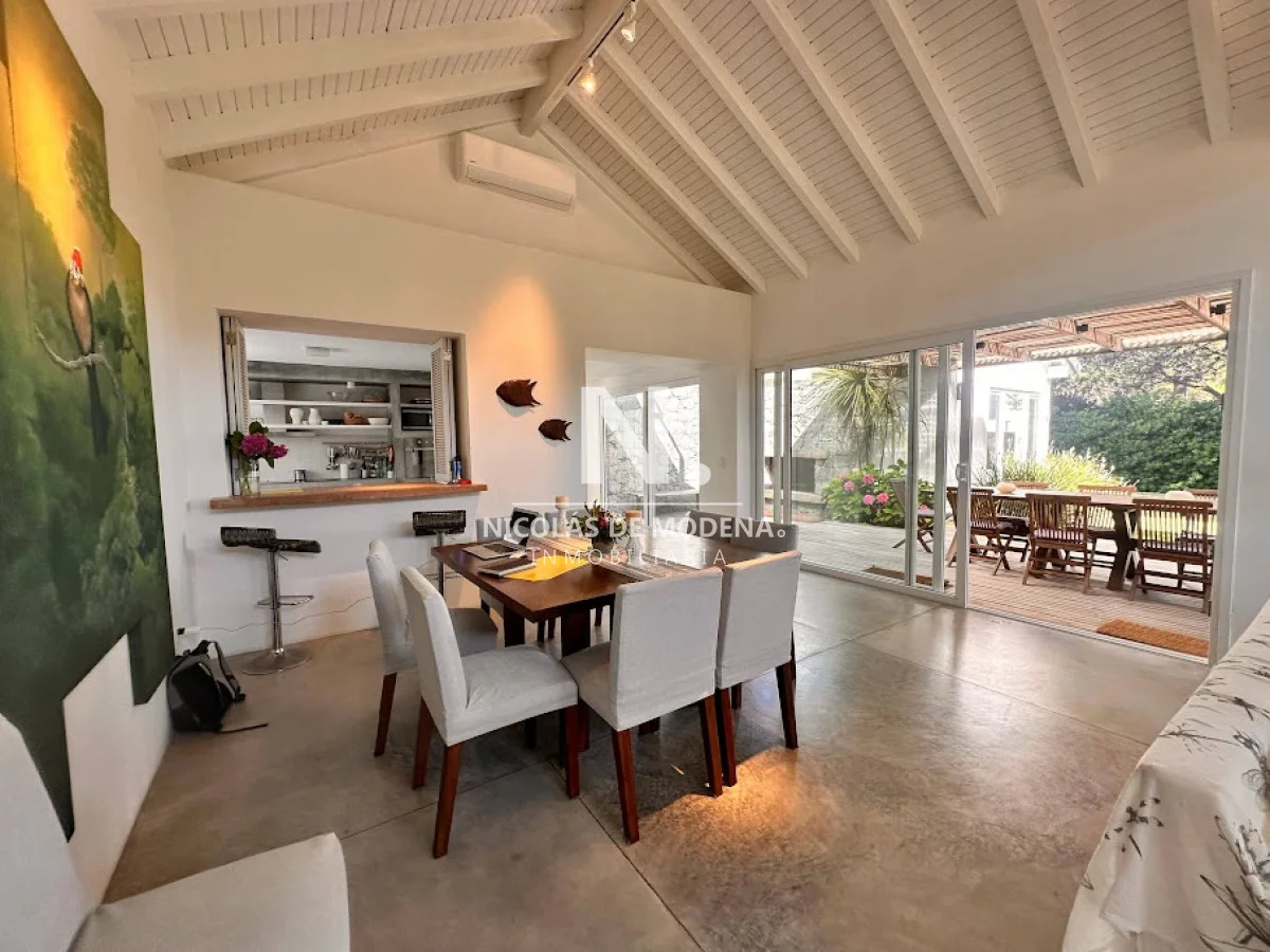 La propiedad cuenta con 4 dormitorios en suite y 4 baños completos, brindando capacidad para 8 personas en ambientes amplios y funcionales. La cocina, completamente equipada con anafe, horno, microondas, heladera con freezer, campana extractora y placares, se integra de forma práctica al comedor y al cómodo living, generando un espacio social fluido ideal para compartir en familia o con amigos. El living comedor ofrece un ambiente cálido y luminoso, con vistas verdes y excelente ventilación.