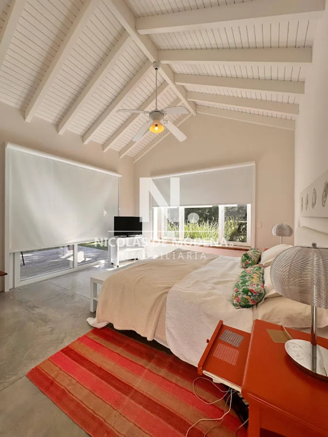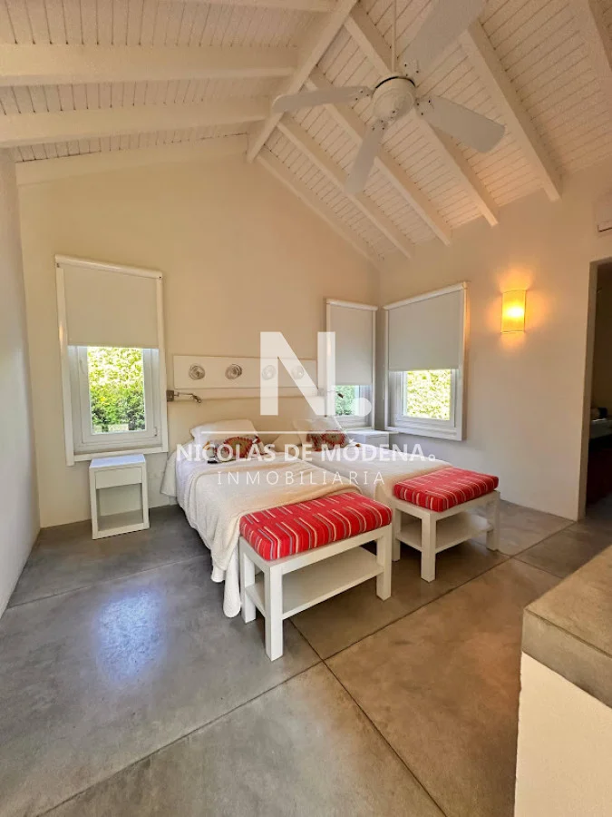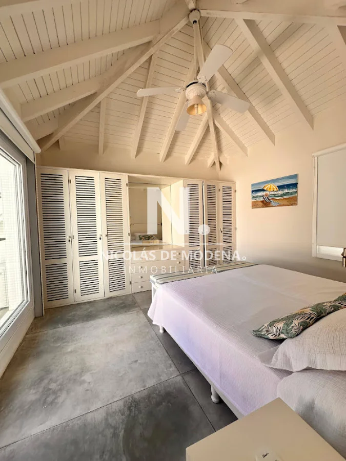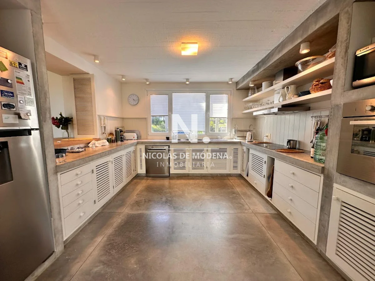 La propiedad cuenta con 4 dormitorios en suite y 4 baños completos, brindando capacidad para 8 personas en ambientes amplios y funcionales. La cocina, completamente equipada con anafe, horno, microondas, heladera con freezer, campana extractora y placares, se integra de forma práctica al comedor y al cómodo living, generando un espacio social fluido ideal para compartir en familia o con amigos. El living comedor ofrece un ambiente cálido y luminoso, con vistas verdes y excelente ventilación.