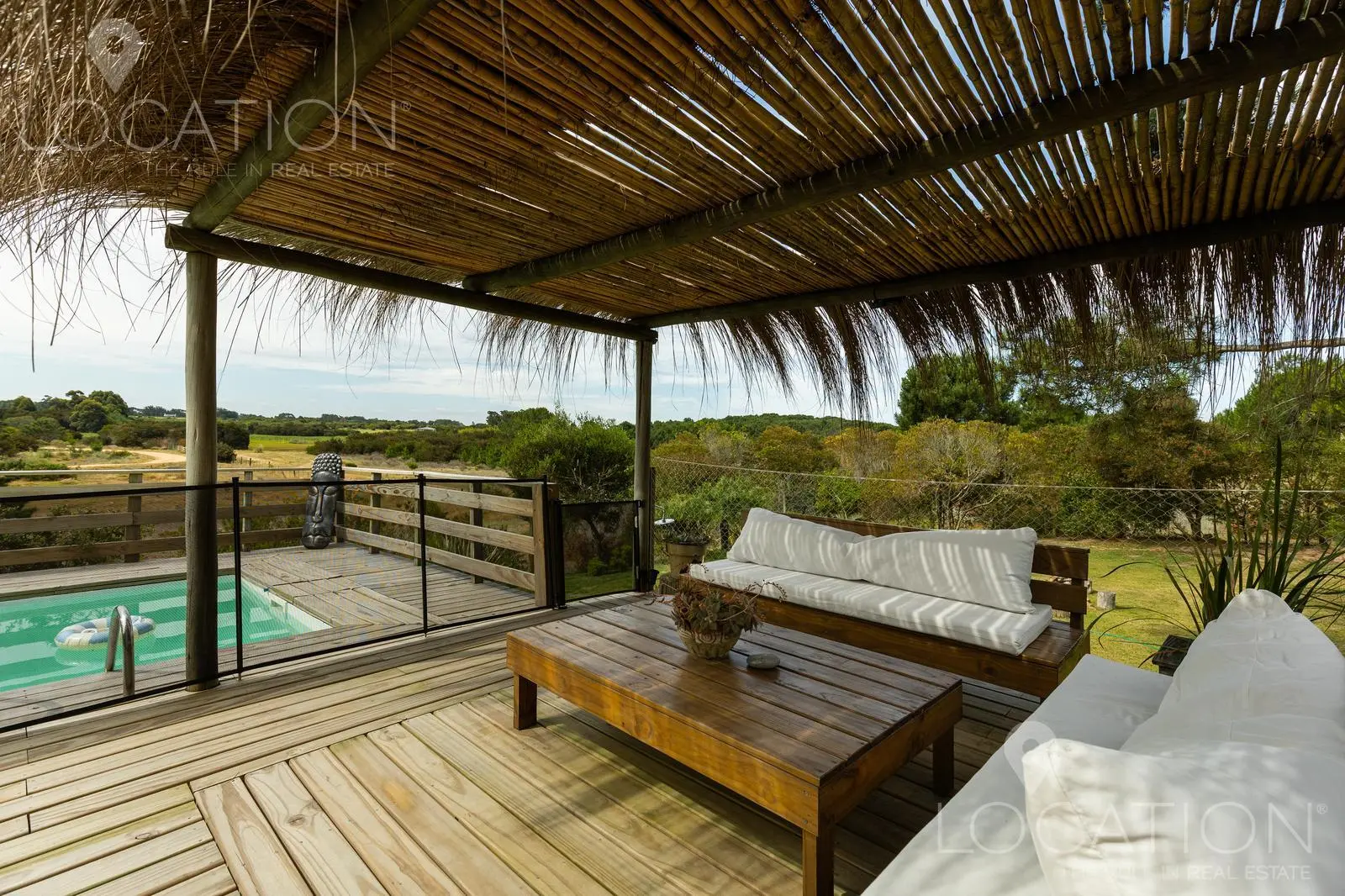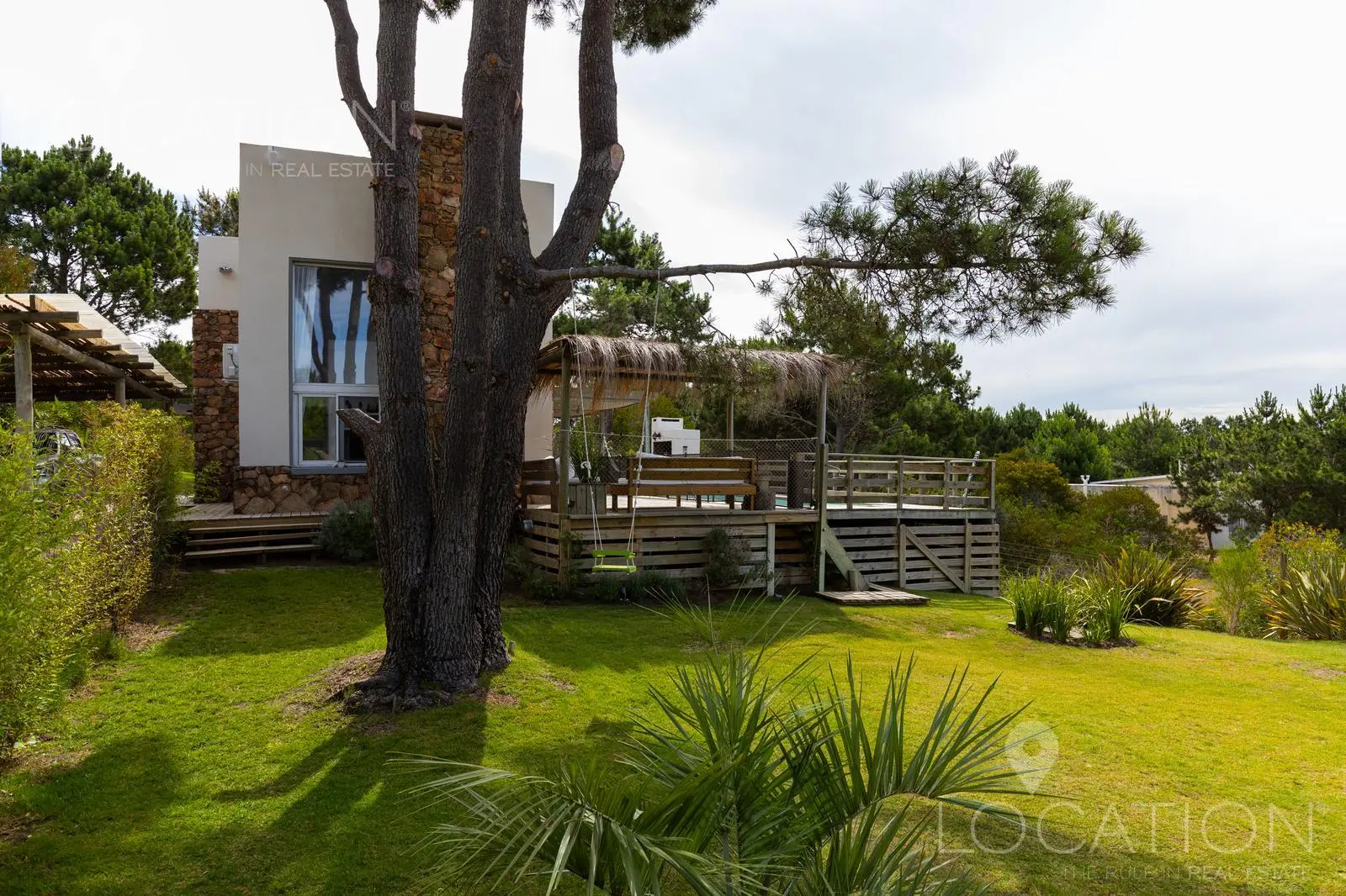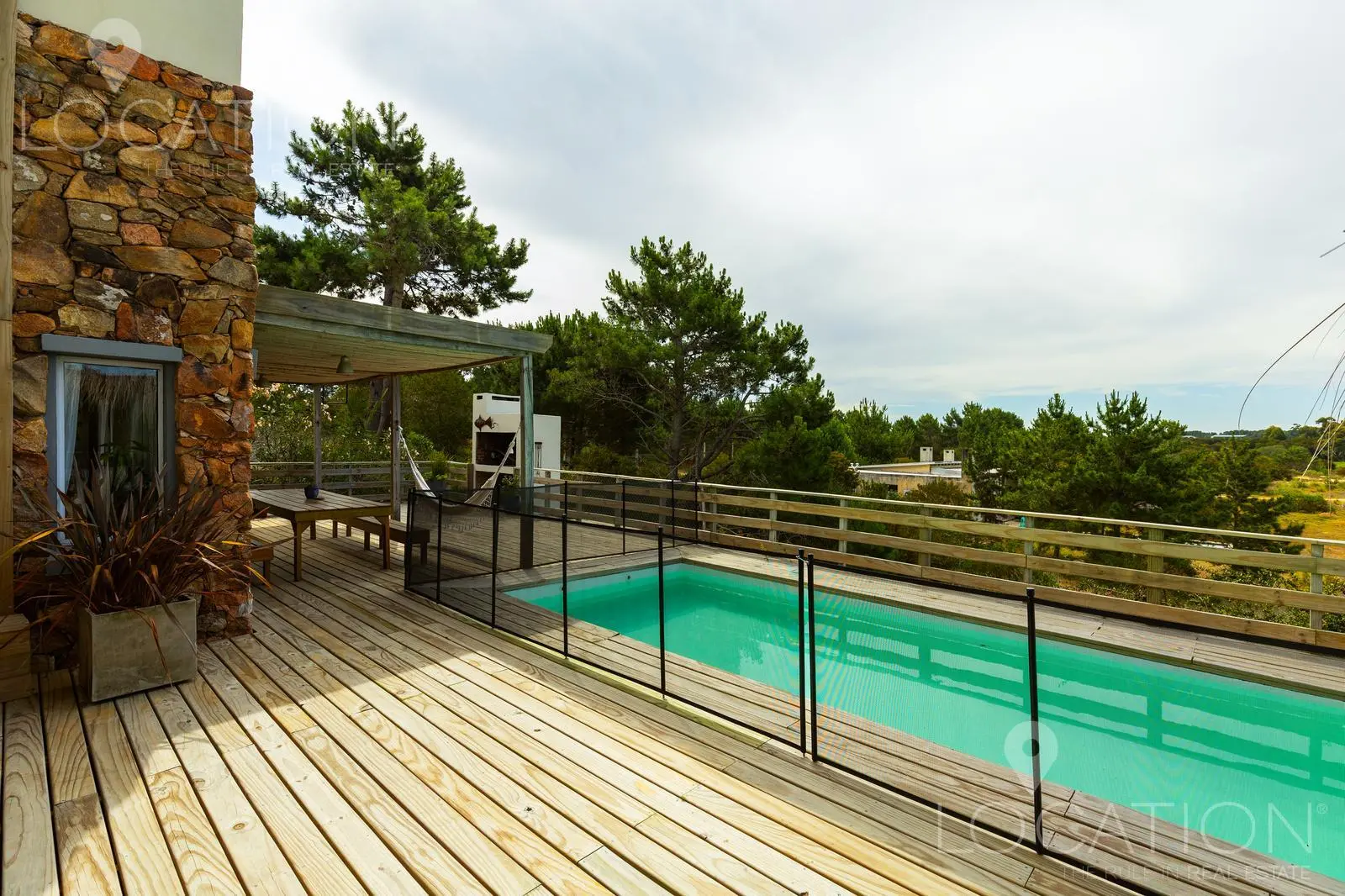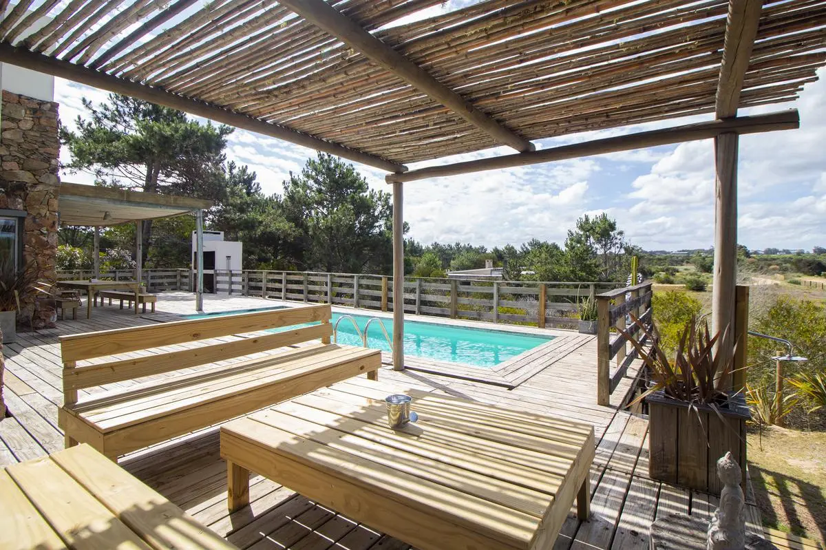 El exterior sin dudas es uno de los puntos más fuertes, por un lado la vegetación de árboles autóctonos le brinda sombra en algunos sectores y a su vez un gran deck con parrillero y pérgola que cubre una mesa de comedor, acompañan a la piscina. Desde este sector de la casa, se puede contemplar la muy linda vista a las chacras y lagos cercanos.