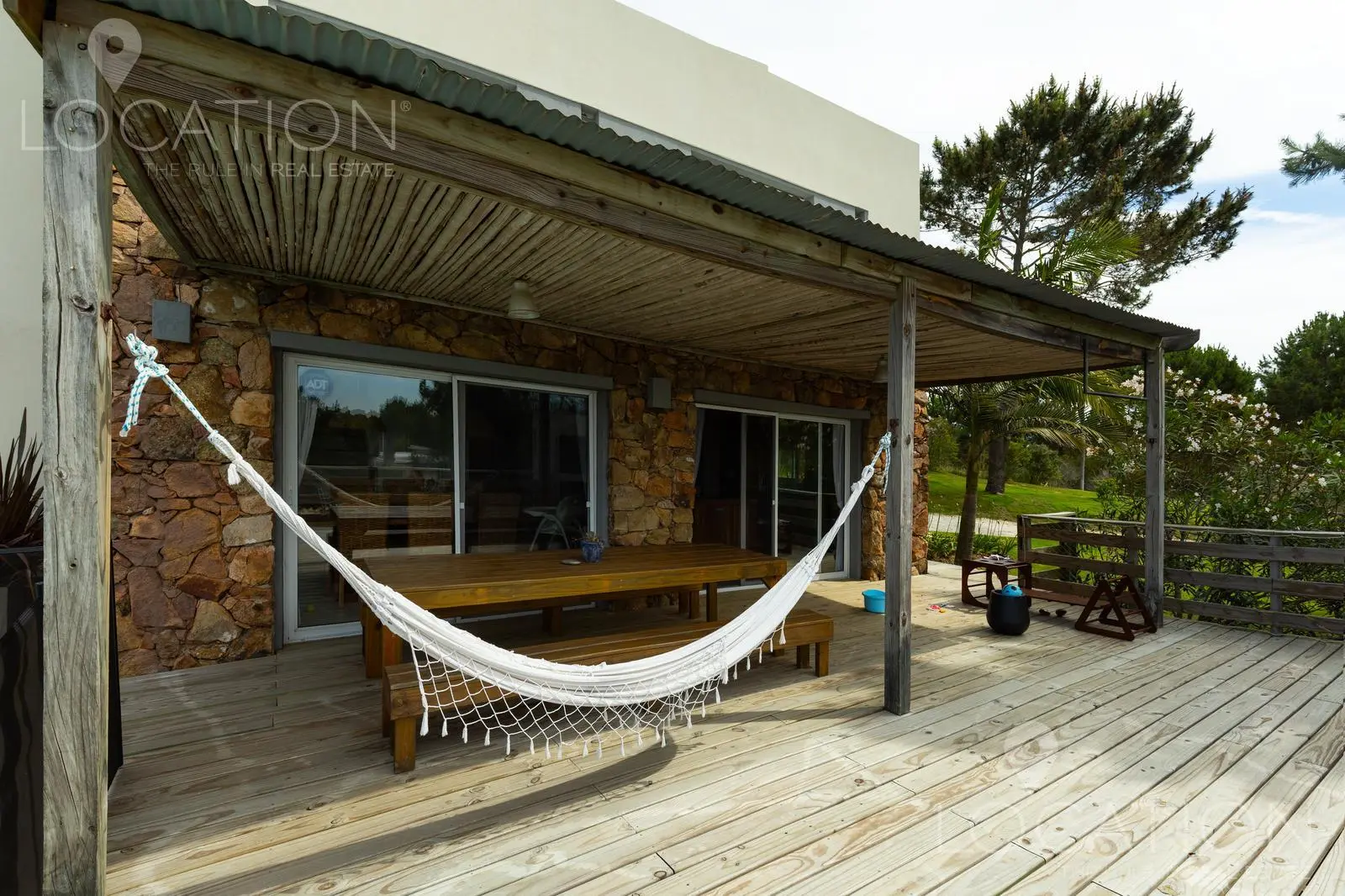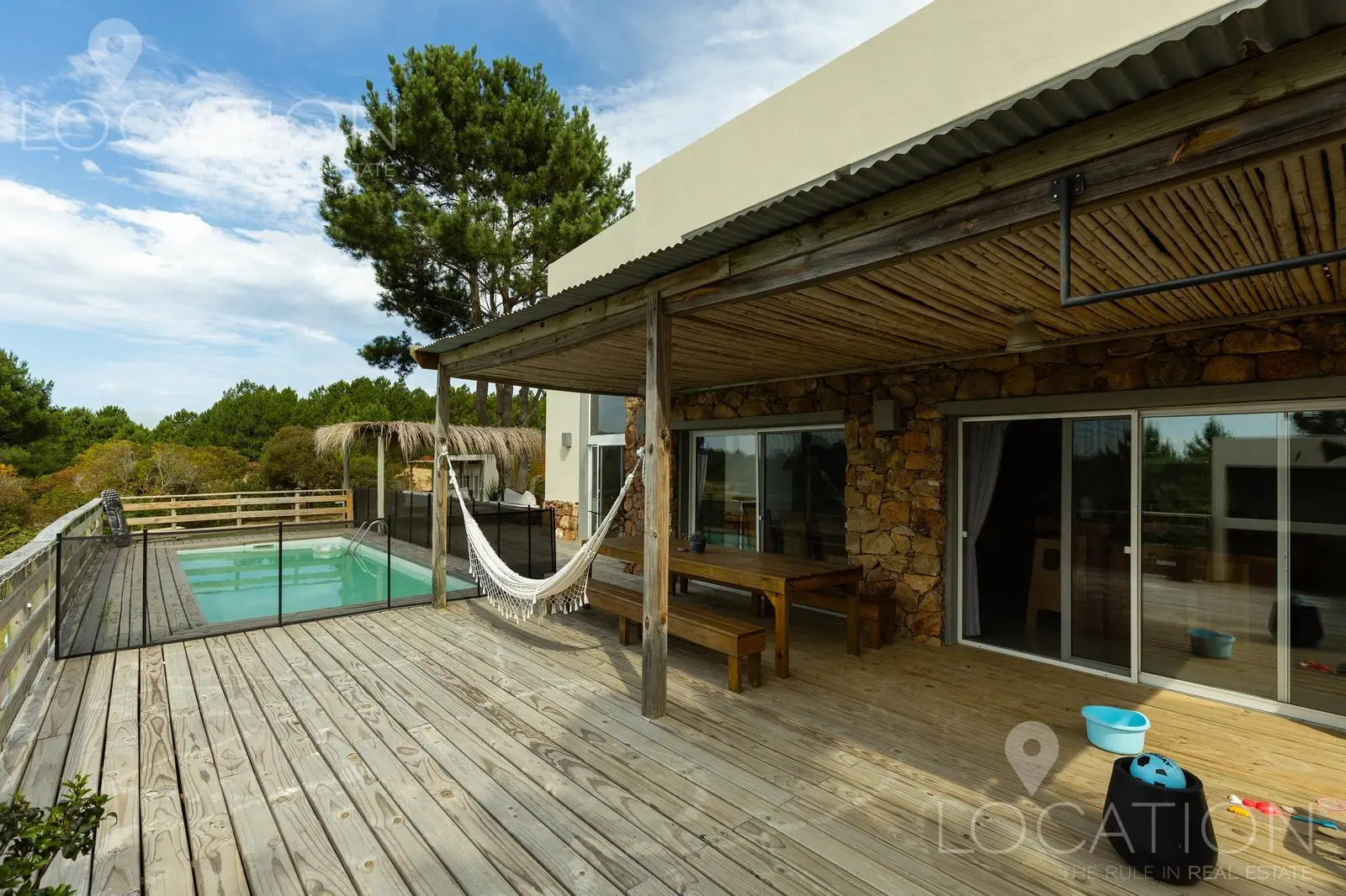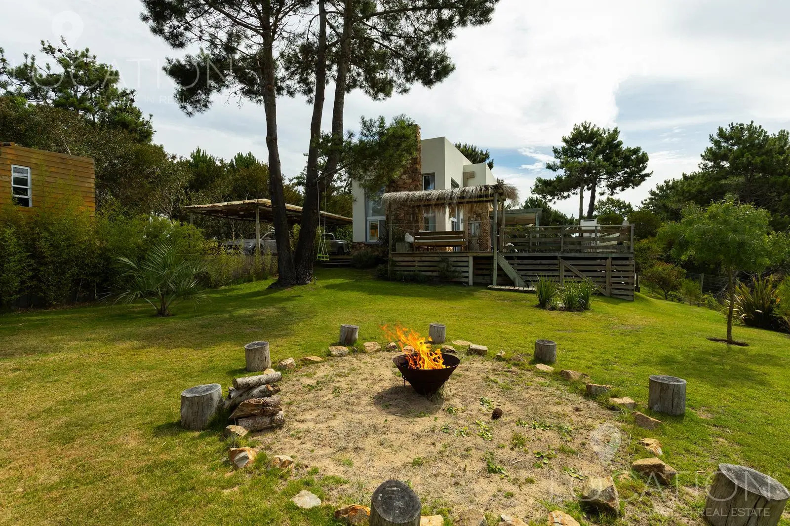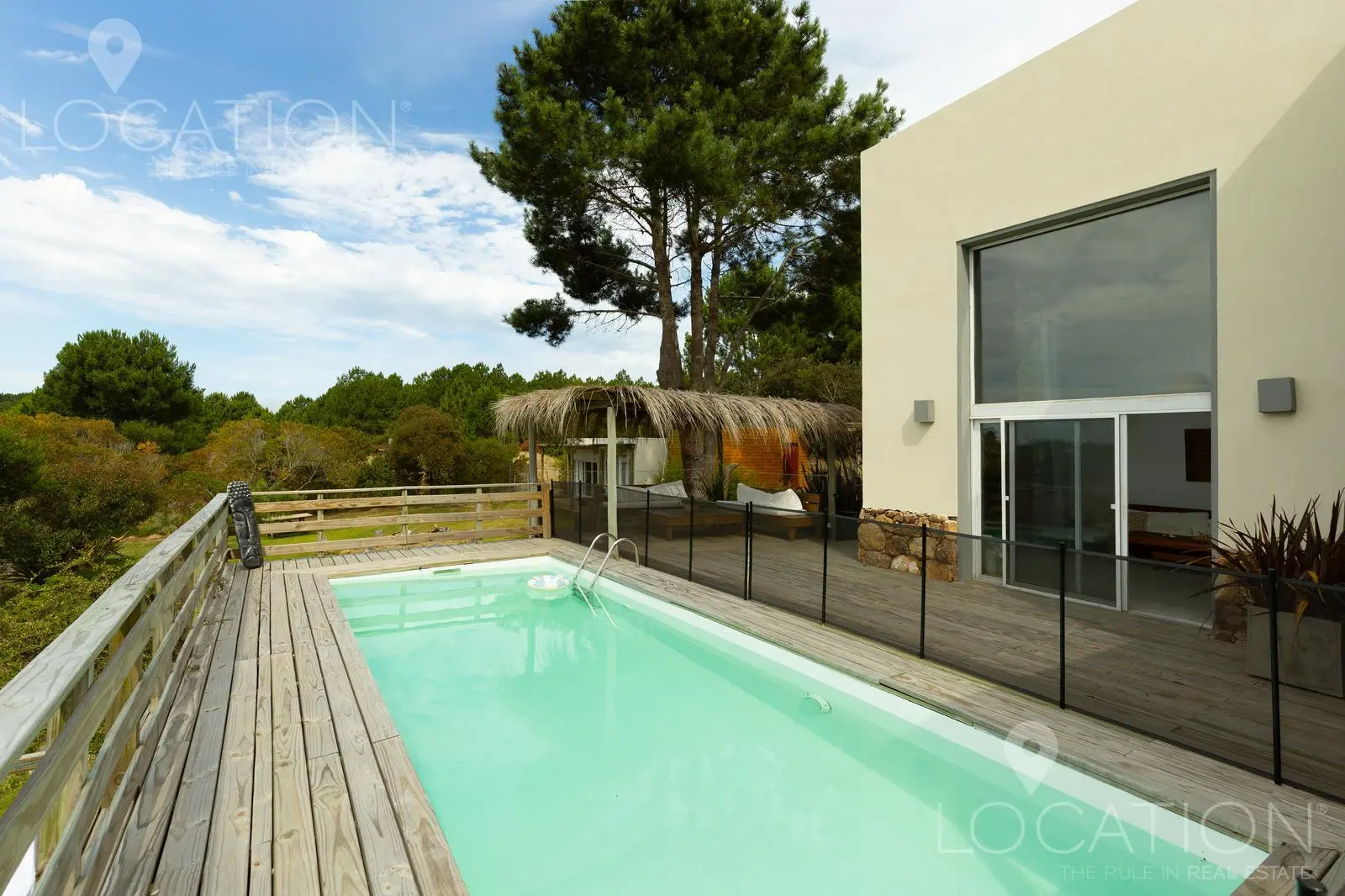 El exterior sin dudas es uno de los puntos más fuertes, por un lado la vegetación de árboles autóctonos le brinda sombra en algunos sectores y a su vez un gran deck con parrillero y pérgola que cubre una mesa de comedor, acompañan a la piscina. Desde este sector de la casa, se puede contemplar la muy linda vista a las chacras y lagos cercanos.