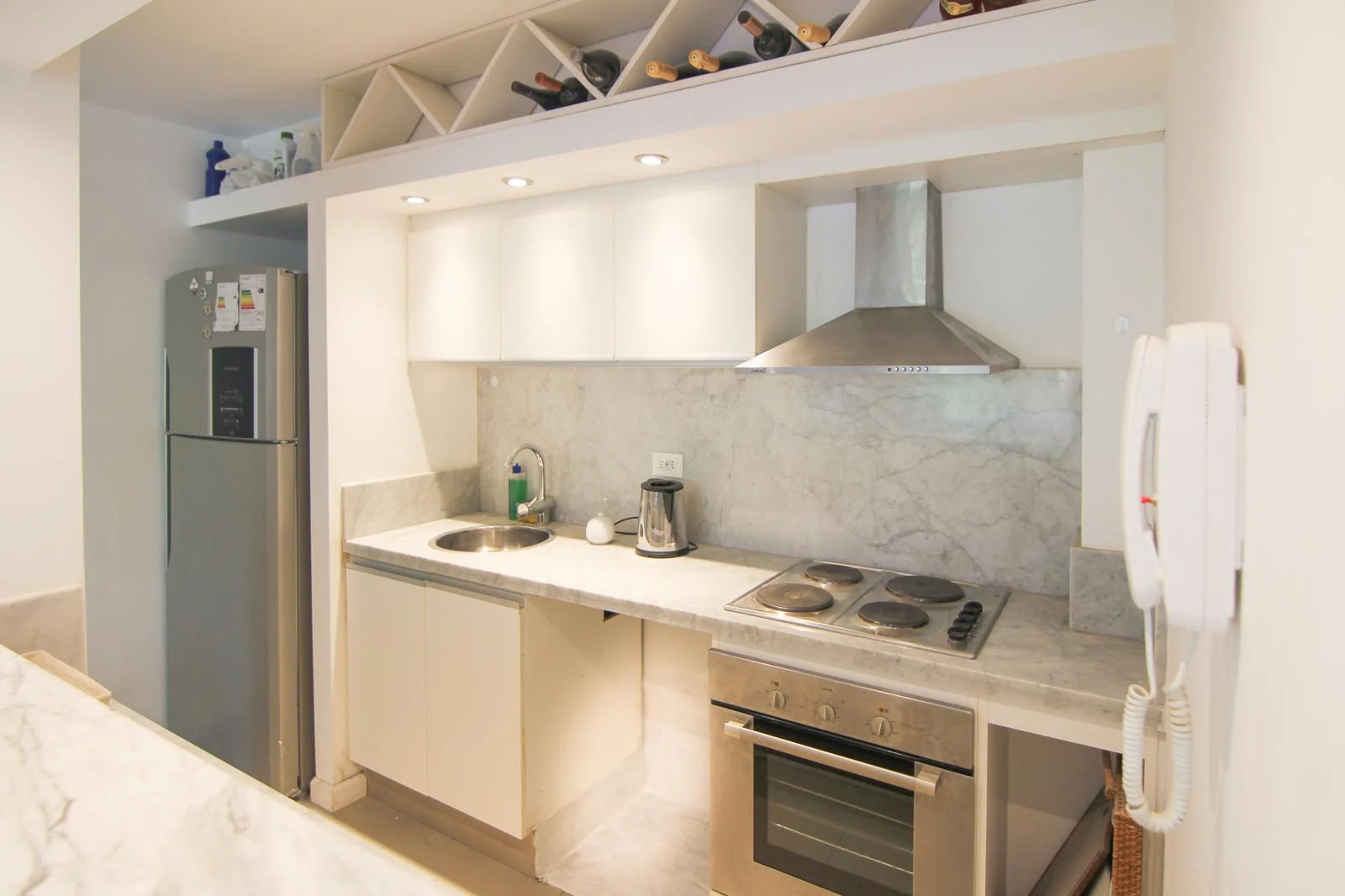 Living comedor con cocina integrada y salida a balcon con parrilla privada.