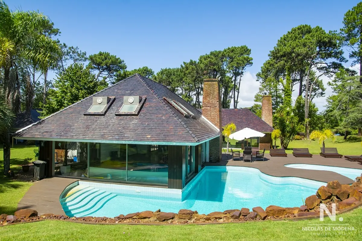 Piscina cerrada con comedor con estufa a leña y sala de estar.