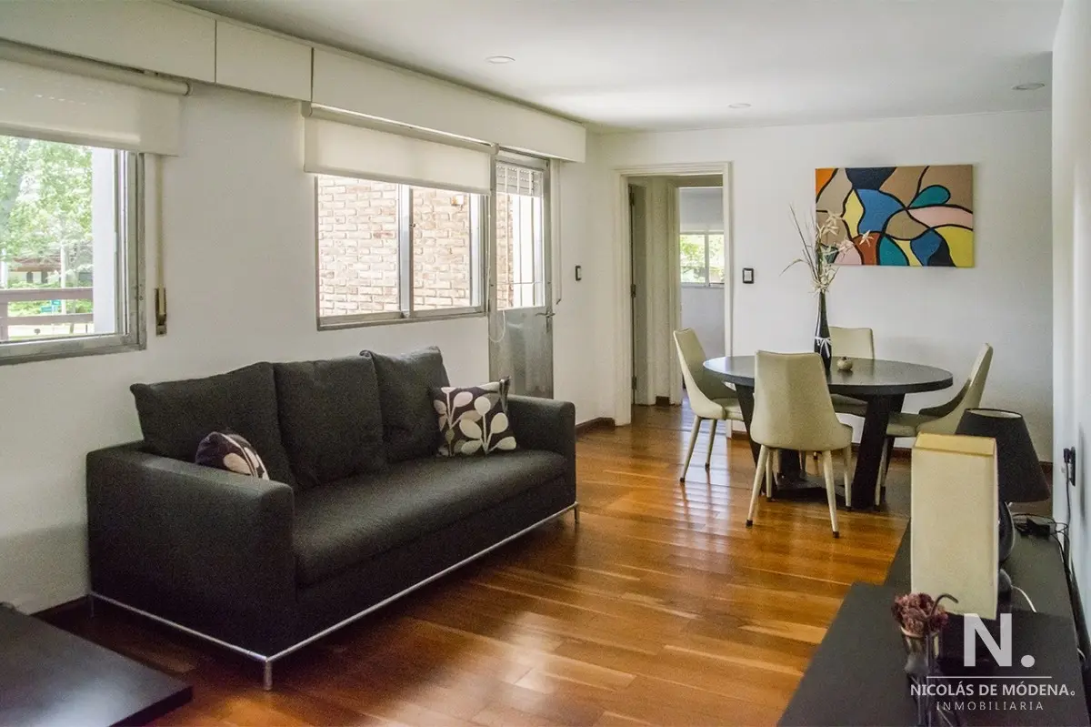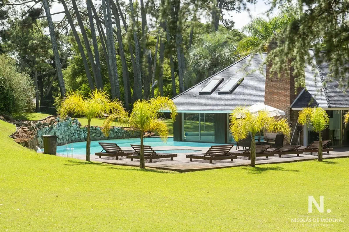 Hermoso jardin parquizado con piscina abierta con deck, pergola.